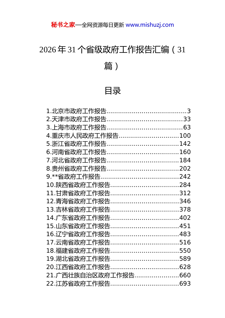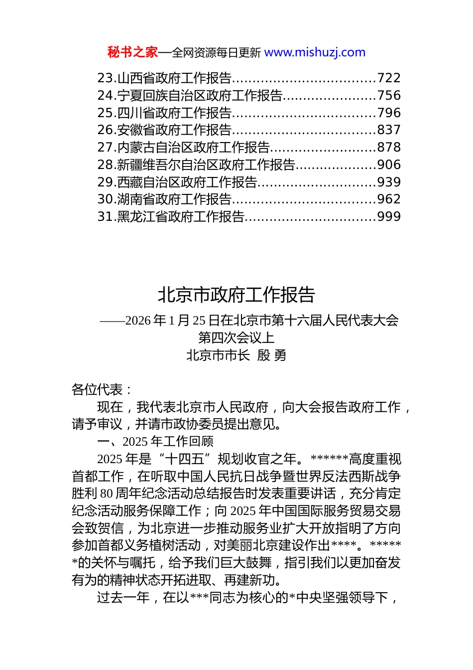秘书之家—全网资源每日更新 www.mishuzj.com2026 年 31 个省级政府工作报告汇编(31篇)目录1.北京市政府工作报告.........................................32.天津市政府工作报告.......................................333.上海市政府工作报告.......................................634.重庆市人民政府工作报告...............................1005.浙江省政府工作报告.....................................1426.河南省政府工作报告.....................................1607.河北省政府工作报告.....................................1848.贵州省政府工作报告.....................................2029.**省政府工作报告........................................24210.陕西省政府工作报告...................................28411.甘肃省政府工作报告...................................31212.青海省政府工作报告...................................34613.吉林省政府工作报告...................................37814.广东省政府工作报告...................................40215.山东省政府工作报告...................................45116.辽宁省政府工作报告...................................48317.云南省政府工作报告...................................51618.福建省政府工作报告...................................55019.湖北省政府工作报告...................................58920.江西省政府工作报告...................................62821.广西壮族自治区政府工作报告.......................66022.江苏省政府工作报告...................................693秘书之家—全网资源每日更新 www.mishuzj.com23.山西省政府工作报告...................................72224.宁夏回族自治区政府工作报告.......................75625.四川省政府工作报告...................................79626.安徽省政府工作报告...................................83727.内蒙古自治区政府工作报告..........................87828.新疆维吾尔自治区政府工作报告....................90629.西藏自治区政府工作报告.............................93930.湖南省政府工作报告...................................96231.黑龙江省政府工作报告................................999北京市政府工作报告——2026 年 1 月 25 日在北京市第十六届人民代表大会第四次会议上北京市市长 殷 勇各位代表:现在,我代表北京市人民政府,向大会报告政府工作,请予审议,并请市政协委员提出意见。一、2025 年工作回顾2025 年是“十四五”规划收官之年。******高度重视首都工作,在听取中国人民抗日战争暨世界反法西斯战争胜利 80 周年纪念活动总结报告时发表重要讲话,充分肯定纪念活动服务保障工作;向 2025 年中国国际服务贸易交易会致贺信,为北京进一步推动服务业扩大开放指明了方向参加首都义务植树活动,对美丽北京建设作出****。******的关怀与嘱托,给予我们巨大鼓舞,指引我们以更加奋发有为的精神状态开拓进取、再建新功。过去一年,在以***同志为核心的*中央坚强领导下,秘书之家—全网资源每日更新 www.mishuzj.com在中共北京市委直接领导下,在市人大及其常委会监督支持下,我们坚持以**************思想为指导,全面贯彻*的二十大和二十届历次全会精神,深入贯彻******对北京重要讲话精神,加强“四个中心”功能建设,提高“四个服务”水平,深化“五子”联动服务和融入新发展格局,坚持统筹发展和安全,经济顶压前行、向新向优发展,社会大局保持稳定,较好完成了市十六届人大三次会议确定的目标任务。全市地区生产总值 5.2 万亿元、增长 5.4%、高于全国 0.4 个百分点,一般公共预算收入增长 4.8%,城镇调查失业率 4.1%,居民人均可支配收入实际增长 4.4%,居民消费价格总体平稳,人均地区生产总值、全员劳动生产率和万元地区生产总值能耗、水耗、碳排放等多项指标保持全国省级地区最优水平。一年来,主要做了以下工作。一是首都功...