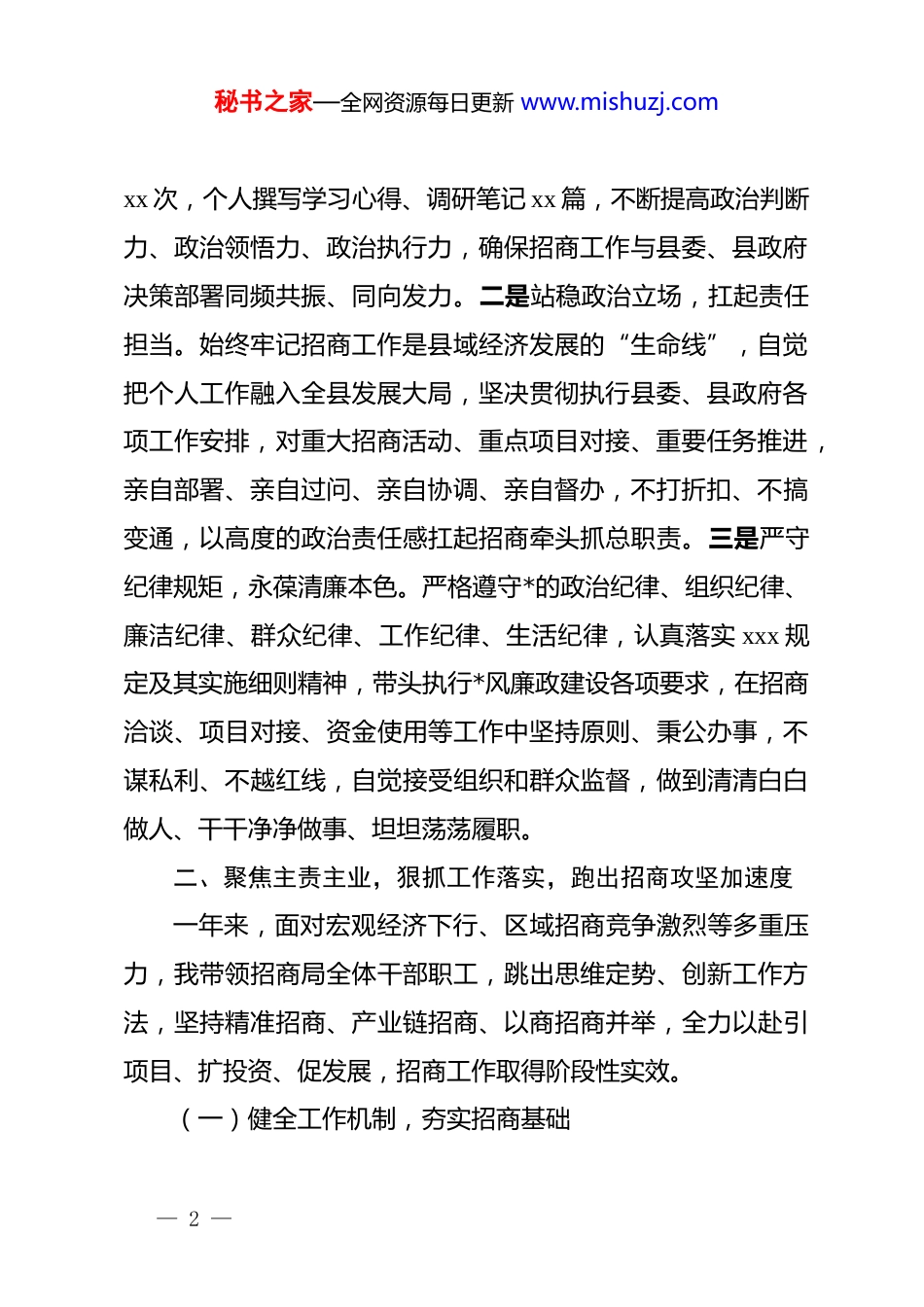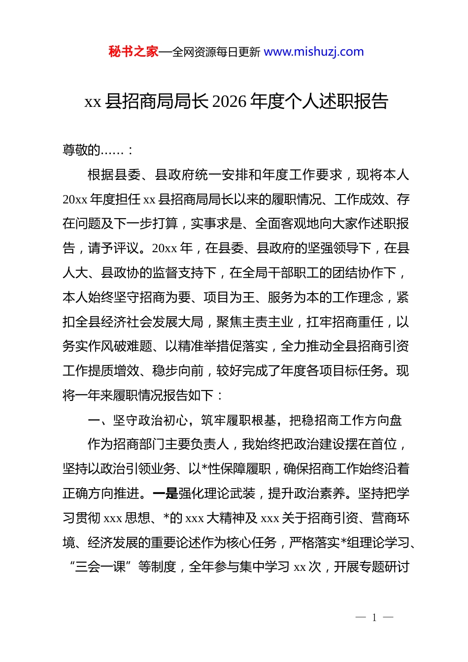 秘书之家—全网资源每日更新 www.mishuzj.comxx 县招商局局长 2026 年度个人述职报告尊敬的......:根据县委、县政府统一安排和年度工作要求,现将本人20xx 年度担任 xx 县招商局局长以来的履职情况、工作成效、存在问题及下一步打算,实事求是、全面客观地向大家作述职报告,请予评议。20xx 年,在县委、县政府的坚强领导下,在县人大、县政协的监督支持下,在全局干部职工的团结协作下,本人始终坚守招商为要、项目为王、服务为本的工作理念,紧扣全县经济社会发展大局,聚焦主责主业,扛牢招商重任,以务实作风破难题、以精准举措促落实,全力推动全县招商引资工作提质增效、稳步向前,较好完成了年度各项目标任务。现将一年来履职情况报告如下:一、坚守政治初心,筑牢履职根基,把稳招商工作方向盘作为招商部门主要负责人,我始终把政治建设摆在首位,坚持以政治引领业务、以*性保障履职,确保招商工作始终沿着正确方向推进。一是强化理论武装,提升政治素养。坚持把学习贯彻 xxx 思想、*的 xxx 大精神及 xxx 关于招商引资、营商环境、经济发展的重要论述作为核心任务,严格落实*组理论学习、“三会一课”等制度,全年参与集中学习 xx 次,开展专题研讨— 1 —秘书之家—全网资源每日更新 www.mishuzj.comxx 次,个人撰写学习心得、调研笔记 xx 篇,不断提高政治判断力、政治领悟力、政治执行力,确保招商工作与县委、县政府决策部署同频共振、同向发力。二是站稳政治立场,扛起责任担当。始终牢记招商工作是县域经济发展的“生命线”,自觉把个人工作融入全县发展大局,坚决贯彻执行县委、县政府各项工作安排,对重大招商活动、重点项目对接、重要任务推进,亲自部署、亲自过问、亲自协调、亲自督办,不打折扣、不搞变通,以高度的政治责任感扛起招商牵头抓总职责。三是严守纪律规矩,永葆清廉本色。严格遵守*的政治纪律、组织纪律、廉洁纪律、群众纪律、工作纪律、生活纪律,认真落实 xxx 规定及其实施细则精神,带头执行*风廉政建设各项要求,在招商洽谈、项目对接、资金使用等工作中坚持原则、秉公办事,不谋私利、不越红线,自觉接受组织和群众监督,做到清清白白做人、干干净净做事、坦坦荡荡履职。二、聚焦主责主业,狠抓工作落实,跑出招商攻坚加速度一年来,面对宏观经济下行、区域招商竞争激烈等多重压力,我带领招商局全体干部职工,跳出思维定势、创新工作方法,坚持精准招商、产业链招商、以商招商并举,全力以赴引项目、扩投资、促发展,招商工作取得阶段性实效。(一)健全工作机制,夯实招商基础— 2 —秘书之家—全网资源每日更新 www.mishuzj.com立足我县产业基础和资源禀赋,牵头修订完善《xx 县招商引资优惠政策》《xx 县招商引资考核办法》等制度文件,进一步明确招商方向、规范工作流程、强化激励约束,构建起主要领导带头抓、分管领导具体抓、招商部门牵头抓、各乡镇部门协同抓的全员招商工作格局。建立重点项目台账管理、周调度、月通报、季考核工作机制,对在谈项目、签约项目、落地项目实行全流程跟踪、全周期服务,有效解决了以往招商工作推进慢、衔接不畅、责任不实等问题,让招商工作有章可循、有据可依、有序推进。(二)精准靶向发力,提升招商质效紧扣我县特色农业、新型工业、文旅康养、现代服务业等主导产业,梳理产业链短板弱项,绘制产业招商图谱,组建专业招商小分队,变“大水漫灌”为“精准滴灌”。全年带队赴长三角、珠三角、京津冀等重点区域开展招商推介、项目洽谈xx 次,邀请外地企业来我县考察对接 xx 批次 xx 余人,成功举办 xx 县招商引资推介会 xx 场,精准对接目标企业 xx 家。20xx年,全县新签约招商引资项目 xx 个,其中亿元以上项目 xx 个、五千万元以上项目 xx 个,签约总金额达 xx 亿元;实际到位资金 xx 亿元,完成年度目标任务的 xx%,较上年增长 xx 个百分点,招商项目数量、投资额度、资金到位率均实现稳步提升。— 3 —秘书之家—全网资源每日更新 www.mishuzj.com(三)强化项目服务,推动落地见效始终坚持招商与安商并重、引进与服务同步,牵头落实项...