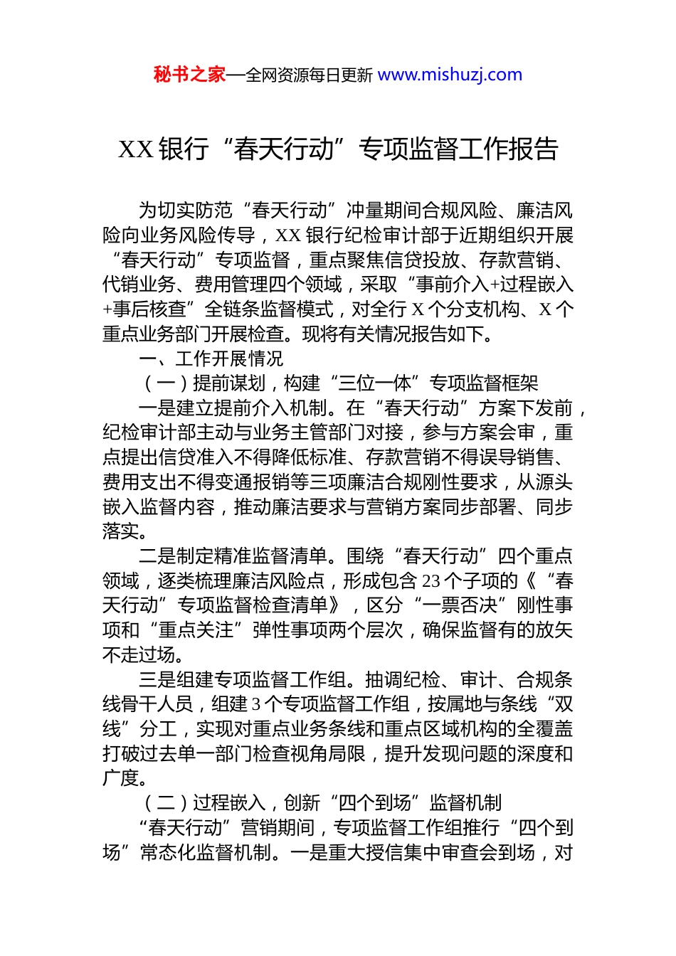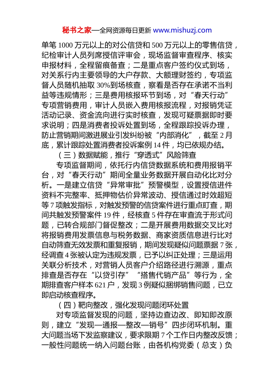秘书之家—全网资源每日更新 www.mishuzj.comXX 银行“春天行动”专项监督工作报告为切实防范“春天行动”冲量期间合规风险、廉洁风险向业务风险传导,XX 银行纪检审计部于近期组织开展“春天行动”专项监督,重点聚焦信贷投放、存款营销、代销业务、费用管理四个领域,采取“事前介入+过程嵌入+事后核查”全链条监督模式,对全行 X 个分支机构、X 个重点业务部门开展检查。现将有关情况报告如下。一、工作开展情况(一)提前谋划,构建“三位一体”专项监督框架一是建立提前介入机制。在“春天行动”方案下发前,纪检审计部主动与业务主管部门对接,参与方案会审,重点提出信贷准入不得降低标准、存款营销不得误导销售、费用支出不得变通报销等三项廉洁合规刚性要求,从源头嵌入监督内容,推动廉洁要求与营销方案同步部署、同步落实。二是制定精准监督清单。围绕“春天行动”四个重点领域,逐类梳理廉洁风险点,形成包含 23 个子项的《“春天行动”专项监督检查清单》,区分“一票否决”刚性事项和“重点关注”弹性事项两个层次,确保监督有的放矢不走过场。三是组建专项监督工作组。抽调纪检、审计、合规条线骨干人员,组建 3 个专项监督工作组,按属地与条线“双线”分工,实现对重点业务条线和重点区域机构的全覆盖打破过去单一部门检查视角局限,提升发现问题的深度和广度。(二)过程嵌入,创新“四个到场”监督机制“春天行动”营销期间,专项监督工作组推行“四个到场”常态化监督机制。一是重大授信集中审查会到场,对秘书之家—全网资源每日更新 www.mishuzj.com单笔 1000 万元以上的对公信贷和 500 万元以上的零售信贷,纪检审计人员列席授信评审会,现场监督审查程序、核实申报材料,全程留痕备查;二是重点客户签约仪式到场,对关系行内主要领导的大户存款、大额理财签约,专项监督人员随机抽取 30%到场核查,察看是否存在承诺不当利益等违规情形;三是费用核报环节到场,对“春天行动”专项营销费用,审计人员嵌入费用核报流程,对报销凭证活动记录、资金流向进行实时核查,发现可疑票据即时要求说明;四是消费者投诉处置到场,全程跟踪投诉办理,防止营销期间激进展业引发纠纷被“内部消化”,截至 2 月底,累计跟踪处置消费者投诉案例 14 件,均已依规办结。(三)数据赋能,推行“穿透式”风险筛查专项监督期间,依托行内信贷数据系统和费用报销平台,对“春天行动”期间全量业务数据开展自动化比对分析。一是建立信贷“异常审批”预警模型,设置授信进件资料不完整率、抵押物估价异常波动、授信通过时效超短等 7 项触发指标,对触发预警的信贷案件进行重点盯查,期间共触发预警案件 19 件,经核查 5 件存在审查流于形式问题,已转合规部门督促整改;二是开展费用数据交叉比对将报销费用发票信息与税务数据、商家资质信息进行比对自动筛查无效发票和重复报销,期间发现疑似问题票据 7 张,经调查 4 张被认定为违规发票,已予以纠正处理;三是运用关联分析技术,对营销人员客户介绍路径进行溯源,重点排查是否存在“以贷引存”“搭售代销产品”等行为,全期排查客户样本 621 户,发现 3 例疑似捆绑销售问题,已立即启动核查程序。(四)靶向整改,强化发现问题闭环处置对专项监督发现的问题,坚持边查边改、即知即改原则,建立“发现—通报—整改—销号”四步闭环机制。重大问题当场下发监察建议,要求限期 7 个工作日内整改反馈;一般性问题统一纳入问题台账,由各机构党委(总支)负秘书之家—全网资源每日更新 www.mishuzj.com责人签字背书后逐项整改,整改情况报纪检审计部核销。对拒不整改或整改不到位的,按程序报行党委会研究处理专项监督期间,共向 7 个机构发出书面监督意见,发出口头提醒函 11 份,推动当期整改问题 31 项,整改销号率达90.3%,剩余问题全部纳入下阶段持续督办清单。二、检查发现的主要问题(一)信贷审查“走过场”问题仍有存量专项核查中发现,部分支行在“春天行动”冲量压力下,存在信贷审查质量下滑问题。主要表现:一是贷前调查敷衍应付,2 家支行共 3 笔对公贷款的实地调查记录与...