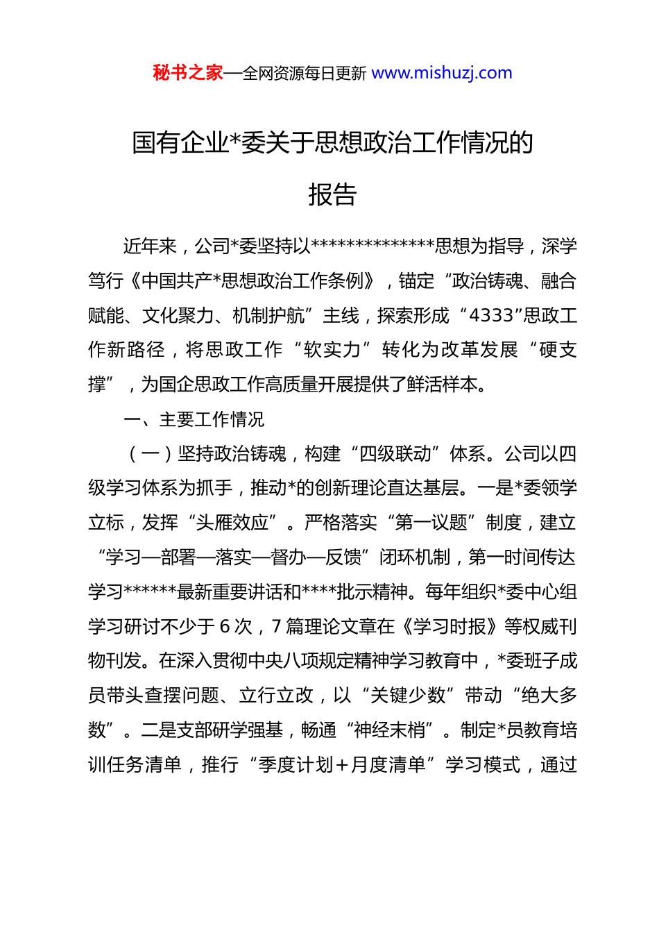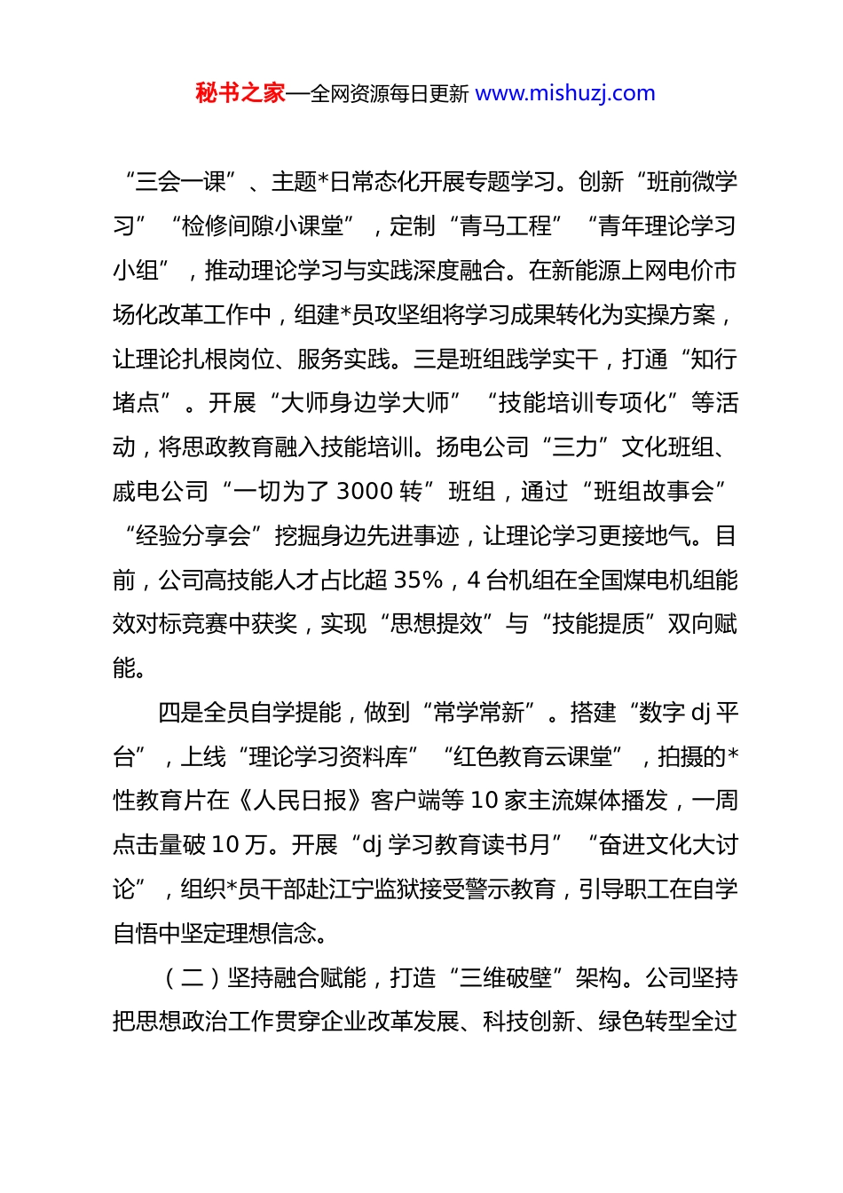 秘书之家—全网资源每日更新 www.mishuzj.com国有企业*委关于思想政治工作情况的报告近年来,公司*委坚持以**************思想为指导,深学笃行《中国共产*思想政治工作条例》,锚定“政治铸魂、融合赋能、文化聚力、机制护航”主线,探索形成“4333”思政工作新路径,将思政工作“软实力”转化为改革发展“硬支撑”,为国企思政工作高质量开展提供了鲜活样本。一、主要工作情况(一)坚持政治铸魂,构建“四级联动”体系。公司以四级学习体系为抓手,推动*的创新理论直达基层。一是*委领学立标,发挥“头雁效应”。严格落实“第一议题”制度,建立“学习—部署—落实—督办—反馈”闭环机制,第一时间传达学习******最新重要讲话和****批示精神。每年组织*委中心组学习研讨不少于 6 次,7 篇理论文章在《学习时报》等权威刊物刊发。在深入贯彻中央八项规定精神学习教育中,*委班子成员带头查摆问题、立行立改,以“关键少数”带动“绝大多数”。二是支部研学强基,畅通“神经末梢”。制定*员教育培训任务清单,推行“季度计划+月度清单”学习模式,通过秘书之家—全网资源每日更新 www.mishuzj.com“三会一课”、主题*日常态化开展专题学习。创新“班前微学习”“检修间隙小课堂”,定制“青马工程”“青年理论学习小组”,推动理论学习与实践深度融合。在新能源上网电价市场化改革工作中,组建*员攻坚组将学习成果转化为实操方案,让理论扎根岗位、服务实践。三是班组践学实干,打通“知行堵点”。开展“大师身边学大师”“技能培训专项化”等活动,将思政教育融入技能培训。扬电公司“三力”文化班组、戚电公司“一切为了 3000 转”班组,通过“班组故事会”“经验分享会”挖掘身边先进事迹,让理论学习更接地气。目前,公司高技能人才占比超 35%,4 台机组在全国煤电机组能效对标竞赛中获奖,实现“思想提效”与“技能提质”双向赋能。四是全员自学提能,做到“常学常新”。搭建“数字 dj 平台”,上线“理论学习资料库”“红色教育云课堂”,拍摄的*性教育片在《人民日报》客户端等 10 家主流媒体播发,一周点击量破 10 万。开展“dj 学习教育读书月”“奋进文化大讨论”,组织*员干部赴江宁监狱接受警示教育,引导职工在自学自悟中坚定理想信念。(二)坚持融合赋能,打造“三维破壁”架构。公司坚持把思想政治工作贯穿企业改革发展、科技创新、绿色转型全过秘书之家—全网资源每日更新 www.mishuzj.com程,实现“思想红”引领“发展强”。一是融改革攻坚,破思想之藩。面对新型电力系统建设要求,围绕“三大突破”和“四大攻坚战”开展主题宣讲,组织“产改赋能 奋进建功”系列活动,让改革目标深入人心。创新南通片区“dj 联盟”模式,以“组织链”串起“人才链”“发展链”“创新链”,打通新质生产力发展堵点。建立基层电厂、售电公司、报价中心“三位一体”运营体系,连续两年获评国资委“双百行动”标杆企业。二是融科技创新,克攻坚之难。组建*员突击队,在 f级燃气轮机研发等领域集智攻关。深化与高校和科技企业合作,形成科研机构集群,相关技术入选国家重点研发计划。仪征热电成功投运国内首个西门子重型燃机国产化控制系统,洪泽压缩空气储能项目被列入集团申报国家能源首台(套)重大技术装备名单。三是融绿色转型,担央企之责。组织“聚绿色动能、助‘双碳’目标”劳动竞赛,举办“碳中和绿色影响力”主题宣传。加强海上风电开发,清洁能源装机占比大幅提升。常州武澄源网荷储一体化项目投产即盈利,入选国家绿色低碳示范项目清单;句电公司碳捕集系统被央视财经频道专题报道。(三)坚持文化聚力,培育“三色育人”生态。公司打造“红色铸魂、绿色发展、金色品牌”文化育人体系,让文化成秘书之家—全网资源每日更新 www.mishuzj.com为思想政治工作的鲜活载体。一是红色铸魂,传承初心根脉。建设“红色基因传播工作室”,挖掘望电“铁军”精神、戚电公司“抗战时期保供电”等红色资源,拍摄专题视频。戚电公司入选中电联电力工业遗产名录和首批省工业遗产,*性教育课程直播开讲,成为工业遗产“活态传承”典范。组织*员干部赴茅山新四军...