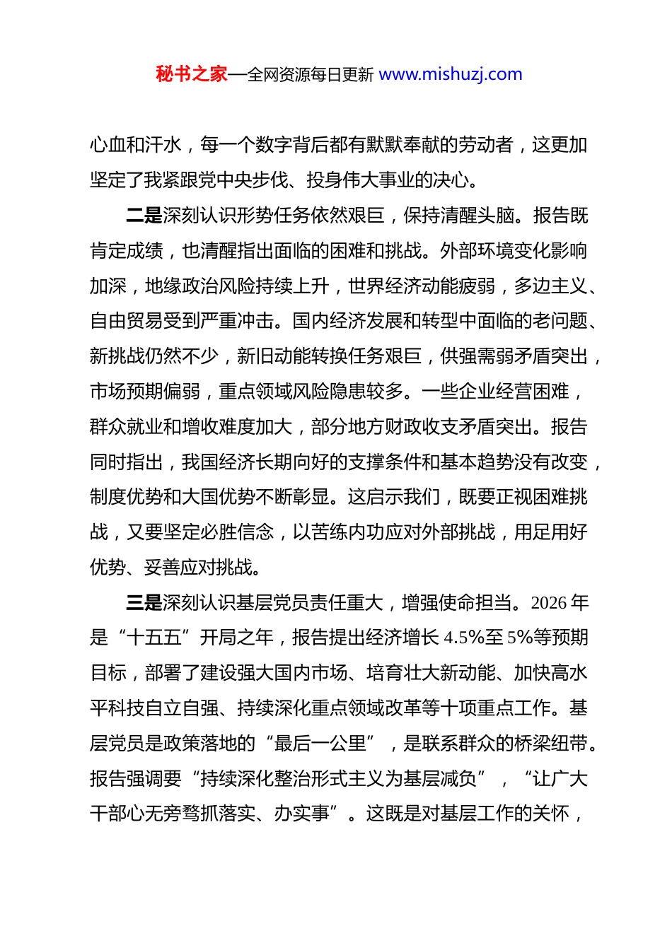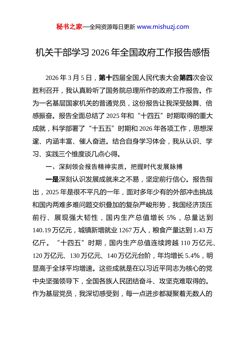 秘书之家—全网资源每日更新 www.mishuzj.com机关干部学习 2026 年全国政府工作报告感悟 2026 年 3 月 5 日,第十四届全国人民代表大会第四次会议胜利召开,我认真聆听了国务院总理所作的政府工作报告。作为一名基层国家机关的普通党员,这份报告让我深受鼓舞、倍感振奋。报告全面总结了 2025 年和“十四五”时期取得的重大成就,科学部署了“十五五”时期和 2026 年各项工作,思想深邃、内涵丰富、催人奋进。结合自身学习体会,我从认识、学习、实践三个维度谈几点心得。一、深刻领会报告精神实质,把握时代发展脉搏一是深刻认识发展成就来之不易,坚定前行信心。报告指出,2025 年是很不平凡的一年,面对多年少有的外部冲击挑战和国内两难多难问题交织叠加的复杂严峻形势,我国经济顶压前行、展现强大韧性,国内生产总值增长 5%,总量达到140.19 万亿元,城镇新增就业 1267 万人,粮食产量达到 1.43 万亿斤。“十四五”时期,国内生产总值连续跨越 110 万亿元、120 万亿元、130 万亿元、140 万亿元台阶,年均增长 5.4%,明显高于全球平均增速。这些成就是在以习近平同志为核心的党中央坚强领导下,全国各族人民团结奋斗、攻坚克难取得的。作为基层党员,我深切感受到,每一点进步都凝聚着无数人的秘书之家—全网资源每日更新 www.mishuzj.com心血和汗水,每一个数字背后都有默默奉献的劳动者,这更加坚定了我紧跟党中央步伐、投身伟大事业的决心。二是深刻认识形势任务依然艰巨,保持清醒头脑。报告既肯定成绩,也清醒指出面临的困难和挑战。外部环境变化影响加深,地缘政治风险持续上升,世界经济动能疲弱,多边主义、自由贸易受到严重冲击。国内经济发展和转型中面临的老问题、新挑战仍然不少,新旧动能转换任务艰巨,供强需弱矛盾突出,市场预期偏弱,重点领域风险隐患较多。一些企业经营困难,群众就业和增收难度加大,部分地方财政收支矛盾突出。报告同时指出,我国经济长期向好的支撑条件和基本趋势没有改变,制度优势和大国优势不断彰显。这启示我们,既要正视困难挑战,又要坚定必胜信念,以苦练内功应对外部挑战,用足用好优势、妥善应对挑战。三是深刻认识基层党员责任重大,增强使命担当。2026 年是“十五五”开局之年,报告提出经济增长 4.5%至 5%等预期目标,部署了建设强大国内市场、培育壮大新动能、加快高水平科技自立自强、持续深化重点领域改革等十项重点工作。基层党员是政策落地的“最后一公里”,是联系群众的桥梁纽带。报告强调要“持续深化整治形式主义为基层减负”,“让广大干部心无旁骛抓落实、办实事”。这既是对基层工作的关怀,秘书之家—全网资源每日更新 www.mishuzj.com更是对基层党员干部的鞭策。我深感肩上责任重大,必须在学习贯彻中找准定位,在落实执行中展现担当。二、扎实推动报告学习入脑入心,提升履职能力水平一是坚持系统全面学,把握精神实质和核心要义。学习政府工作报告,首先要原原本本学、逐字逐句悟。报告从 2025 年工作回顾、“十五五”时期主要目标和重大任务、2026 年经济社会发展总体要求和政策取向、2026 年政府工作任务四个方面展开,既有成绩总结、形势分析,又有目标设定、任务部署,是一个有机整体。我在学习中注重把握报告的主线脉络,深刻理解“十五五”时期突出推动高质量发展、突出做强国内大循环、突出推进全体人民共同富裕、突出统筹发展和安全的战略考量,准确把握 2026 年工作的总体要求和政策取向。通过系统学习,我对党中央国务院决策部署有了更加全面深刻的理解,为下一步贯彻落实打下坚实基础。二是坚持联系实际学,找准工作定位和努力方向。报告提出“各级政府要树牢大局观,准确把握在全国发展大局中的定位,善于把国家战略、市场需求和地区优势结合起来,因地制宜探索高质量发展新模式”。作为一名基层国家机关党员,我深感要将学习报告与本职工作紧密结合。报告中关于基层减负、民生保障、社会治理、作风建设等内容,与基层工作息息相关。秘书之家—全网资源每日更新 www.mishuzj.com例如,报告提出“深入实施提振消费专项行动”“促进高质量充分就业”“推动...
