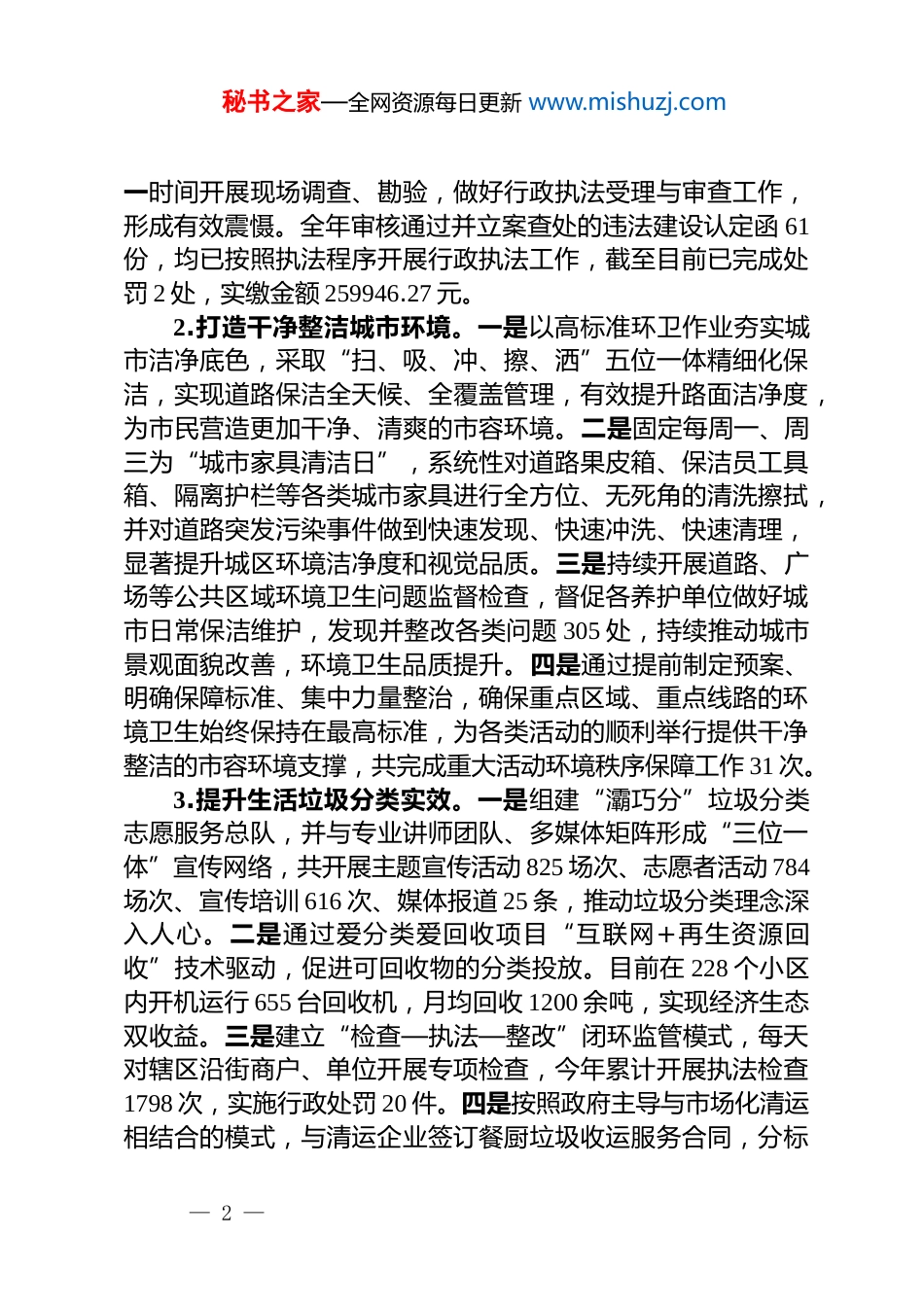 秘书之家—全网资源每日更新 www.mishuzj.com区城市管理和综合执法局 2025 年工作总结及 2026 年工作计划2025 年以来,区城管执法局紧紧围绕区委、区政府和市城管执法局中心工作,聚焦打好“八场硬仗”“深化六个改革”重点工作,真抓实干,勇于担当,持续深化拓展“三个年”活动,全力打好“八场攻坚战”,深入贯彻落实中央城市工作会议提出的“建设现代化人民城市”重要理念,扎实推进市容环境整治、城市秩序管控、城市安全保障等工作,着力优化城市环境、提升城市品质、提高城市韧性,切实将各项决策部署转化为改善民生、服务群众的实际成效。一、2025 年工作开展情况(一)持续深化精细管理,提升城市宜居质感坚持城市精细化管理导向,下足“绣花”功夫,推动市容秩序、环境卫生、生活垃圾分类、园林绿化等工作系统提升,努力营造干净整洁、优美宜居的城市环境。1.维护规范有序市容秩序。一是坚持“三定一包”(定人员、定路段、定责任、包秩序),常态化开展停车秩序专项整治,做到重点路段和易发“顽疾”点位城管执法人员无缺位,持续提升道路通畅度和市容整洁度,确保停车有序、出行安全。共劝离引导违停车辆 5 万余辆次、贴违法停车通知单 3 万余张、规范共享单车 6400 余辆次、查收违投电单车 600 余辆次。二是坚持集中整治与长效管理相结合,推进门头牌匾、户外广告规范化管理,加大对出店占道经营、社会噪音扰民等突出问题的整治力度,确保城市秩序井然有序。共规范门头牌匾 90 余个、拆除违规广告 263 处、整治占道(出店)经营 3900 余处次、制止噪音扰民行为 30 余起。三是坚持收到违法建设认定文件后第— 1 —秘书之家—全网资源每日更新 www.mishuzj.com一时间开展现场调查、勘验,做好行政执法受理与审查工作,形成有效震慑。全年审核通过并立案查处的违法建设认定函 61份,均已按照执法程序开展行政执法工作,截至目前已完成处罚 2 处,实缴金额 259946.27 元。2.打造干净整洁城市环境。一是以高标准环卫作业夯实城市洁净底色,采取“扫、吸、冲、擦、洒”五位一体精细化保洁,实现道路保洁全天候、全覆盖管理,有效提升路面洁净度,为市民营造更加干净、清爽的市容环境。二是固定每周一、周三为“城市家具清洁日”,系统性对道路果皮箱、保洁员工具箱、隔离护栏等各类城市家具进行全方位、无死角的清洗擦拭,并对道路突发污染事件做到快速发现、快速冲洗、快速清理,显著提升城区环境洁净度和视觉品质。三是持续开展道路、广场等公共区域环境卫生问题监督检查,督促各养护单位做好城市日常保洁维护,发现并整改各类问题 305 处,持续推动城市景观面貌改善,环境卫生品质提升。四是通过提前制定预案、明确保障标准、集中力量整治,确保重点区域、重点线路的环境卫生始终保持在最高标准,为各类活动的顺利举行提供干净整洁的市容环境支撑,共完成重大活动环境秩序保障工作 31 次。3.提升生活垃圾分类实效。一是组建“灞巧分”垃圾分类志愿服务总队,并与专业讲师团队、多媒体矩阵形成“三位一体”宣传网络,共开展主题宣传活动 825 场次、志愿者活动 784场次、宣传培训 616 次、媒体报道 25 条,推动垃圾分类理念深入人心。二是通过爱分类爱回收项目“互联网+再生资源回收”技术驱动,促进可回收物的分类投放。目前在 228 个小区内开机运行 655 台回收机,月均回收 1200 余吨,实现经济生态双收益。三是建立“检查—执法—整改”闭环监管模式,每天对辖区沿街商户、单位开展专项检查,今年累计开展执法检查1798 次,实施行政处罚 20 件。四是按照政府主导与市场化清运相结合的模式,与清运企业签订餐厨垃圾收运服务合同,分标— 2 —秘书之家—全网资源每日更新 www.mishuzj.com段、分区域开展收运工作,提升餐厨垃圾收运量,今年以来共清运厨余垃圾 10447.98 吨,日清运量 30.37 吨,同比增长约10%。4.加强园林绿化建设管护。一是紧抓西十高铁(xx 段)建设契机,经济高效谋划绿化苗木迁移,将项目回迁苗木再利用于道路绿化建设,实施泉香路(电厂东路至橘井巷以东)、橘井巷(新寺路至泉香路)新建...