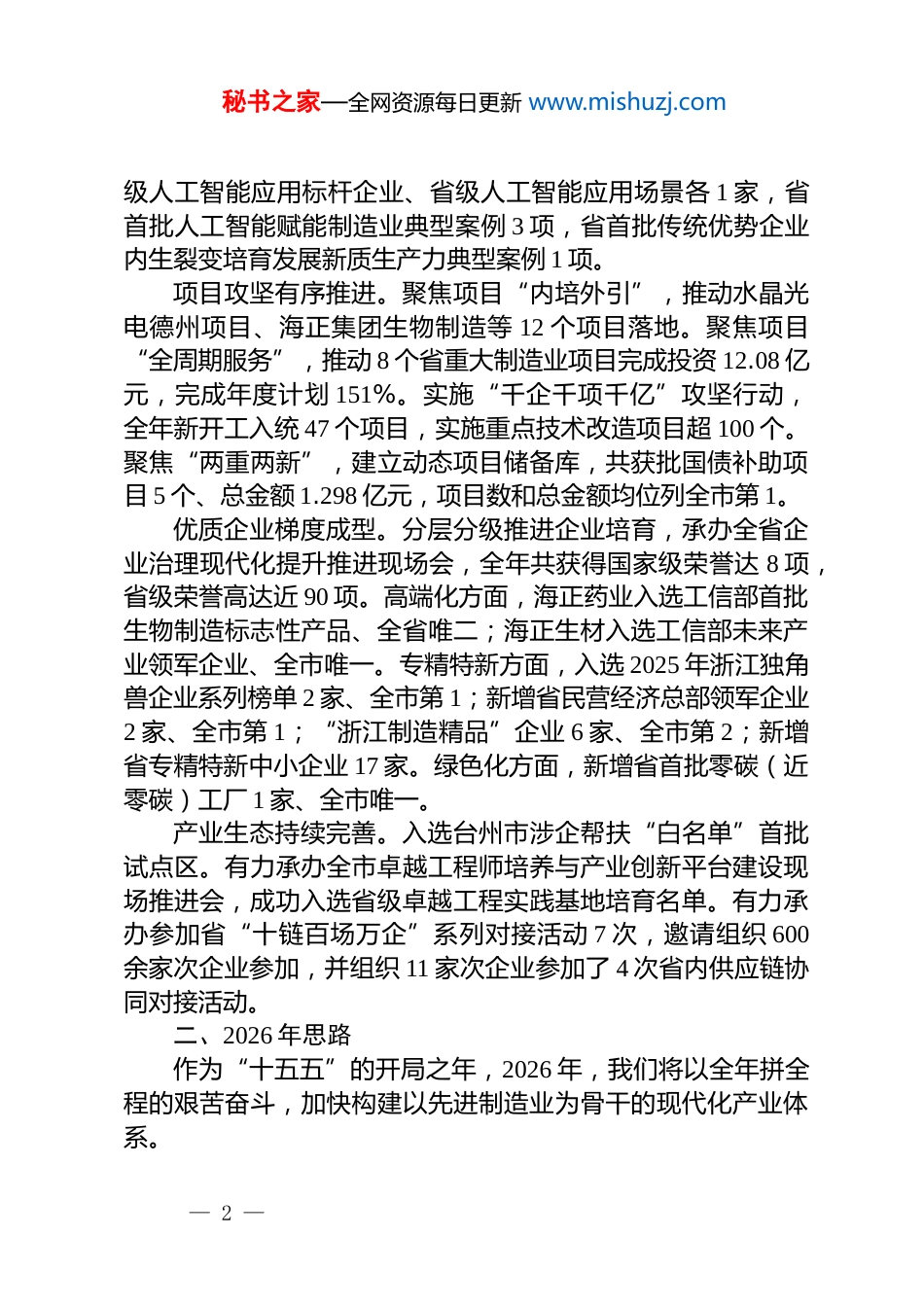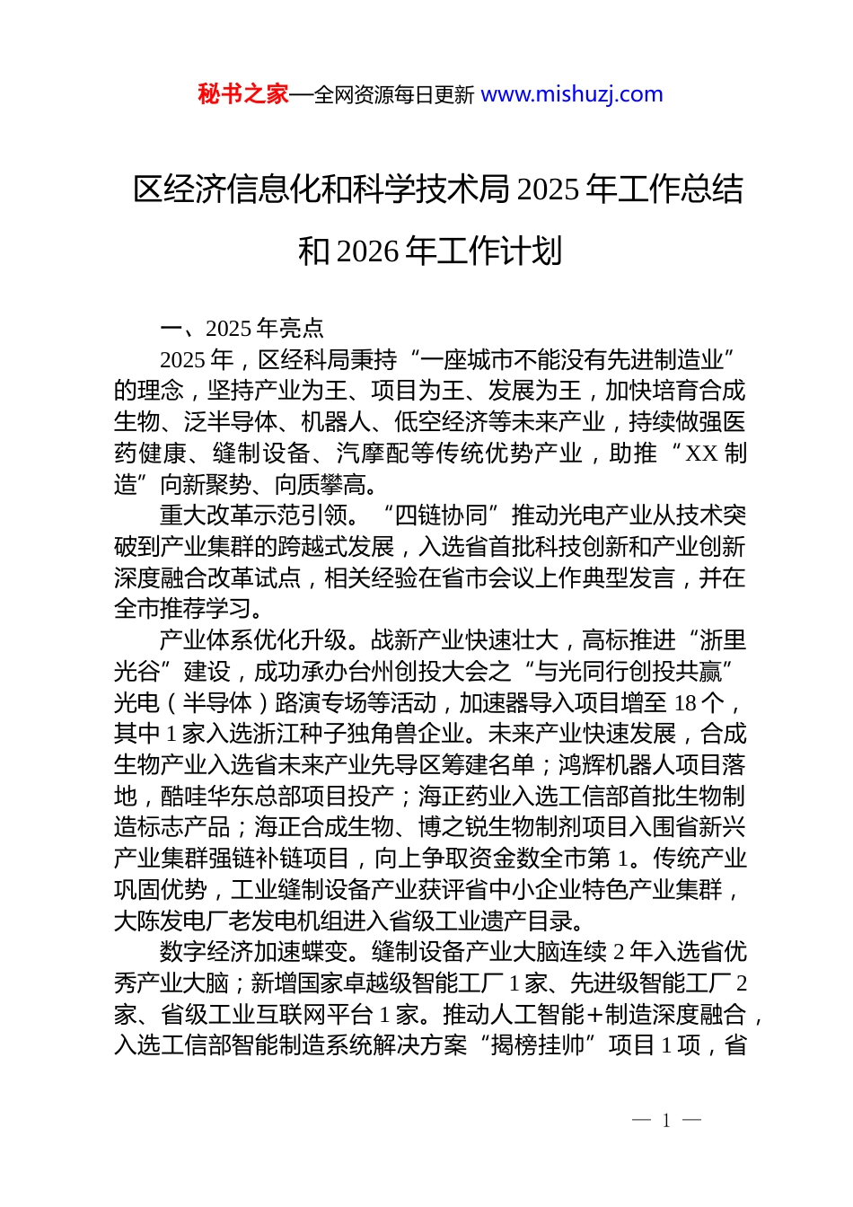 秘书之家—全网资源每日更新 www.mishuzj.com区经济信息化和科学技术局 2025 年工作总结和 2026 年工作计划一、2025 年亮点2025 年,区经科局秉持“一座城市不能没有先进制造业”的理念,坚持产业为王、项目为王、发展为王,加快培育合成生物、泛半导体、机器人、低空经济等未来产业,持续做强医药健康、缝制设备、汽摩配等传统优势产业,助推“ XX 制造”向新聚势、向质攀高。重大改革示范引领。“四链协同”推动光电产业从技术突破到产业集群的跨越式发展,入选省首批科技创新和产业创新深度融合改革试点,相关经验在省市会议上作典型发言,并在全市推荐学习。产业体系优化升级。战新产业快速壮大,高标推进“浙里光谷”建设,成功承办台州创投大会之“与光同行创投共赢”光电(半导体)路演专场等活动,加速器导入项目增至 18 个,其中 1 家入选浙江种子独角兽企业。未来产业快速发展,合成生物产业入选省未来产业先导区筹建名单;鸿辉机器人项目落地,酷哇华东总部项目投产;海正药业入选工信部首批生物制造标志产品;海正合成生物、博之锐生物制剂项目入围省新兴产业集群强链补链项目,向上争取资金数全市第 1。传统产业巩固优势,工业缝制设备产业获评省中小企业特色产业集群,大陈发电厂老发电机组进入省级工业遗产目录。数字经济加速蝶变。缝制设备产业大脑连续 2 年入选省优秀产业大脑;新增国家卓越级智能工厂 1 家、先进级智能工厂 2家、省级工业互联网平台 1 家。推动人工智能+制造深度融合,入选工信部智能制造系统解决方案“揭榜挂帅”项目 1 项,省— 1 —秘书之家—全网资源每日更新 www.mishuzj.com级人工智能应用标杆企业、省级人工智能应用场景各 1 家,省首批人工智能赋能制造业典型案例 3 项,省首批传统优势企业内生裂变培育发展新质生产力典型案例 1 项。项目攻坚有序推进。聚焦项目“内培外引”,推动水晶光电德州项目、海正集团生物制造等 12 个项目落地。聚焦项目“全周期服务”,推动 8 个省重大制造业项目完成投资 12.08 亿元,完成年度计划 151%。实施“千企千项千亿”攻坚行动,全年新开工入统 47 个项目,实施重点技术改造项目超 100 个。聚焦“两重两新”,建立动态项目储备库,共获批国债补助项目 5 个、总金额 1.298 亿元,项目数和总金额均位列全市第 1。优质企业梯度成型。分层分级推进企业培育,承办全省企业治理现代化提升推进现场会,全年共获得国家级荣誉达 8 项,省级荣誉高达近 90 项。高端化方面,海正药业入选工信部首批生物制造标志性产品、全省唯二;海正生材入选工信部未来产业领军企业、全市唯一。专精特新方面,入选 2025 年浙江独角兽企业系列榜单 2 家、全市第 1;新增省民营经济总部领军企业2 家、全市第 1;“浙江制造精品”企业 6 家、全市第 2;新增省专精特新中小企业 17 家。绿色化方面,新增省首批零碳(近零碳)工厂 1 家、全市唯一。产业生态持续完善。入选台州市涉企帮扶“白名单”首批试点区。有力承办全市卓越工程师培养与产业创新平台建设现场推进会,成功入选省级卓越工程实践基地培育名单。有力承办参加省“十链百场万企”系列对接活动 7 次,邀请组织 600余家次企业参加,并组织 11 家次企业参加了 4 次省内供应链协同对接活动。二、2026 年思路作为“十五五”的开局之年,2026 年,我们将以全年拼全程的艰苦奋斗,加快构建以先进制造业为骨干的现代化产业体系。— 2 —秘书之家—全网资源每日更新 www.mishuzj.com提供更有力的政策保障。抓紧修订《加快推进制造业高质量发展若干政策》,重点在推动新兴未来产业发展、支持企业并购等方面实现突破。谋划新一轮生物医药、泛半导体、机器人产业专项政策,加速产业跨越式发展。构建更完善的产业体系。光电产业,全速建设“浙里光谷”,推动水晶光电向产业链下游延伸,深化“四链融合”机制,强化台州光电产业中心引领作用,持续举办全球项目遴选会,吸引光电科技企业累计达到 21 家。生物医药产业,加快推进生物医药产业园建设,力争进入省合成生物未来产业先导区培育名单。机...