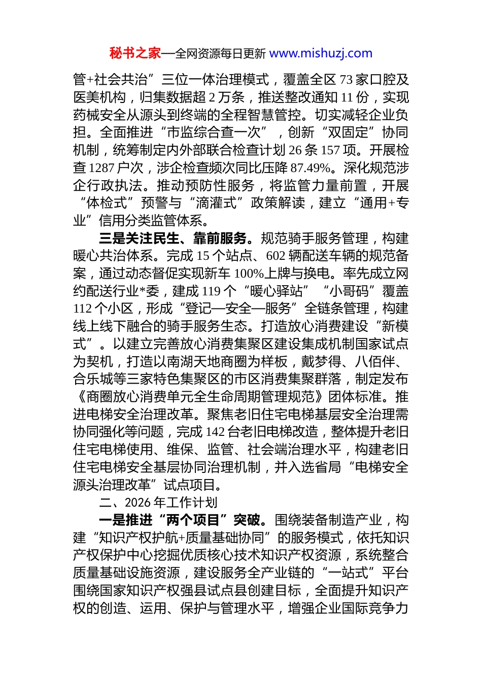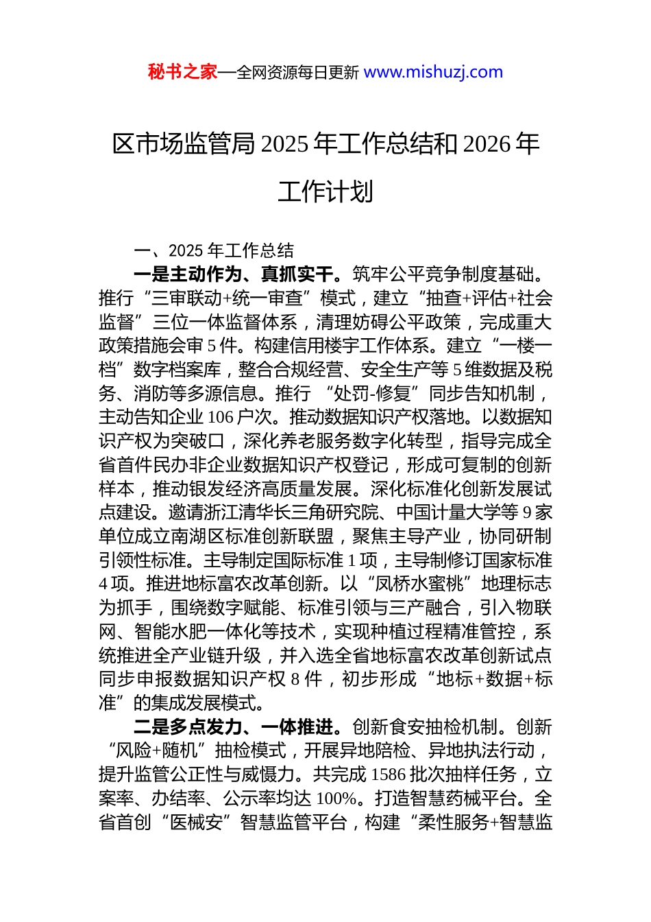 秘书之家—全网资源每日更新 www.mishuzj.com区市场监管局 2025 年工作总结和 2026 年工作计划一、2025 年工作总结一是主动作为、真抓实干。筑牢公平竞争制度基础。推行“三审联动+统一审查”模式,建立“抽查+评估+社会监督”三位一体监督体系,清理妨碍公平政策,完成重大政策措施会审 5 件。构建信用楼宇工作体系。建立“一楼一档”数字档案库,整合合规经营、安全生产等 5 维数据及税务、消防等多源信息。推行 “处罚-修复”同步告知机制,主动告知企业 106 户次。推动数据知识产权落地。以数据知识产权为突破口,深化养老服务数字化转型,指导完成全省首件民办非企业数据知识产权登记,形成可复制的创新样本,推动银发经济高质量发展。深化标准化创新发展试点建设。邀请浙江清华长三角研究院、中国计量大学等 9 家单位成立南湖区标准创新联盟,聚焦主导产业,协同研制引领性标准。主导制定国际标准 1 项,主导制修订国家标准4 项。推进地标富农改革创新。以“凤桥水蜜桃”地理标志为抓手,围绕数字赋能、标准引领与三产融合,引入物联网、智能水肥一体化等技术,实现种植过程精准管控,系统推进全产业链升级,并入选全省地标富农改革创新试点同步申报数据知识产权 8 件,初步形成“地标+数据+标准”的集成发展模式。二是多点发力、一体推进。创新食安抽检机制。创新“风险+随机”抽检模式,开展异地陪检、异地执法行动,提升监管公正性与威慑力。共完成 1586 批次抽样任务,立案率、办结率、公示率均达 100%。打造智慧药械平台。全省首创“医械安”智慧监管平台,构建“柔性服务+智慧监秘书之家—全网资源每日更新 www.mishuzj.com管+社会共治”三位一体治理模式,覆盖全区 73 家口腔及医美机构,归集数据超 2 万条,推送整改通知 11 份,实现药械安全从源头到终端的全程智慧管控。切实减轻企业负担。全面推进“市监综合查一次”,创新“双固定”协同机制,统筹制定内外部联合检查计划 26 条 157 项。开展检查 1287 户次,涉企检查频次同比压降 87.49%。深化规范涉企行政执法。推动预防性服务,将监管力量前置,开展“体检式”预警与“滴灌式”政策解读,建立“通用+专业”信用分类监管体系。三是关注民生、靠前服务。规范骑手服务管理,构建暖心共治体系。完成 15 个站点、602 辆配送车辆的规范备案,通过动态督促实现新车 100%上牌与换电。率先成立网约配送行业*委,建成 119 个“暖心驿站”“小哥码”覆盖112 个小区,形成“登记—安全—服务”全链条管理,构建线上线下融合的骑手服务生态。打造放心消费建设“新模式”。以建立完善放心消费集聚区建设集成机制国家试点为契机,打造以南湖天地商圈为样板,戴梦得、八佰伴、合乐城等三家特色集聚区的市区消费集聚群落,制定发布《商圈放心消费单元全生命周期管理规范》团体标准。推进电梯安全治理改革。聚焦老旧住宅电梯基层安全治理需协同强化等问题,完成 142 台老旧电梯改造,整体提升老旧住宅电梯使用、维保、监管、社会端治理水平,构建老旧住宅电梯安全基层协同治理机制,并入选省局“电梯安全源头治理改革”试点项目。二、2026 年工作计划一是推进“两个项目”突破。围绕装备制造产业,构建“知识产权护航+质量基础协同”的服务模式,依托知识产权保护中心挖掘优质核心技术知识产权资源,系统整合质量基础设施资源,建设服务全产业链的“一站式”平台围绕国家知识产权强县试点县创建目标,全面提升知识产权的创造、运用、保护与管理水平,增强企业国际竞争力秘书之家—全网资源每日更新 www.mishuzj.com发挥知识产权对区域高质量发展的支撑作用。二是深化“三大机制”建设。强化消费投诉数据运用,实现热点难点早发现、早介入,有效遏制侵害群众利益行为。深化消费投诉处理机制。完善全员办案机制,通过跨业务室联动、跨片区调剂、跨领域分配,改善办案力量配置、办案能力提升、办案质效优化等方面的问题。三是筑牢“四大安全”防线,提升风险防控效能。构建“快检筛查队+便民快检点+流动服务站”一体化食品安全风险检测服务模式,推动形成社会共治格局。开展药品安...