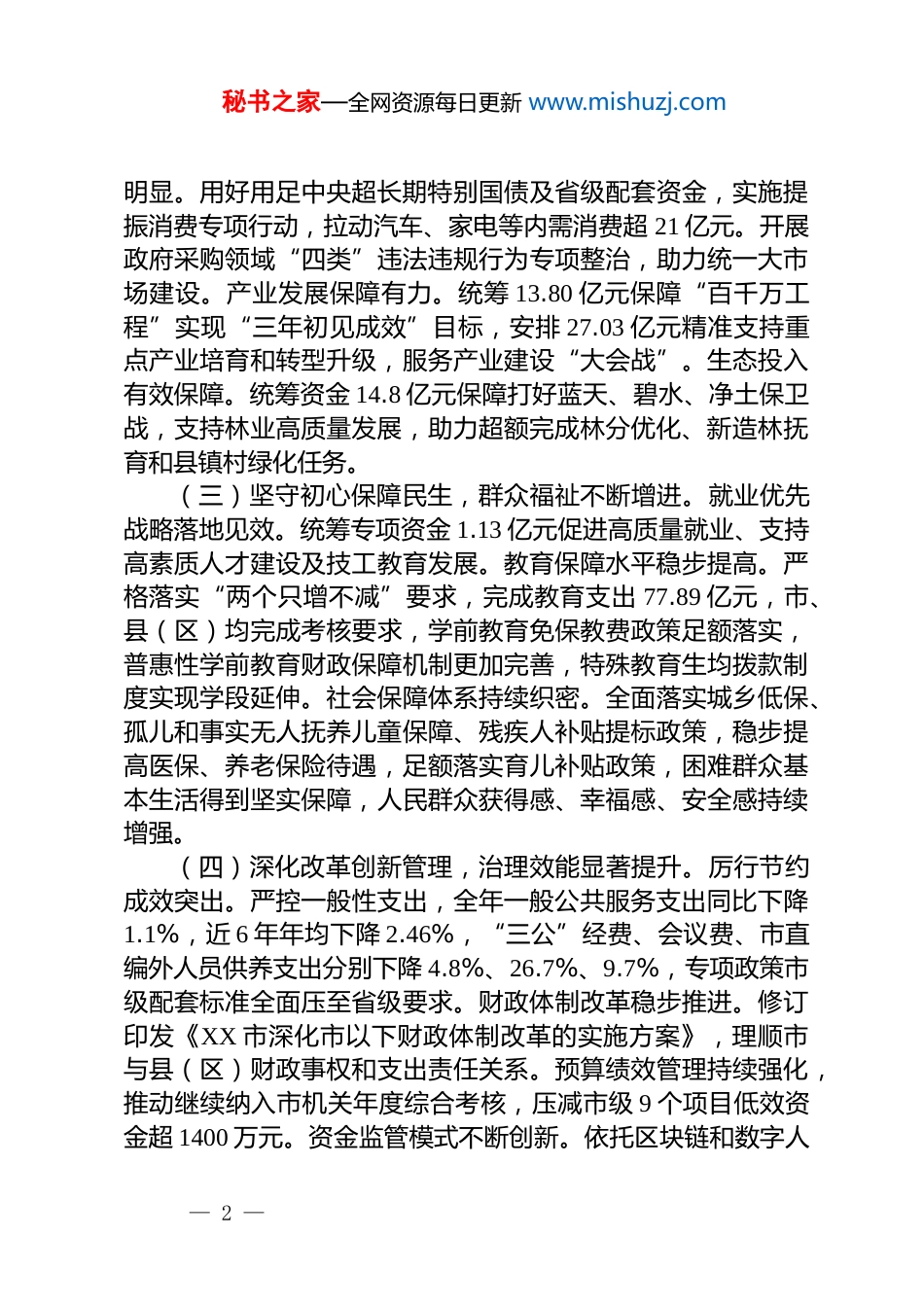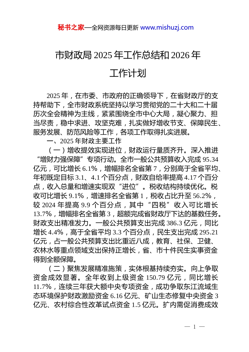 秘书之家—全网资源每日更新 www.mishuzj.com市财政局 2025 年工作总结和 2026 年工作计划2025 年,在市委、市政府的正确领导下,在省财政厅的支持帮助下,全市财政系统坚持以学习贯彻党的二十大和二十届历次全会精神为主线,紧紧围绕全市中心大局,凝心聚力、担当尽责,稳中求进、攻坚克难,扎实做好增收节支、保障民生、服务发展、防范风险等工作,各项工作取得扎实进展。一、2025 年财政主要工作(一)增收提效实现进位,财政运行量质齐升。深入推进“增财力强保障”专项行动。全市一般公共预算收入完成 95.34亿元,可比增长 6.1%,增幅排名全省第 7,分别高于全省平均、年初既定目标 3.1、4.1 个百分点,财政自给率提高 4.17 个百分点,收入总量和增速实现双“进位”。税收结构持续优化。税收可比增长 9.1%,增速排名全省第 1,税收占比升至 56.2%,较 2024 年提高 9.9 个百分点,其中“四税”收入可比增长13.7%,增幅排名全省第 3,超额完成省财政厅下达的基数任务。财政支出精准发力。一般公共预算支出完成 386.3 亿元,同比增长 4.4%,高于全省平均 3.3 个百分点,民生支出完成 295.21亿元,占一般公共预算支出比重近八成,教育、社保、卫健、农林水等重点领域支出保持正增长,省、市十件民生实事资金得到全额保障。(二)聚焦发展精准施策,实体根基持续夯实。向上争取资金成效显著。全年收到上级资金 150.79 亿元,同比增长11.7%,连续三年获大额中央专项资金,成功争取东江流域生态环境保护财政激励资金 6.16 亿元、矿山生态修复中央资金 3亿元、农村综合性改革试点资金 1.5 亿元。扩内需促消费成效— 1 —秘书之家—全网资源每日更新 www.mishuzj.com明显。用好用足中央超长期特别国债及省级配套资金,实施提振消费专项行动,拉动汽车、家电等内需消费超 21 亿元。开展政府采购领域“四类”违法违规行为专项整治,助力统一大市场建设。产业发展保障有力。统筹 13.80 亿元保障“百千万工程”实现“三年初见成效”目标,安排 27.03 亿元精准支持重点产业培育和转型升级,服务产业建设“大会战”。生态投入有效保障。统筹资金 14.8 亿元保障打好蓝天、碧水、净土保卫战,支持林业高质量发展,助力超额完成林分优化、新造林抚育和县镇村绿化任务。(三)坚守初心保障民生,群众福祉不断增进。就业优先战略落地见效。统筹专项资金 1.13 亿元促进高质量就业、支持高素质人才建设及技工教育发展。教育保障水平稳步提高。严格落实“两个只增不减”要求,完成教育支出 77.89 亿元,市、县(区)均完成考核要求,学前教育免保教费政策足额落实,普惠性学前教育财政保障机制更加完善,特殊教育生均拨款制度实现学段延伸。社会保障体系持续织密。全面落实城乡低保、孤儿和事实无人抚养儿童保障、残疾人补贴提标政策,稳步提高医保、养老保险待遇,足额落实育儿补贴政策,困难群众基本生活得到坚实保障,人民群众获得感、幸福感、安全感持续增强。(四)深化改革创新管理,治理效能显著提升。厉行节约成效突出。严控一般性支出,全年一般公共服务支出同比下降1.1%,近 6 年年均下降 2.46%,“三公”经费、会议费、市直编外人员供养支出分别下降 4.8%、26.7%、9.7%,专项政策市级配套标准全面压至省级要求。财政体制改革稳步推进。修订印发《XX 市深化市以下财政体制改革的实施方案》,理顺市与县(区)财政事权和支出责任关系。预算绩效管理持续强化,推动继续纳入市机关年度综合考核,压减市级 9 个项目低效资金超 1400 万元。资金监管模式不断创新。依托区块链和数字人— 2 —秘书之家—全网资源每日更新 www.mishuzj.com民币技术,打造“数字财政”全流程监管模式,实现政府投资项目穿透式监管全覆盖。开展会计信息质量“巡财联动”专项整治,发现问题 381 项,收回财政资金近 900 万元,财会监督初步实现“批—管—治”的角色升级。高标准推进乡镇财政七类重点费用专项整治,基层资金使用管理更加规范。投资评审严格把关,全市财政性资金投资项目核减率达 14.20%,节约财政资金超 34 亿元。(五)筑牢底线...