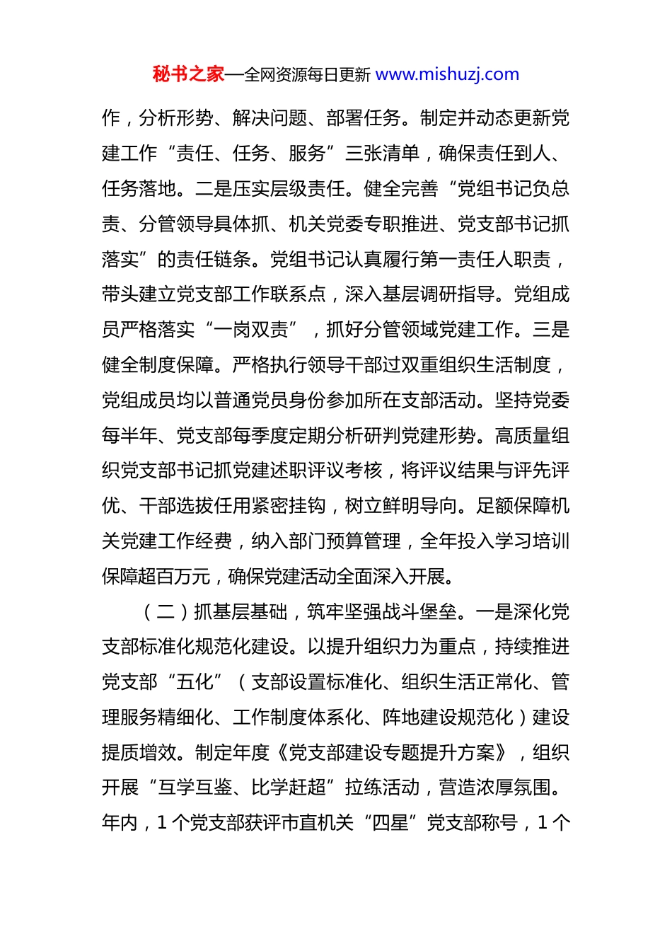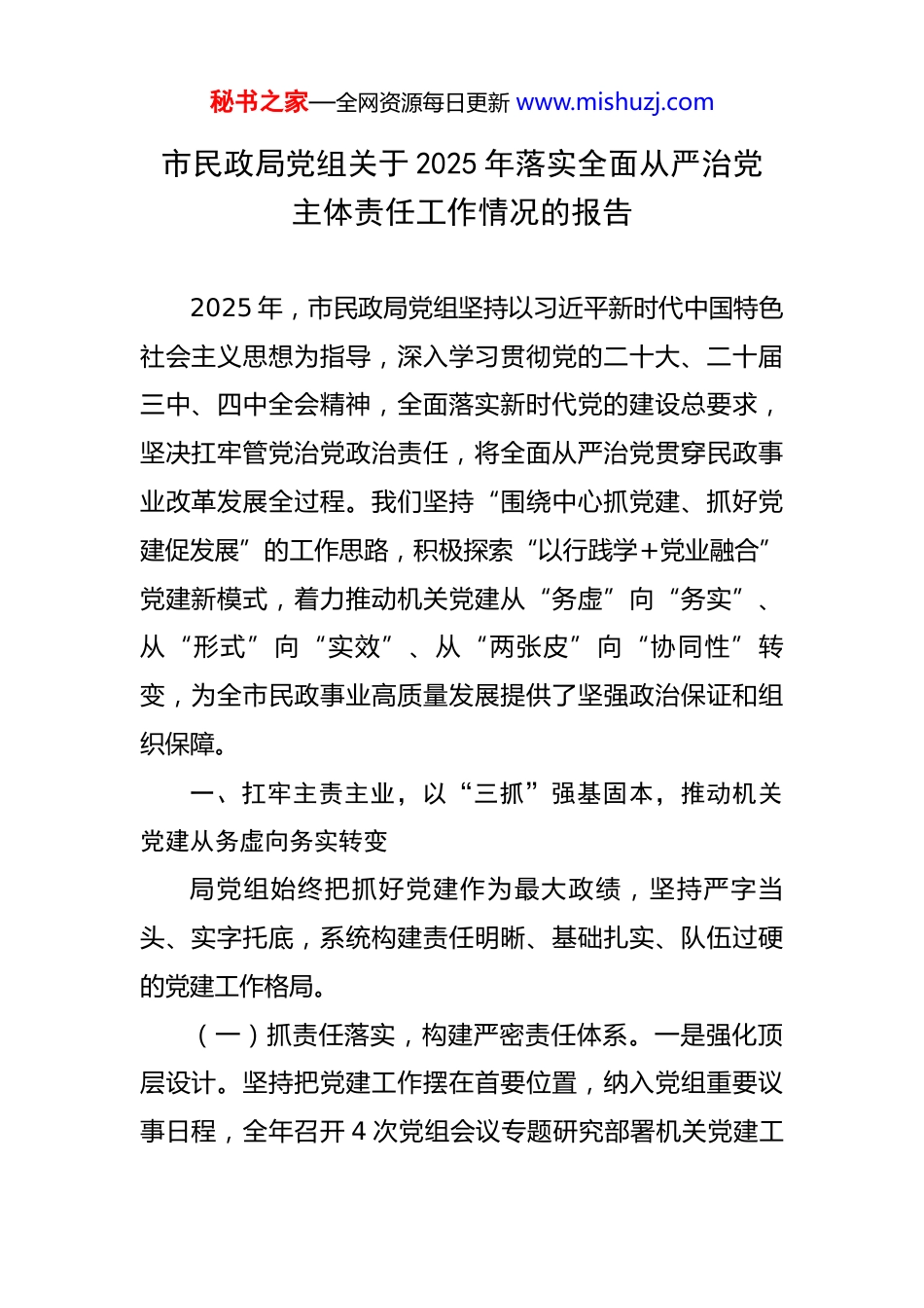 秘书之家—全网资源每日更新 www.mishuzj.com市民政局党组关于 2025 年落实全面从严治党主体责任工作情况的报告 2025 年,市民政局党组坚持以习近平新时代中国特色社会主义思想为指导,深入学习贯彻党的二十大、二十届三中、四中全会精神,全面落实新时代党的建设总要求,坚决扛牢管党治党政治责任,将全面从严治党贯穿民政事业改革发展全过程。我们坚持“围绕中心抓党建、抓好党建促发展”的工作思路,积极探索“以行践学+党业融合”党建新模式,着力推动机关党建从“务虚”向“务实”、从“形式”向“实效”、从“两张皮”向“协同性”转变,为全市民政事业高质量发展提供了坚强政治保证和组织保障。一、扛牢主责主业,以“三抓”强基固本,推动机关党建从务虚向务实转变局党组始终把抓好党建作为最大政绩,坚持严字当头、实字托底,系统构建责任明晰、基础扎实、队伍过硬的党建工作格局。(一)抓责任落实,构建严密责任体系。一是强化顶层设计。坚持把党建工作摆在首要位置,纳入党组重要议事日程,全年召开 4 次党组会议专题研究部署机关党建工秘书之家—全网资源每日更新 www.mishuzj.com作,分析形势、解决问题、部署任务。制定并动态更新党建工作“责任、任务、服务”三张清单,确保责任到人、任务落地。二是压实层级责任。健全完善“党组书记负总责、分管领导具体抓、机关党委专职推进、党支部书记抓落实”的责任链条。党组书记认真履行第一责任人职责,带头建立党支部工作联系点,深入基层调研指导。党组成员严格落实“一岗双责”,抓好分管领域党建工作。三是健全制度保障。严格执行领导干部过双重组织生活制度,党组成员均以普通党员身份参加所在支部活动。坚持党委每半年、党支部每季度定期分析研判党建形势。高质量组织党支部书记抓党建述职评议考核,将评议结果与评先评优、干部选拔任用紧密挂钩,树立鲜明导向。足额保障机关党建工作经费,纳入部门预算管理,全年投入学习培训保障超百万元,确保党建活动全面深入开展。(二)抓基层基础,筑牢坚强战斗堡垒。一是深化党支部标准化规范化建设。以提升组织力为重点,持续推进党支部“五化”(支部设置标准化、组织生活正常化、管理服务精细化、工作制度体系化、阵地建设规范化)建设提质增效。制定年度《党支部建设专题提升方案》,组织开展“互学互鉴、比学赶超”拉练活动,营造浓厚氛围。年内,1 个党支部获评市直机关“四星”党支部称号,1 个秘书之家—全网资源每日更新 www.mishuzj.com党支部进入“四星”创建序列。二是提升组织生活质效。严格落实“三会一课”、主题党日等制度,全年组织开展“四比四看”(比学习看信念、比担当看作为、比服务看效能、比作风看形象)竞赛活动、“理论研讨”、“青年大学习”等各类学习实践活动 10 余场次,有效激发党员参与热情,提升组织生活吸引力和实效性。三是严把党员入口关。坚持政治标准首位,注重在重大任务、斗争一线、学习提高和专业实践中发现、培养、考察入党积极分子和发展对象,全年发展党员*名,党员队伍结构持续优化,专业能力和综合素养稳步提升。选人用人突出政治标准,破除阻力、树立标杆,年内涌现出省级“两优一先”表彰对象*名、市级“第一等次”等荣誉获得者*名。(三)抓队伍管理,锻造过硬民政铁军。一是强化思想理论武装。坚持把学习贯彻习近平新时代中国特色社会主义思想作为首要政治任务,通过“周一夜学”、中心组学习、专题研讨、党员大会等多种形式,推动党的创新理论入脑入心。全年组织党员干部深入学习党的二十大及历次全会精神、党章党规党纪等,教育引导党员干部深刻领悟“两个确立”的决定性意义,增强“四个意识”、坚定“四个自信”、做到“两个维护”,始终在政治立场、政治方向、政治原则、政治道路上同以习近平同志为核心的秘书之家—全网资源每日更新 www.mishuzj.com党中央保持高度一致。二是深化纪律作风教育。坚持严管厚爱结合、激励约束并重。严格落实中央八项规定及其实施细则精神,坚决反对“四风”。全年组织开展“传承红色基因、筑牢忠诚品格”主题党日活动,赴红色教育基地接受洗礼;组织赴廉政教育基地开...