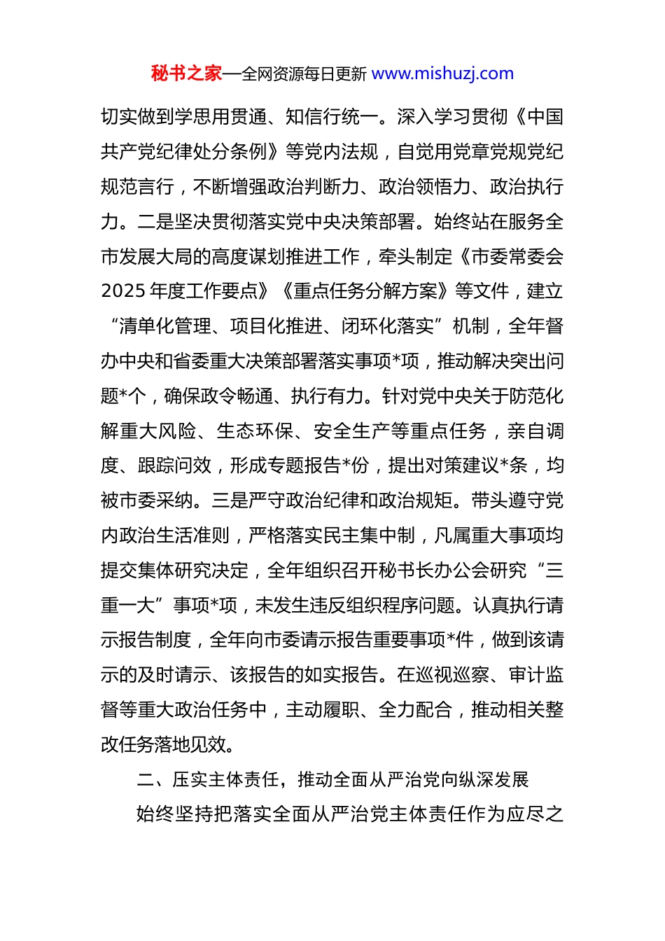 秘书之家—全网资源每日更新 www.mishuzj.com市委秘书长 2025 年度落实全面从严治党政治责任落实“一岗双责”情况报告 2025 年,本人坚持以习近平新时代中国特色社会主义思想为指导,全面贯彻党的二十大和二十届历次全会精神,深入落实党中央关于全面从严治党的战略部署,坚决扛起市委秘书长职责使命,始终把党的政治建设摆在首位,切实履行全面从严治党政治责任,严格落实“一岗双责”,坚持严的基调不动摇,推动分管领域党风廉政建设不断向纵深发展,为全市工作高效运转和经济社会高质量发展提供了坚强政治保障。一、强化政治引领,坚定不移把“两个维护”落到实处作为市委秘书长,始终把旗帜鲜明讲政治作为第一要求,把做到“两个维护”作为最高政治原则和根本政治规矩,在思想上政治上行动上同以习近平同志为核心的党中央保持高度一致。一是深学细悟强化理论武装。严格落实“第一议题”制度,带头学习贯彻习近平总书记重要讲话和重要指示批示精神,全年组织召开秘书长办公会*次,专题传达学习中央及省委重要会议精神*次,主持开展理论学习中心组集中学习共*次,撰写心得体会和理论文章*篇,秘书之家—全网资源每日更新 www.mishuzj.com切实做到学思用贯通、知信行统一。深入学习贯彻《中国共产党纪律处分条例》等党内法规,自觉用党章党规党纪规范言行,不断增强政治判断力、政治领悟力、政治执行力。二是坚决贯彻落实党中央决策部署。始终站在服务全市发展大局的高度谋划推进工作,牵头制定《市委常委会2025 年度工作要点》《重点任务分解方案》等文件,建立“清单化管理、项目化推进、闭环化落实”机制,全年督办中央和省委重大决策部署落实事项*项,推动解决突出问题*个,确保政令畅通、执行有力。针对党中央关于防范化解重大风险、生态环保、安全生产等重点任务,亲自调度、跟踪问效,形成专题报告*份,提出对策建议*条,均被市委采纳。三是严守政治纪律和政治规矩。带头遵守党内政治生活准则,严格落实民主集中制,凡属重大事项均提交集体研究决定,全年组织召开秘书长办公会研究“三重一大”事项*项,未发生违反组织程序问题。认真执行请示报告制度,全年向市委请示报告重要事项*件,做到该请示的及时请示、该报告的如实报告。在巡视巡察、审计监督等重大政治任务中,主动履职、全力配合,推动相关整改任务落地见效。二、压实主体责任,推动全面从严治党向纵深发展始终坚持把落实全面从严治党主体责任作为应尽之秘书之家—全网资源每日更新 www.mishuzj.com责、分内之事,做到守土有责、守土负责、守土尽责。一是以上率下抓责任传导。认真履行市委机关全面从严治党第一责任人职责,年初牵头制定《市委办公室 2025 年党建工作要点》和《党风廉政建设责任清单》,明确班子成员“一岗双责”任务*项,与各科室负责人签订责任书*份,形成一级抓一级、层层抓落实的工作格局。定期召开专题会议研究党风廉政建设工作*次,听取班子成员履职情况汇报*次,开展廉政谈话*人次,对苗头性、倾向性问题及时提醒纠正。二是建章立制抓源头防控。聚焦权力运行关键环节,牵头修订完善《市委办公室内部管理制度汇编》,新制定《公文处理规范》《公务接待管理办法》《保密工作责任制实施细则》等制度*项,进一步扎紧制度笼子。加强对重点岗位、关键人员的监督管理,组织梳理廉政风险点*个,制定防控措施*条,推动形成用制度管权、按制度办事、靠制度管人的长效机制。三是常态监督抓作风改进。严格落实中央八项规定及其实施细则精神,持续深化形式主义、官僚主义专项整治,带头精简会议文件,全年压缩会议数量*%、压减文件印发量*%,切实为基层减负。加强对干部职工日常管理监督,开展作风纪律检查*次,通报典型案例*起,推动形成严在平时、管在日常的浓厚氛围。注重发挥机关纪委作用,支持其依规依纪履职,全年秘书之家—全网资源每日更新 www.mishuzj.com处置问题线索*件,运用“第一种形态”处理*人次。三、履行“一岗双责”,统筹抓好分管领域党风廉政建设在抓好市委机关自身建设的同时,切实加强对分管领域的党风廉政建设和反腐败工作领导,做到业务工作与廉政建设同部署、同推...