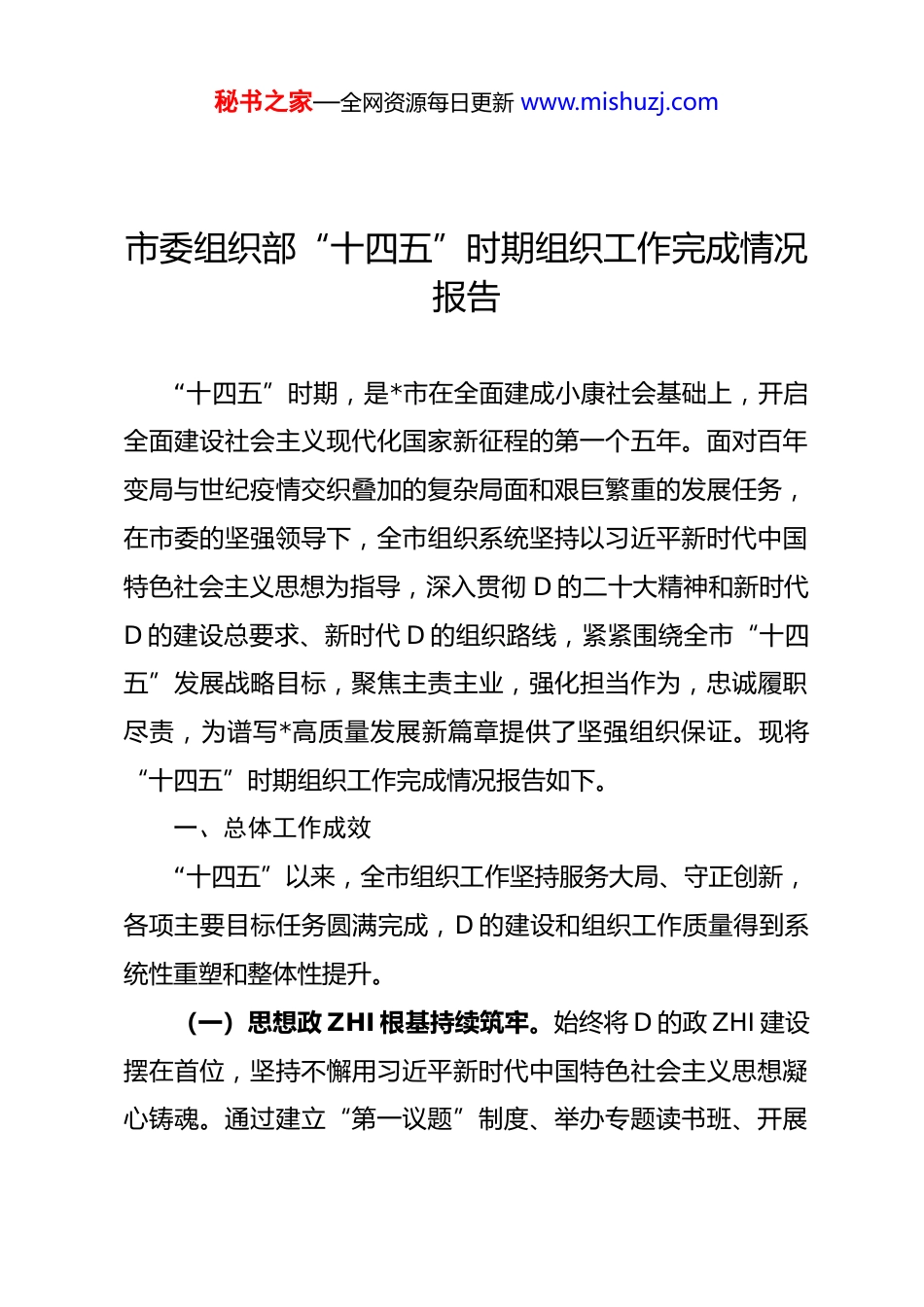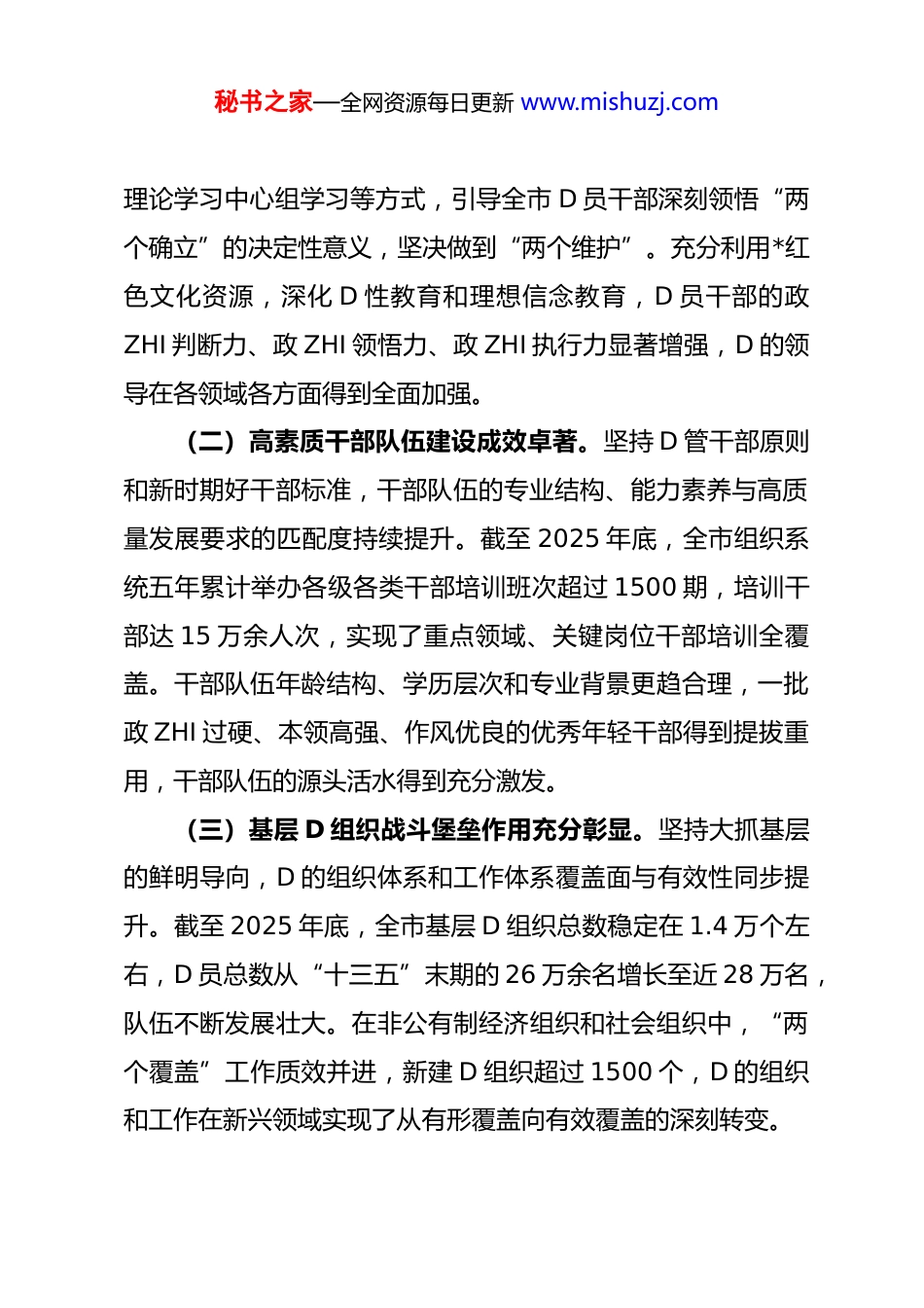 秘书之家—全网资源每日更新 www.mishuzj.com市委组织部“十四五”时期组织工作完成情况报告“十四五”时期,是*市在全面建成小康社会基础上,开启全面建设社会主义现代化国家新征程的第一个五年。面对百年变局与世纪疫情交织叠加的复杂局面和艰巨繁重的发展任务,在市委的坚强领导下,全市组织系统坚持以习近平新时代中国特色社会主义思想为指导,深入贯彻 D 的二十大精神和新时代D 的建设总要求、新时代 D 的组织路线,紧紧围绕全市“十四五”发展战略目标,聚焦主责主业,强化担当作为,忠诚履职尽责,为谱写*高质量发展新篇章提供了坚强组织保证。现将“十四五”时期组织工作完成情况报告如下。一、总体工作成效“十四五”以来,全市组织工作坚持服务大局、守正创新,各项主要目标任务圆满完成,D 的建设和组织工作质量得到系统性重塑和整体性提升。(一)思想政 ZHI 根基持续筑牢。始终将 D 的政 ZHI 建设摆在首位,坚持不懈用习近平新时代中国特色社会主义思想凝心铸魂。通过建立“第一议题”制度、举办专题读书班、开展秘书之家—全网资源每日更新 www.mishuzj.com理论学习中心组学习等方式,引导全市 D 员干部深刻领悟“两个确立”的决定性意义,坚决做到“两个维护”。充分利用*红色文化资源,深化 D 性教育和理想信念教育,D 员干部的政ZHI 判断力、政 ZHI 领悟力、政 ZHI 执行力显著增强,D 的领导在各领域各方面得到全面加强。(二)高素质干部队伍建设成效卓著。坚持 D 管干部原则和新时期好干部标准,干部队伍的专业结构、能力素养与高质量发展要求的匹配度持续提升。截至 2025 年底,全市组织系统五年累计举办各级各类干部培训班次超过 1500 期,培训干部达 15 万余人次,实现了重点领域、关键岗位干部培训全覆盖。干部队伍年龄结构、学历层次和专业背景更趋合理,一批政 ZHI 过硬、本领高强、作风优良的优秀年轻干部得到提拔重用,干部队伍的源头活水得到充分激发。(三)基层 D 组织战斗堡垒作用充分彰显。坚持大抓基层的鲜明导向,D 的组织体系和工作体系覆盖面与有效性同步提升。截至 2025 年底,全市基层 D 组织总数稳定在 1.4 万个左右,D 员总数从“十三五”末期的 26 万余名增长至近 28 万名,队伍不断发展壮大。在非公有制经济组织和社会组织中,“两个覆盖”工作质效并进,新建 D 组织超过 1500 个,D 的组织和工作在新兴领域实现了从有形覆盖向有效覆盖的深刻转变。秘书之家—全网资源每日更新 www.mishuzj.com(四)人才集聚高地建设取得重大突破。深入实施新时代人才强市战略,人才发展的体制机制活力持续迸发。全市人才资源总量由“十三五”末的 92.76 万人增长至 2025 年底预计超过 110 万人。“十四五”期间,通过实施“智汇*”“*英才”等一系列重大人才计划,累计引进硕士研究生及以上高层次人才超过 3500 名,柔性引进两院院士等顶尖专家数十名,为全市重点产业和重大项目提供了强有力的人才支撑和智力支持。二、主要做法与成效“十四五”时期,全市组织部门紧扣中心、服务大局,以系统性思维和创新性举措,推动组织工作各项任务落地生根、开花结果。(一)突出政 ZHI 建设统领地位,锻造绝对忠诚的政 ZHI品格始终把 D 的政 ZHI 建设作为根本性建设,贯穿于组织工作全过程各方面。一是深化理论武装,筑牢思想根基。坚持把学习贯彻习近平新时代中国特色社会主义思想作为首要政 ZHI 任务。建立健全“思想引领、学习在先”机制,将理论学习成果与干部考核、任用相挂钩。充分发挥市、县两级 D 校主阵地作用,依托*干部学院等全国性 D 性教育基地,系统开展 D 的创新理论培训。“十四五”期间,市委 D 校主体班次培训学员数秘书之家—全网资源每日更新 www.mishuzj.com量和质量均创历史新高,有力推动了 D 的理论创新成果入脑入心。二是严肃 D 内政 ZHI 生活,净化政 ZHI 生态。严格执行新形势下 D 内政 ZHI 生活的若干准则,高质量开好民主生活会和组织生活会,常态化开展“政 ZHI 体检”。加强对“一把手”和领导班子的监督,督促各级领导干部严...