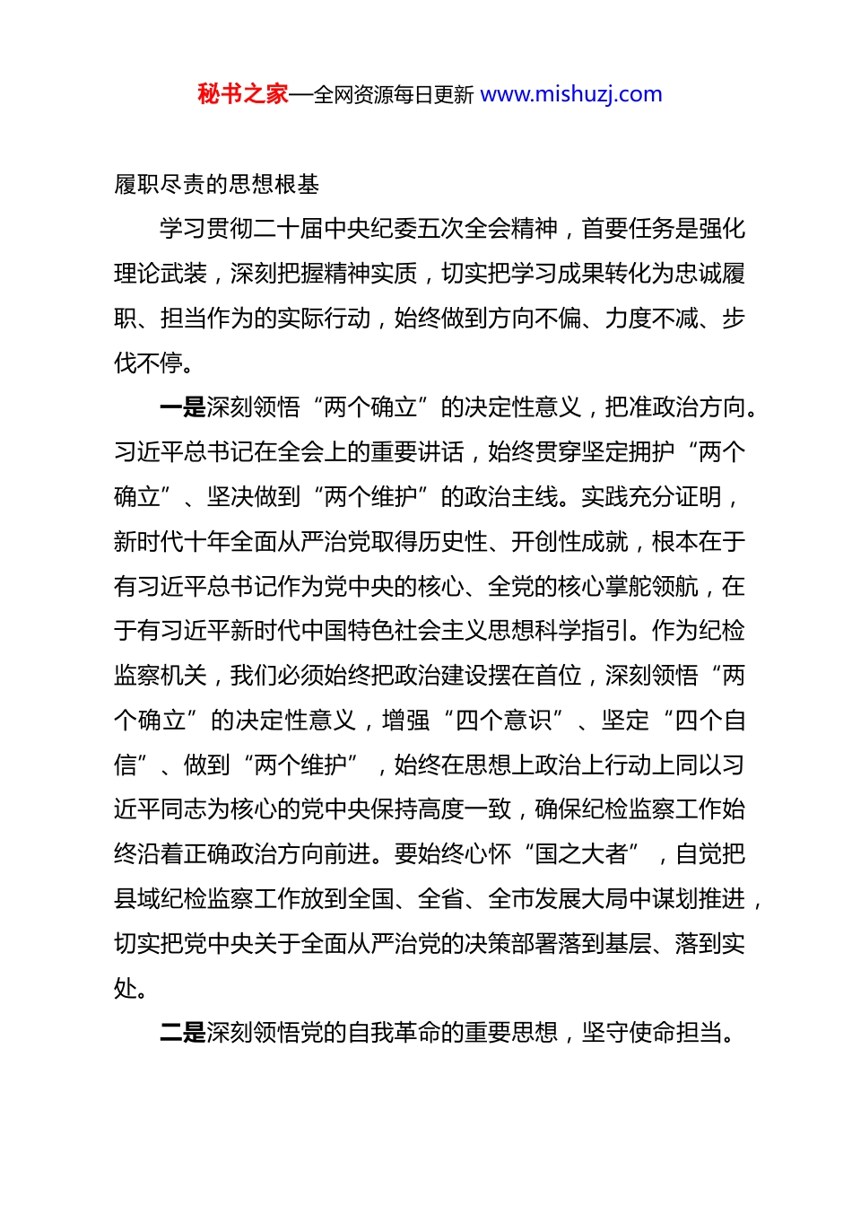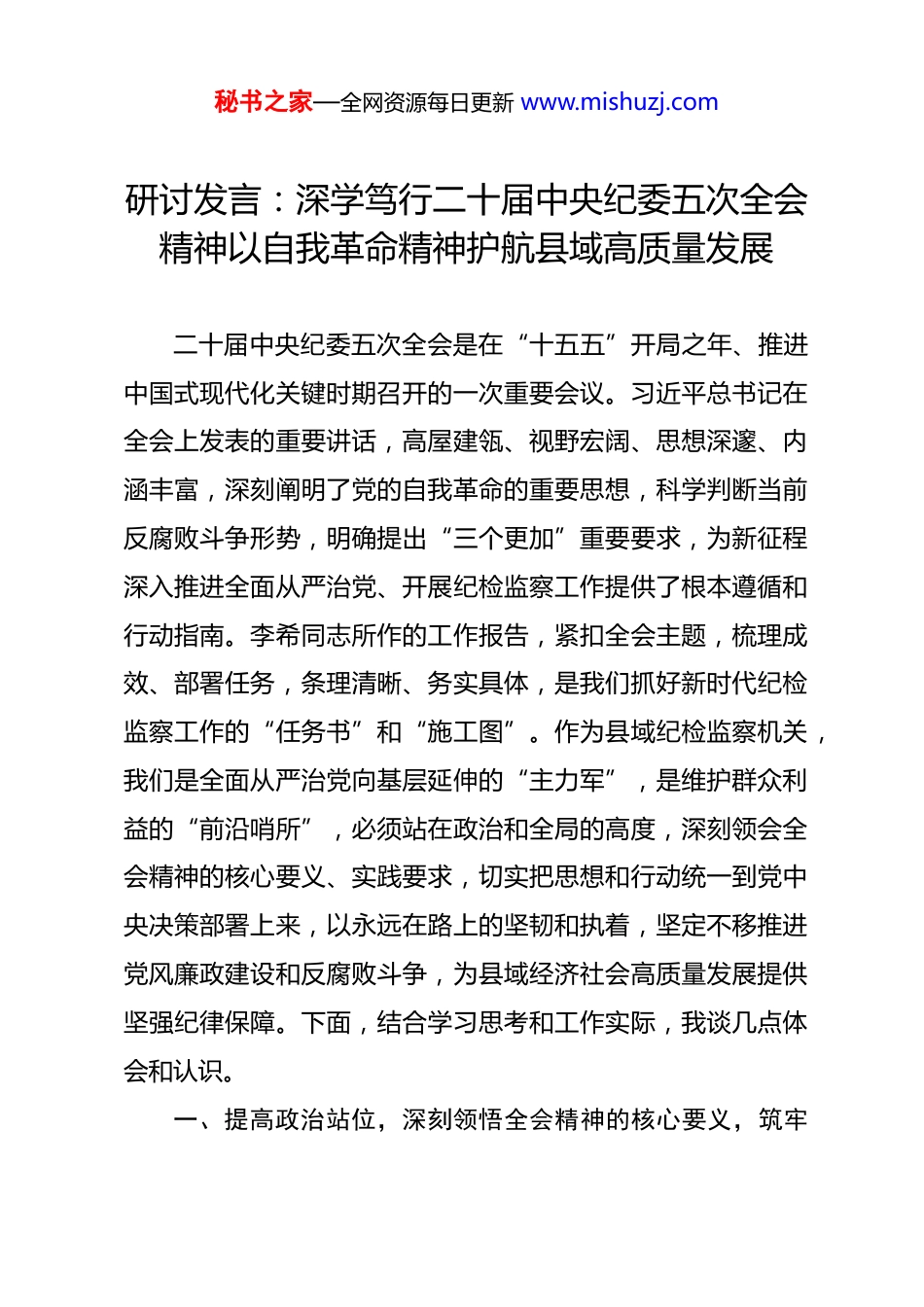 秘书之家—全网资源每日更新 www.mishuzj.com研讨发言:深学笃行二十届中央纪委五次全会精神以自我革命精神护航县域高质量发展 二十届中央纪委五次全会是在“十五五”开局之年、推进中国式现代化关键时期召开的一次重要会议。习近平总书记在全会上发表的重要讲话,高屋建瓴、视野宏阔、思想深邃、内涵丰富,深刻阐明了党的自我革命的重要思想,科学判断当前反腐败斗争形势,明确提出“三个更加”重要要求,为新征程深入推进全面从严治党、开展纪检监察工作提供了根本遵循和行动指南。李希同志所作的工作报告,紧扣全会主题,梳理成效、部署任务,条理清晰、务实具体,是我们抓好新时代纪检监察工作的“任务书”和“施工图”。作为县域纪检监察机关,我们是全面从严治党向基层延伸的“主力军”,是维护群众利益的“前沿哨所”,必须站在政治和全局的高度,深刻领会全会精神的核心要义、实践要求,切实把思想和行动统一到党中央决策部署上来,以永远在路上的坚韧和执着,坚定不移推进党风廉政建设和反腐败斗争,为县域经济社会高质量发展提供坚强纪律保障。下面,结合学习思考和工作实际,我谈几点体会和认识。一、提高政治站位,深刻领悟全会精神的核心要义,筑牢秘书之家—全网资源每日更新 www.mishuzj.com履职尽责的思想根基学习贯彻二十届中央纪委五次全会精神,首要任务是强化理论武装,深刻把握精神实质,切实把学习成果转化为忠诚履职、担当作为的实际行动,始终做到方向不偏、力度不减、步伐不停。一是深刻领悟“两个确立”的决定性意义,把准政治方向。习近平总书记在全会上的重要讲话,始终贯穿坚定拥护“两个确立”、坚决做到“两个维护”的政治主线。实践充分证明,新时代十年全面从严治党取得历史性、开创性成就,根本在于有习近平总书记作为党中央的核心、全党的核心掌舵领航,在于有习近平新时代中国特色社会主义思想科学指引。作为纪检监察机关,我们必须始终把政治建设摆在首位,深刻领悟“两个确立”的决定性意义,增强“四个意识”、坚定“四个自信”、做到“两个维护”,始终在思想上政治上行动上同以习近平同志为核心的党中央保持高度一致,确保纪检监察工作始终沿着正确政治方向前进。要始终心怀“国之大者”,自觉把县域纪检监察工作放到全国、全省、全市发展大局中谋划推进,切实把党中央关于全面从严治党的决策部署落到基层、落到实处。二是深刻领悟党的自我革命的重要思想,坚守使命担当。秘书之家—全网资源每日更新 www.mishuzj.com全会深刻阐释了党的自我革命的重要思想,明确提出“四个深刻把握、四个坚定不移”的工作思路,为我们深入推进全面从严治党提供了行动遵循。党的自我革命是跳出治乱兴衰历史周期率的第二个答案,纪检监察机关作为推进党的自我革命的重要力量,必须深刻把握自我革命的内涵要义、实践路径,始终保持正视问题的自觉和刀刃向内的勇气,以自我革命精神推进纪检监察工作高质量发展。要深刻认识到,全面从严治党永远在路上,党的自我革命永远在路上,不能有松劲歇脚、疲劳厌战的情绪,必须以“永远在路上”的坚韧和执着,把党的自我革命进行到底。三是深刻领悟“三个更加”重要要求,强化行动自觉。习近平总书记在全会上提出的“更加坚决有力地贯彻落实党中央重大决策部署,更加科学有效地把权力关进制度笼子,更加清醒坚定地推进反腐败斗争”重要要求,是新时代纪检监察工作的行动指南。我们要准确把握“三个更加”的内在逻辑和实践要求,切实把“更加坚决有力”的要求体现到政治监督全过程,把“更加科学有效”的要求落实到权力监督各环节,把“更加清醒坚定”的要求贯穿到反腐败斗争各方面,以更高标准、更实举措推进全面从严治党,切实把全会精神转化为护航县域高质量发展的具体实践。秘书之家—全网资源每日更新 www.mishuzj.com四是深刻领悟“六个强化”任务部署,细化工作举措。全会部署的“强化政治监督、强化正风肃纪、强化标本兼治、强化执纪执法为民、强化政治巡视、强化铁军意识”六项重点任务,脉络清晰、重点突出,为我们明确了工作着力点。作为县级纪检监察机关,我们要结合县域实际,把“六个强化”任务细化...