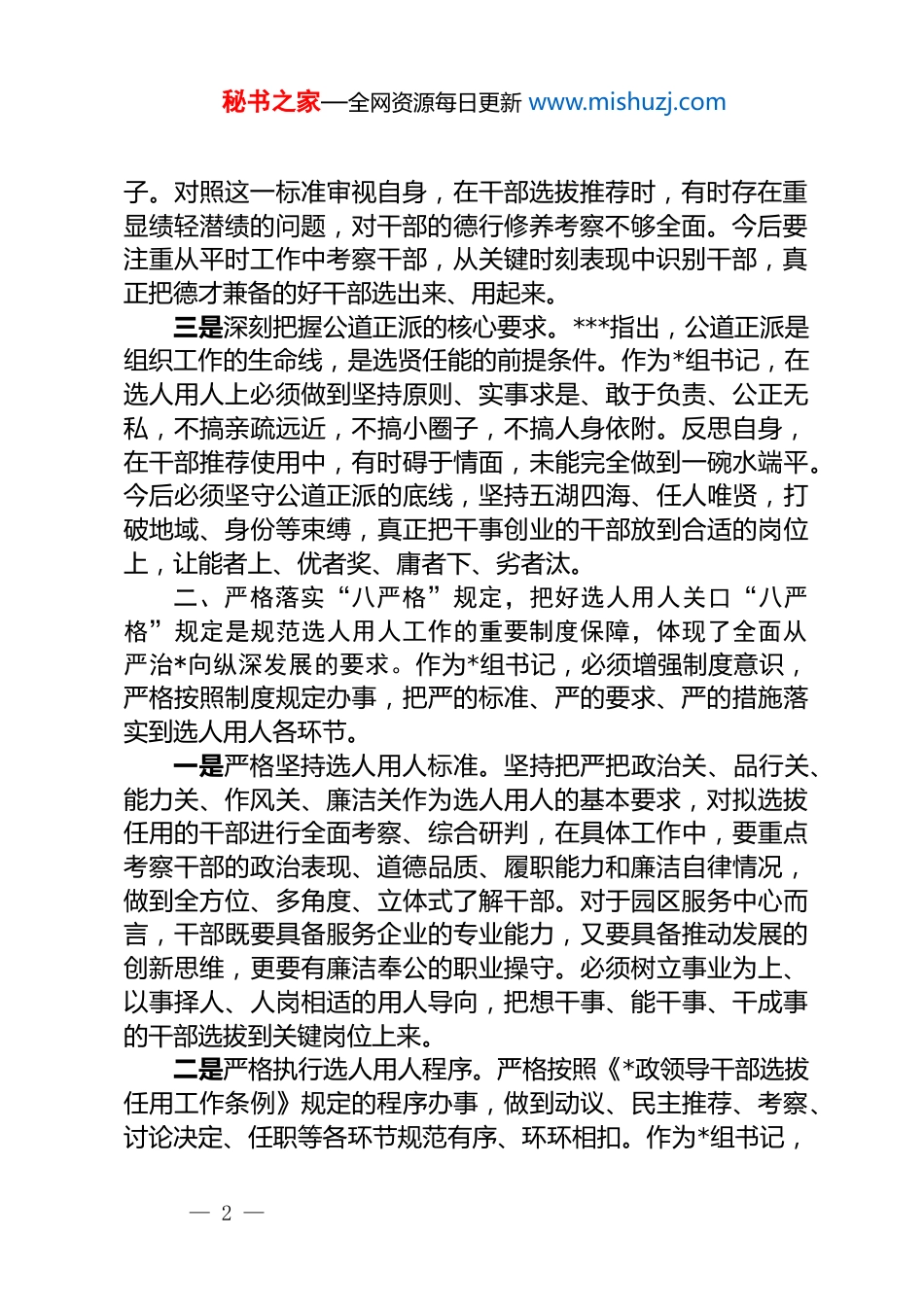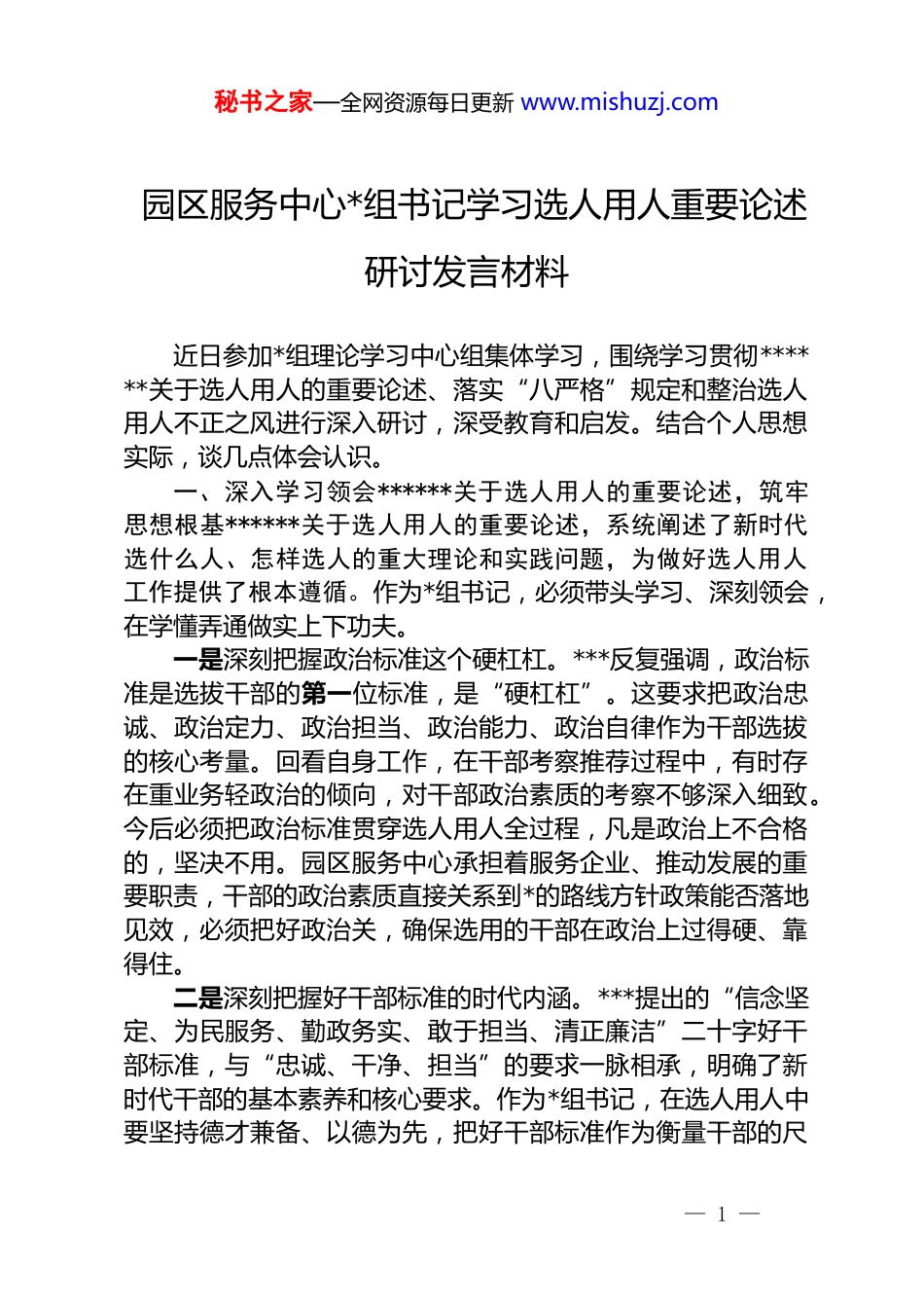 秘书之家—全网资源每日更新 www.mishuzj.com园区服务中心*组书记学习选人用人重要论述研讨发言材料近日参加*组理论学习中心组集体学习,围绕学习贯彻******关于选人用人的重要论述、落实“八严格”规定和整治选人用人不正之风进行深入研讨,深受教育和启发。结合个人思想实际,谈几点体会认识。一、深入学习领会******关于选人用人的重要论述,筑牢思想根基******关于选人用人的重要论述,系统阐述了新时代选什么人、怎样选人的重大理论和实践问题,为做好选人用人工作提供了根本遵循。作为*组书记,必须带头学习、深刻领会,在学懂弄通做实上下功夫。一是深刻把握政治标准这个硬杠杠。***反复强调,政治标准是选拔干部的第一位标准,是“硬杠杠”。这要求把政治忠诚、政治定力、政治担当、政治能力、政治自律作为干部选拔的核心考量。回看自身工作,在干部考察推荐过程中,有时存在重业务轻政治的倾向,对干部政治素质的考察不够深入细致。今后必须把政治标准贯穿选人用人全过程,凡是政治上不合格的,坚决不用。园区服务中心承担着服务企业、推动发展的重要职责,干部的政治素质直接关系到*的路线方针政策能否落地见效,必须把好政治关,确保选用的干部在政治上过得硬、靠得住。二是深刻把握好干部标准的时代内涵。***提出的“信念坚定、为民服务、勤政务实、敢于担当、清正廉洁”二十字好干部标准,与“忠诚、干净、担当”的要求一脉相承,明确了新时代干部的基本素养和核心要求。作为*组书记,在选人用人中要坚持德才兼备、以德为先,把好干部标准作为衡量干部的尺— 1 —秘书之家—全网资源每日更新 www.mishuzj.com子。对照这一标准审视自身,在干部选拔推荐时,有时存在重显绩轻潜绩的问题,对干部的德行修养考察不够全面。今后要注重从平时工作中考察干部,从关键时刻表现中识别干部,真正把德才兼备的好干部选出来、用起来。三是深刻把握公道正派的核心要求。***指出,公道正派是组织工作的生命线,是选贤任能的前提条件。作为*组书记,在选人用人上必须做到坚持原则、实事求是、敢于负责、公正无私,不搞亲疏远近,不搞小圈子,不搞人身依附。反思自身,在干部推荐使用中,有时碍于情面,未能完全做到一碗水端平。今后必须坚守公道正派的底线,坚持五湖四海、任人唯贤,打破地域、身份等束缚,真正把干事创业的干部放到合适的岗位上,让能者上、优者奖、庸者下、劣者汰。二、严格落实“八严格”规定,把好选人用人关口“八严格”规定是规范选人用人工作的重要制度保障,体现了全面从严治*向纵深发展的要求。作为*组书记,必须增强制度意识,严格按照制度规定办事,把严的标准、严的要求、严的措施落实到选人用人各环节。一是严格坚持选人用人标准。坚持把严把政治关、品行关、能力关、作风关、廉洁关作为选人用人的基本要求,对拟选拔任用的干部进行全面考察、综合研判,在具体工作中,要重点考察干部的政治表现、道德品质、履职能力和廉洁自律情况,做到全方位、多角度、立体式了解干部。对于园区服务中心而言,干部既要具备服务企业的专业能力,又要具备推动发展的创新思维,更要有廉洁奉公的职业操守。必须树立事业为上、以事择人、人岗相适的用人导向,把想干事、能干事、干成事的干部选拔到关键岗位上来。二是严格执行选人用人程序。严格按照《*政领导干部选拔任用工作条例》规定的程序办事,做到动议、民主推荐、考察、讨论决定、任职等各环节规范有序、环环相扣。作为*组书记,— 2 —秘书之家—全网资源每日更新 www.mishuzj.com要带头执行民主集中制,坚持集体讨论决定干部任免事项,不搞个人说了算。在干部选拔任用中,要认真落实干部选拔任用工作回避制度、干部选拔任用工作有关事项报告制度等规定,确保程序合规、过程透明。同时,要注重加强干部日常教育管理监督,对苗头性、倾向性问题早发现、早提醒、早纠正,防止小问题演变成大错误。三是严格强化选人用人监督。选人用人的权力必须在监督下运行。作为*组书记,要自觉接受组织监督和群众监督,对干部选拔任用工作中的违规违纪行为零容忍。要建立健全选人用人工作纪实制度,做到有据可查、责任可...