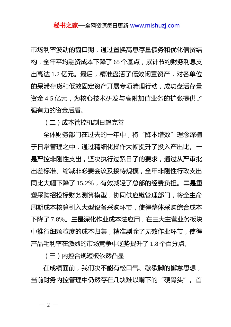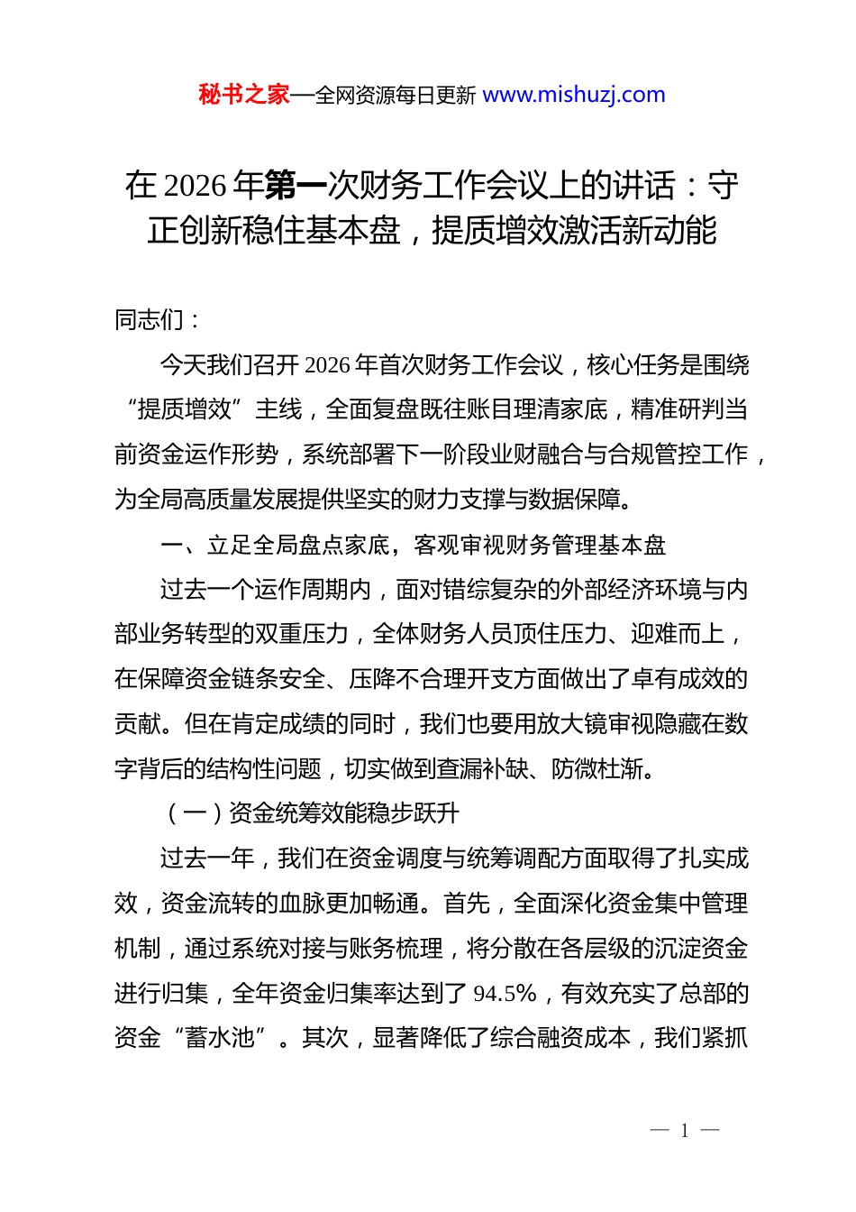 秘书之家—全网资源每日更新 www.mishuzj.com在 2026 年第一次财务工作会议上的讲话:守正创新稳住基本盘,提质增效激活新动能同志们:今天我们召开 2026 年首次财务工作会议,核心任务是围绕“提质增效”主线,全面复盘既往账目理清家底,精准研判当前资金运作形势,系统部署下一阶段业财融合与合规管控工作,为全局高质量发展提供坚实的财力支撑与数据保障。一、立足全局盘点家底,客观审视财务管理基本盘过去一个运作周期内,面对错综复杂的外部经济环境与内部业务转型的双重压力,全体财务人员顶住压力、迎难而上,在保障资金链条安全、压降不合理开支方面做出了卓有成效的贡献。但在肯定成绩的同时,我们也要用放大镜审视隐藏在数字背后的结构性问题,切实做到查漏补缺、防微杜渐。(一)资金统筹效能稳步跃升过去一年,我们在资金调度与统筹调配方面取得了扎实成效,资金流转的血脉更加畅通。首先,全面深化资金集中管理机制,通过系统对接与账务梳理,将分散在各层级的沉淀资金进行归集,全年资金归集率达到了 94.5%,有效充实了总部的资金“蓄水池”。其次,显著降低了综合融资成本,我们紧抓— 1 —秘书之家—全网资源每日更新 www.mishuzj.com市场利率波动的窗口期,通过置换高息存量债务和优化信贷结构,全年平均融资成本下降了 65 个基点,累计节约财务利息支出高达 1.2 亿元。最后,精准盘活了低效闲置资产,对各单位的呆滞存货和低效固定资产开展专项清理行动,成功盘活存量资金 4.5 亿元,为核心技术研发与高附加值业务的扩张提供了强有力的资金后盾。(二)成本管控机制日趋完善全体财务部门在过去的一年中,将“降本增效”理念深植于日常管理之中,通过精细化操作大幅提升了投入产出比。一是严控非刚性支出,坚决执行过紧日子的要求,通过从严审批出差标准、缩减非必要会议及接待规模,全年非刚性行政支出同比大幅下降了 15.2%,有效减轻了总部的经费负担。二是重塑采购招投标财务测算模型,协同供应链管理部门,将全生命周期成本核算引入大型设备采购环节,使得整体采购综合成本下降了 7.8%。三是深化作业成本法应用,在三大主营业务板块中推行细颗粒度的成本归集,精准剔除了无效作业环节,使得产品毛利率在激烈的市场竞争中逆势提升了 1.8 个百分点。(三)内控合规短板依然凸显在成绩面前,我们决不能有松口气、歇歇脚的懈怠思想,当前财务内控管理中仍然存在几块难以啃下的“硬骨头”。首— 2 —秘书之家—全网资源每日更新 www.mishuzj.com先,部分基层单位账实不符的问题尚未彻底绝迹,特别是在偏远分支机构的资产盘点中,依然存在折旧计提滞后、资产调拨未及时入账的现象,严重影响了集团资产负债表的真实性。其次,日常报销审批流程依然存在堵点,由于前端业务人员对财务规范理解不透,加之审批节点设置过长,单笔常规费用的平均报销周期长达 8.4 天,引发了业务部门的诸多不满。最后,合同履约的财务复核机制流于形式,在个别重大采购合同中,财务人员未察觉付款条款中的隐蔽性风险,直接导致了三起不必要的预付款追讨纠纷,这些问题必须在接下来的工作中坚决予以纠正。二、聚焦主责把控风险,系统构建合规内控新屏障风险防控是财务工作不可逾越的红线与生命线。在新的一年里,我们必须变事后补救为事前预防,全面升级内控合规管理体系,用制度的笼子锁住资金流转的潜在风险,确保全局基业长青。(一)织密制度体系防控网络合规管理的前提是做到有章可循、有规可依。一是全面启动财务制度体系的梳理与完善工作,针对已经过时或不适应新业务模式的旧规定,坚决予以废止或修订,全年计划出台包含预算执行、资金审批、资产处置等领域的 15 项核心财务新规。— 3 —秘书之家—全网资源每日更新 www.mishuzj.com二是编制标准化财务授权操作手册,依据岗位的权责大小,科学设定不同层级的资金审批权限,彻底消除越权审批和人情审批的制度漏洞。三是建立动态合规预警模型,结合最新颁布的财税法律法规,对现有的业务合同模板和发票管理流程进行合规性穿透测试,确保所有的财务处理动作都能完美契合现行法律法规的要求。(二)筑...