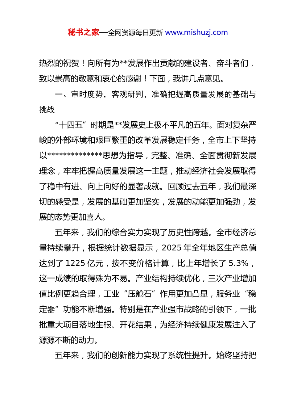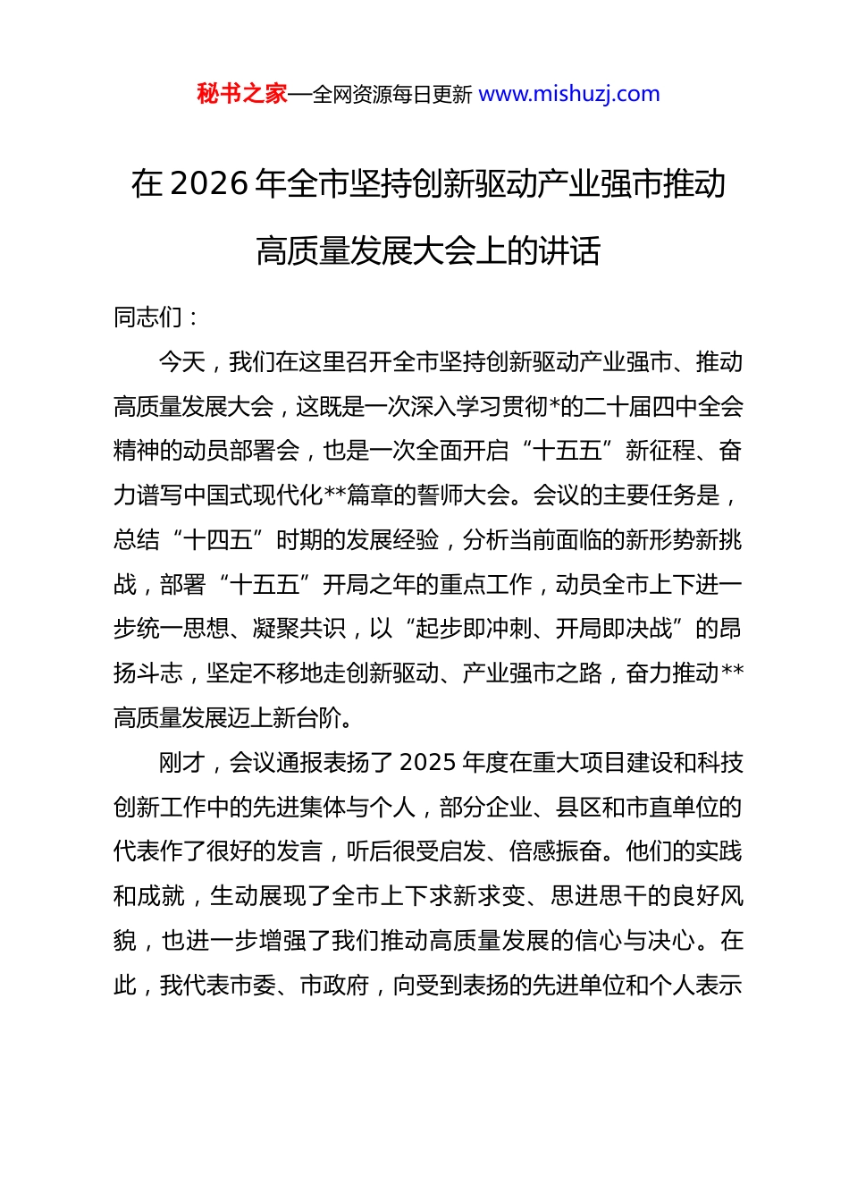 秘书之家—全网资源每日更新 www.mishuzj.com在 2026 年全市坚持创新驱动产业强市推动高质量发展大会上的讲话同志们:今天,我们在这里召开全市坚持创新驱动产业强市、推动高质量发展大会,这既是一次深入学习贯彻*的二十届四中全会精神的动员部署会,也是一次全面开启“十五五”新征程、奋力谱写中国式现代化**篇章的誓师大会。会议的主要任务是,总结“十四五”时期的发展经验,分析当前面临的新形势新挑战,部署“十五五”开局之年的重点工作,动员全市上下进一步统一思想、凝聚共识,以“起步即冲刺、开局即决战”的昂扬斗志,坚定不移地走创新驱动、产业强市之路,奋力推动**高质量发展迈上新台阶。刚才,会议通报表扬了 2025 年度在重大项目建设和科技创新工作中的先进集体与个人,部分企业、县区和市直单位的代表作了很好的发言,听后很受启发、倍感振奋。他们的实践和成就,生动展现了全市上下求新求变、思进思干的良好风貌,也进一步增强了我们推动高质量发展的信心与决心。在此,我代表市委、市政府,向受到表扬的先进单位和个人表示秘书之家—全网资源每日更新 www.mishuzj.com热烈的祝贺!向所有为**发展作出贡献的建设者、奋斗者们,致以崇高的敬意和衷心的感谢!下面,我讲几点意见。一、审时度势,客观研判,准确把握高质量发展的基础与挑战“十四五”时期是**发展史上极不平凡的五年。面对复杂严峻的外部环境和艰巨繁重的改革发展稳定任务,全市上下坚持以**************思想为指导,完整、准确、全面贯彻新发展理念,牢牢把握高质量发展这一主题,推动经济社会发展取得了稳中有进、向上向好的显著成就。回顾过去五年,我们最深切的感受是,发展的基础更加坚实,发展的动能更加强劲,发展的态势更加喜人。五年来,我们的综合实力实现了历史性跨越。全市经济总量持续攀升,根据统计数据显示,2025 年全年地区生产总值达到了 1225 亿元,按不变价格计算,比上年增长了 5.3%,这一成绩的取得殊为不易。产业结构持续优化,三次产业增加值比例更趋合理,工业“压舱石”作用更加凸显,服务业“稳定器”功能不断增强。特别是在产业强市战略的引领下,一批批重大项目落地生根、开花结果,为经济持续健康发展注入了源源不断的动力。五年来,我们的创新能力实现了系统性提升。始终坚持把秘书之家—全网资源每日更新 www.mishuzj.com创新作为引领发展的第一动力,深入实施创新驱动发展战略。全社会研发投入强度逐年提高,2023 年研发投入增速位居全省前列,创新活力竞相迸发。“政产学研金服用”融合发展机制不断完善,高新技术企业数量实现翻番式增长,从 2020 年的 154 家增加到 2024 年的 413 家,国家级专精特新“小巨人”企业、省级专精特新企业不断涌现。创新平台的能级持续提升,为产业技术突破和成果转化提供了有力支撑。五年来,我们的城乡面貌实现了格局性变化。坚持以开放促发展,积极融入长三角一体化发展等国家战略,城市发展的格局正经历着从区域小格局向开放大舞台的深刻转变。基础设施建设日新月异,生态环境质量持续改善,人民群众的获得感、幸福感、安全感显著增强。这些成绩的取得,是全市人民团结奋斗、顽强拼搏的结果,为我们迈向“十五五”、开启新征程奠定了坚实基础。在肯定成绩的同时,也必须清醒地认识到,**的发展还处在爬坡过坎的上升期、关键期。对标高质量发展的要求,对标先进地区的实践,我们的差距依然不小,面临的挑战依然严峻。主要体现在:经济总量不大、人均水平偏低的基本市情尚未根本改变;产业层次总体不高,支撑高质量发展的现代产业体系仍需加快构建,特别是战略性新兴产业的规模和竞争力有秘书之家—全网资源每日更新 www.mishuzj.com待进一步提升;科技创新对产业发展的引领和支撑作用还不够强,关键核心技术“卡脖子”问题依然存在,高层次创新人才相对短缺;营商环境与市场主体的期盼相比还有差距,要素保障的瓶颈制约依然突出。认识到这些问题和挑战,不是要我们妄自菲薄、畏缩不前,而是要我们保持清醒、坚定方向,增强忧患意识和进取精神。当前,新一轮科技革命和产业变革深入发展,国家宏观政策持续...