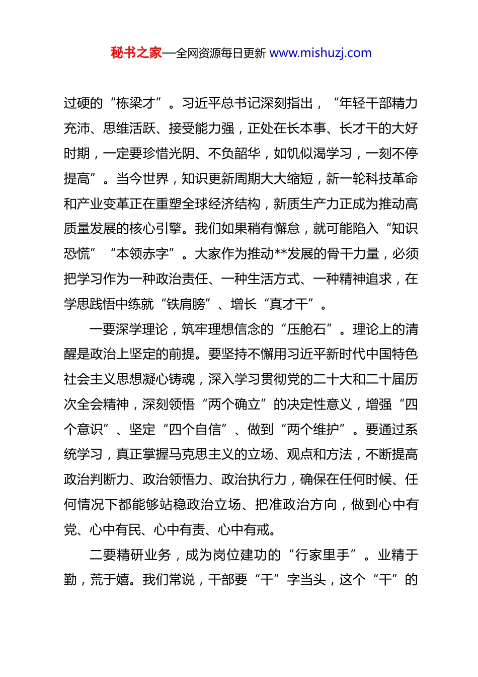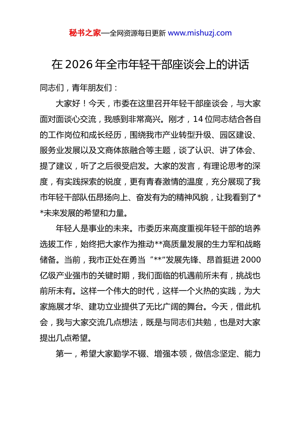 秘书之家—全网资源每日更新 www.mishuzj.com在 2026 年全市年轻干部座谈会上的讲话同志们,青年朋友们:大家好!今天,市委在这里召开年轻干部座谈会,与大家面对面谈心交流,我感到非常高兴。刚才,14 位同志结合各自的工作岗位和成长经历,围绕我市产业转型升级、园区建设、服务业发展以及文商体旅融合等主题,谈了认识、讲了体会、提了建议,听了之后很受启发。大家的发言,有理论思考的深度,有实践探索的锐度,更有青春激情的温度,充分展现了我市年轻干部队伍昂扬向上、奋发有为的精神风貌,让我看到了**未来发展的希望和力量。年轻人是事业的未来。市委历来高度重视年轻干部的培养选拔工作,始终把大家作为推动**高质量发展的生力军和战略储备。当前,我市正处在勇当“**”发展先锋、昂首挺进 2000亿级产业强市的关键时期,我们面临的机遇前所未有,挑战也前所未有。这样一个伟大的时代,这样一个火热的实践,为大家施展才华、建功立业提供了无比广阔的舞台。今天,借此机会,我与大家交流几点想法,既是与同志们共勉,也是对大家提出几点希望。第一,希望大家勤学不辍、增强本领,做信念坚定、能力秘书之家—全网资源每日更新 www.mishuzj.com过硬的“栋梁才”。习近平总书记深刻指出,“年轻干部精力充沛、思维活跃、接受能力强,正处在长本事、长才干的大好时期,一定要珍惜光阴、不负韶华,如饥似渴学习,一刻不停提高”。当今世界,知识更新周期大大缩短,新一轮科技革命和产业变革正在重塑全球经济结构,新质生产力正成为推动高质量发展的核心引擎。我们如果稍有懈怠,就可能陷入“知识恐慌”“本领赤字”。大家作为推动**发展的骨干力量,必须把学习作为一种政治责任、一种生活方式、一种精神追求,在学思践悟中练就“铁肩膀”、增长“真才干”。一要深学理论,筑牢理想信念的“压舱石”。理论上的清醒是政治上坚定的前提。要坚持不懈用习近平新时代中国特色社会主义思想凝心铸魂,深入学习贯彻党的二十大和二十届历次全会精神,深刻领悟“两个确立”的决定性意义,增强“四个意识”、坚定“四个自信”、做到“两个维护”。要通过系统学习,真正掌握马克思主义的立场、观点和方法,不断提高政治判断力、政治领悟力、政治执行力,确保在任何时候、任何情况下都能够站稳政治立场、把准政治方向,做到心中有党、心中有民、心中有责、心中有戒。二要精研业务,成为岗位建功的“行家里手”。业精于勤,荒于嬉。我们常说,干部要“干”字当头,这个“干”的秘书之家—全网资源每日更新 www.mishuzj.com前提就是要“会干”“能干”。大家身处不同领域、不同岗位,都要有“知识付费”的意识,主动对标岗位要求,干什么学什么、缺什么补什么。从事经济工作的同志,要深入研究产业发展规律,熟悉现代金融、数字经济、智能制造等前沿知识,努力成为推动我市产业转型升级的尖兵。从事城市建设和管理工作的同志,要学习先进的规划理念和管理模式,像刚才有同志提到的“公园城市”建设、智慧城市管理等,要深入研究如何让我们的城市更有品位、更具韧性、更富温情。从事群众工作的同志,要学习社会学、心理学知识,掌握更多化解矛盾、服务群众的有效方法。只有钻得深、悟得透,才能在自己的“一亩三分地”里精耕细作,成为让组织放心、让群众信赖的业务骨干。三要博学广识,拓展干事创业的宏大视野。一个人的视野决定了他的格局和高度。年轻干部不能只埋头于自己的一方小天地,要“风声雨声读书声,声声入耳;家事国事天下事,事事关心”。要广泛涉猎经济、政治、文化、社会、生态等各方面知识,关注国内外形势变化,了解科技发展最新动态,学习借鉴其他地区的先进经验。要多读一些文史哲经典,从中汲取智慧、陶冶情操、涵养正气。通过广泛学习,不断优化知识结构,培养战略思维、历史思维、辩证思维、创新思维、法治思秘书之家—全网资源每日更新 www.mishuzj.com维、底线思维,努力使自己成为具备领导现代化建设能力的复合型人才。第二,希望大家担当实干、锐意进取,做起而行之、攻坚克难的“实干家”。青春的底色是奋斗,奋斗的人生才最美丽。衡量一个干部是不是好干部...