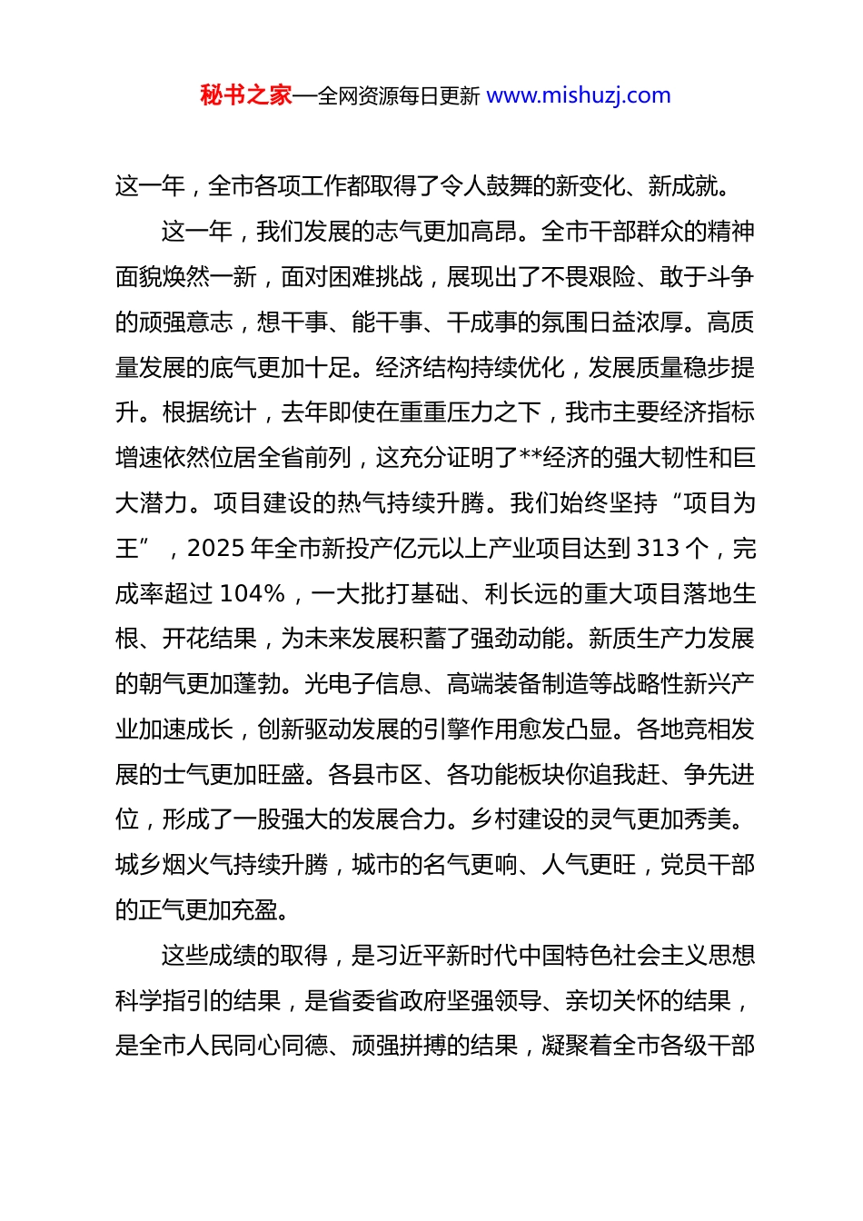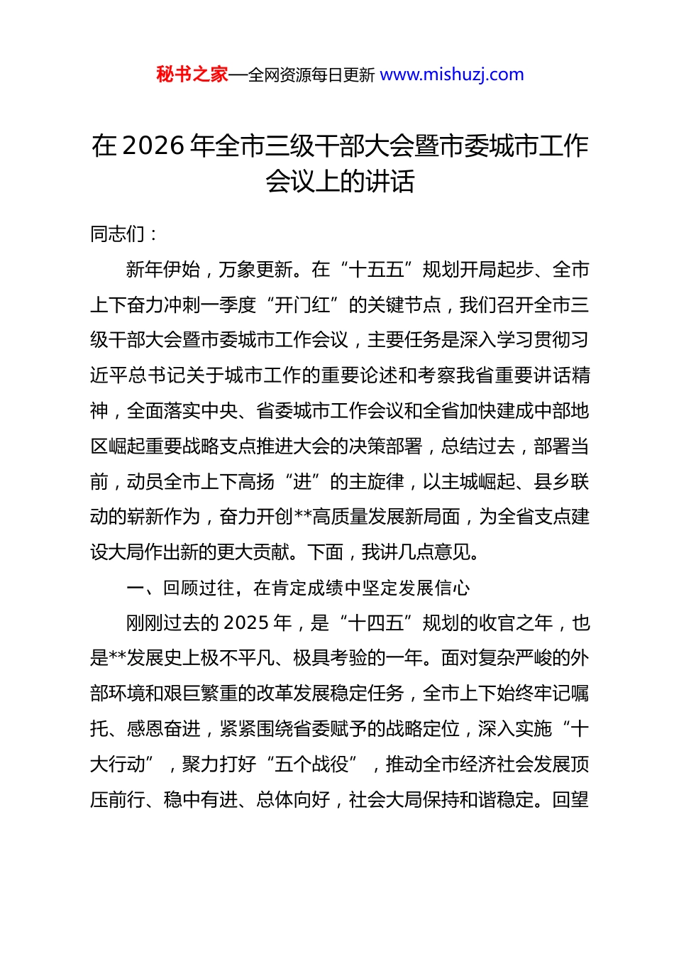 秘书之家—全网资源每日更新 www.mishuzj.com在 2026 年全市三级干部大会暨市委城市工作会议上的讲话同志们:新年伊始,万象更新。在“十五五”规划开局起步、全市上下奋力冲刺一季度“开门红”的关键节点,我们召开全市三级干部大会暨市委城市工作会议,主要任务是深入学习贯彻习近平总书记关于城市工作的重要论述和考察我省重要讲话精神,全面落实中央、省委城市工作会议和全省加快建成中部地区崛起重要战略支点推进大会的决策部署,总结过去,部署当前,动员全市上下高扬“进”的主旋律,以主城崛起、县乡联动的崭新作为,奋力开创**高质量发展新局面,为全省支点建设大局作出新的更大贡献。下面,我讲几点意见。一、回顾过往,在肯定成绩中坚定发展信心刚刚过去的 2025 年,是“十四五”规划的收官之年,也是**发展史上极不平凡、极具考验的一年。面对复杂严峻的外部环境和艰巨繁重的改革发展稳定任务,全市上下始终牢记嘱托、感恩奋进,紧紧围绕省委赋予的战略定位,深入实施“十大行动”,聚力打好“五个战役”,推动全市经济社会发展顶压前行、稳中有进、总体向好,社会大局保持和谐稳定。回望秘书之家—全网资源每日更新 www.mishuzj.com这一年,全市各项工作都取得了令人鼓舞的新变化、新成就。这一年,我们发展的志气更加高昂。全市干部群众的精神面貌焕然一新,面对困难挑战,展现出了不畏艰险、敢于斗争的顽强意志,想干事、能干事、干成事的氛围日益浓厚。高质量发展的底气更加十足。经济结构持续优化,发展质量稳步提升。根据统计,去年即使在重重压力之下,我市主要经济指标增速依然位居全省前列,这充分证明了**经济的强大韧性和巨大潜力。项目建设的热气持续升腾。我们始终坚持“项目为王”,2025 年全市新投产亿元以上产业项目达到 313 个,完成率超过 104%,一大批打基础、利长远的重大项目落地生根、开花结果,为未来发展积蓄了强劲动能。新质生产力发展的朝气更加蓬勃。光电子信息、高端装备制造等战略性新兴产业加速成长,创新驱动发展的引擎作用愈发凸显。各地竞相发展的士气更加旺盛。各县市区、各功能板块你追我赶、争先进位,形成了一股强大的发展合力。乡村建设的灵气更加秀美。城乡烟火气持续升腾,城市的名气更响、人气更旺,党员干部的正气更加充盈。这些成绩的取得,是习近平新时代中国特色社会主义思想科学指引的结果,是省委省政府坚强领导、亲切关怀的结果,是全市人民同心同德、顽强拼搏的结果,凝聚着全市各级干部秘书之家—全网资源每日更新 www.mishuzj.com和广大企业家的智慧与汗水。刚才,会议通报了 2025 年度全市经济发展贡献百强企业名单,并举行了颁证仪式。这些企业是**经济的脊梁,是推动高质量发展的功臣。在此,我代表市委、市政府,向受到表彰的企业家们表示热烈的祝贺!向奋战在全市各条战线上的广大干部群众,致以崇高的敬意和衷心的感谢!成绩来之不易,经验弥足珍贵。在肯定成绩的同时,我们也要清醒地看到,发展不平衡不充分的问题依然存在,主城区的辐射带动能力有待进一步增强,县域经济的支撑作用需要持续巩固,城乡融合发展的体制机制仍需完善。解决这些问题,正是我们今天召开会议,特别是专题研究城市工作的目的所在。二、认清形势,在抢抓机遇中把握战略主动当前,我们正处在百年未有之大变局加速演进的时代,也处在中华民族伟大复兴战略全局的关键时期。省委“新春第一会”发出了加快建成中部地区崛起重要战略支点的动员令,赋予了**“打造省会都市圈副中心城市”的光荣使命。这既是沉甸甸的责任,更是千载难逢的历史机遇。我们要深刻认识到,城市是现代化的重要载体,是构建新发展格局的重要枢纽,是打造副中心的重要支撑。抓城市工作,就是抓发展、抓未来;抓秘书之家—全网资源每日更新 www.mishuzj.com好了城市工作,就等于牵住了高质量发展的“牛鼻子”。近年来,市委、市政府坚定不移实施主城崛起战略,城市建设和发展取得了显著成效。在实践中,我们逐步深化了对城市发展规律的认识,形成了五点重要共识,必须长期坚持、不断完善:第一,必须把主城崛起作为打造副中心的核心引擎。主城不强,...