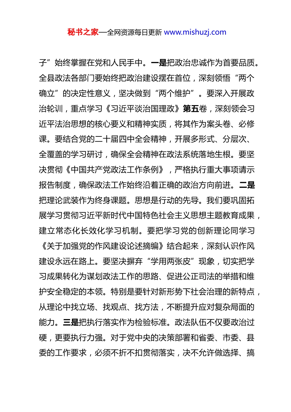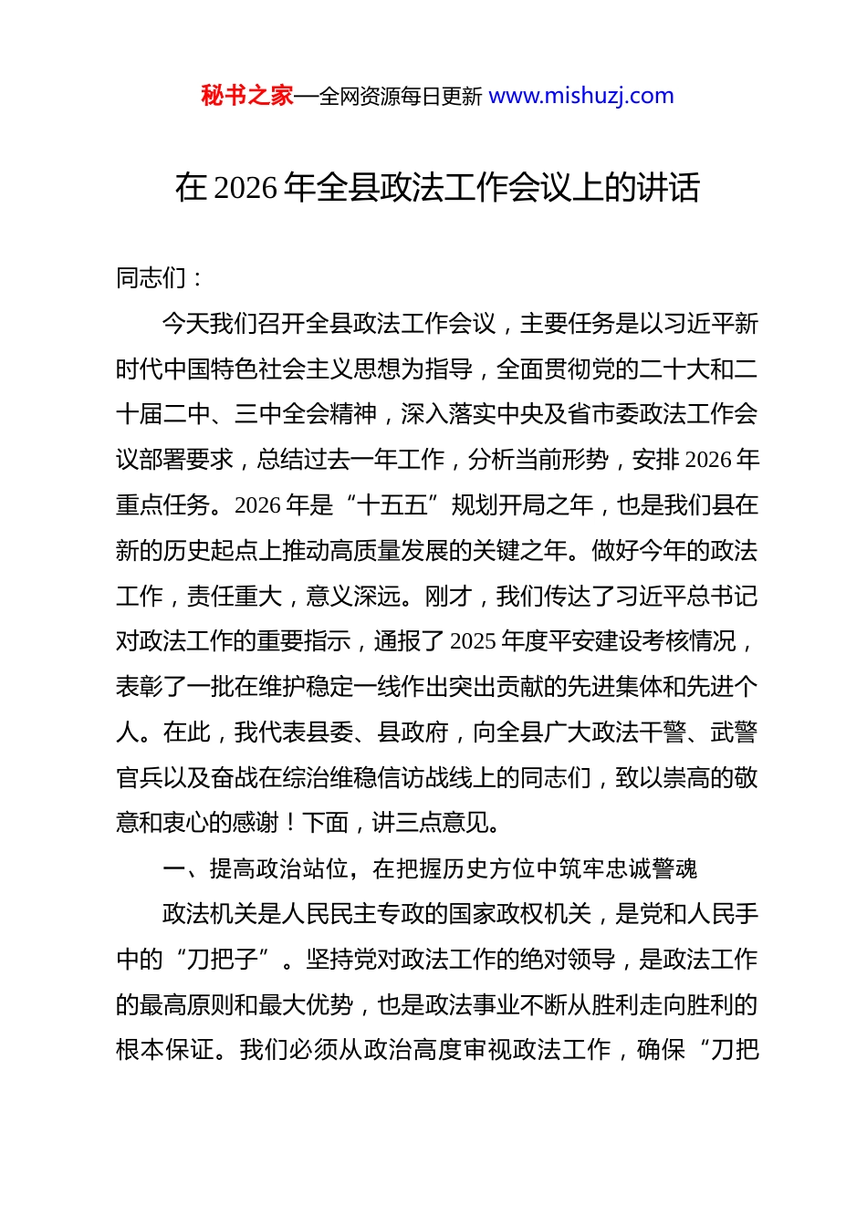 秘书之家—全网资源每日更新 www.mishuzj.com在 2026 年全县政法工作会议上的讲话 同志们:今天我们召开全县政法工作会议,主要任务是以习近平新时代中国特色社会主义思想为指导,全面贯彻党的二十大和二十届二中、三中全会精神,深入落实中央及省市委政法工作会议部署要求,总结过去一年工作,分析当前形势,安排 2026 年重点任务。2026 年是“十五五”规划开局之年,也是我们县在新的历史起点上推动高质量发展的关键之年。做好今年的政法工作,责任重大,意义深远。刚才,我们传达了习近平总书记对政法工作的重要指示,通报了 2025 年度平安建设考核情况,表彰了一批在维护稳定一线作出突出贡献的先进集体和先进个人。在此,我代表县委、县政府,向全县广大政法干警、武警官兵以及奋战在综治维稳信访战线上的同志们,致以崇高的敬意和衷心的感谢!下面,讲三点意见。一、提高政治站位,在把握历史方位中筑牢忠诚警魂政法机关是人民民主专政的国家政权机关,是党和人民手中的“刀把子”。坚持党对政法工作的绝对领导,是政法工作的最高原则和最大优势,也是政法事业不断从胜利走向胜利的根本保证。我们必须从政治高度审视政法工作,确保“刀把秘书之家—全网资源每日更新 www.mishuzj.com子”始终掌握在党和人民手中。一是把政治忠诚作为首要品质。全县政法各部门要始终把政治建设摆在首位,深刻领悟“两个确立”的决定性意义,坚决做到“两个维护”。要深入开展政治轮训,重点学习《习近平谈治国理政》第五卷,深刻领会习近平法治思想的核心要义和精神实质,将其作为案头卷、必修课。要结合党的二十届四中全会精神,开展多形式、分层次、全覆盖的学习研讨,确保全会精神在政法系统落地生根。要坚决贯彻《中国共产党政法工作条例》,严格执行重大事项请示报告制度,确保政法工作始终沿着正确的政治方向前进。二是把理论武装作为终身课题。思想是行动的先导。我们要巩固拓展学习贯彻习近平新时代中国特色社会主义思想主题教育成果,建立常态化长效化学习机制。要把学习党的创新理论同学习《关于加强党的作风建设论述摘编》结合起来,深刻认识作风建设永远在路上。要坚决摒弃“学用两张皮”现象,切实把学习成果转化为谋划政法工作的思路、促进公正司法的举措和维护安全稳定的本领。特别是要针对新形势下社会治理的新特点,从理论中找立场、找观点、找方法,不断提升应对复杂局面的能力。三是把执行落实作为检验标准。政法队伍不仅要政治过硬,更要执行力强。对于党中央的决策部署和省委、市委、县委的工作要求,必须不折不扣贯彻落实,决不允许做选择、搞秘书之家—全网资源每日更新 www.mishuzj.com变通、打折扣。要建立健全政治督察机制,将贯彻执行情况纳入平安建设考核和领导班子年度考核的重要内容,对执行不力、落实不到位的单位和个人,要严肃追责问责。要强化纪律规矩意识,坚决防止“低级红”“高级黑”,确保政法队伍在任何时候、任何情况下都听党指挥、令行禁止。二、聚焦主责主业,在服务发展大局中展现政法担当发展是第一要务,稳定是第一责任。当前,我县正处于“十五五”规划开局的起步期,改革发展稳定的任务繁重而艰巨。政法机关必须主动融入大局、服务大局、保障大局,找准工作的切入点和着力点,以高水平安全保障高质量发展。一是坚决捍卫国家政治安全。政治安全是国家安全的核心。要始终把防范政治安全风险置于首位,严密防范和严厉打击敌对势力渗透破坏颠覆分裂活动。要深化反恐怖斗争,保持对暴恐活动的严打高压态势。要加强意识形态领域阵地管理,坚决维护国家政权安全、制度安全、意识形态安全。要健全完善风险防控机制,对可能影响政治安全的苗头性、倾向性问题,做到早发现、早预警、早处置,坚决筑牢政治安全铜墙铁壁。二是全力维护社会治安稳定。要坚持严打方针不动摇,常态化开展扫黑除恶斗争,对群众反映强烈的电信网络诈骗、跨境赌博、涉枪涉爆等违法犯罪保持凌厉攻势。要深入推进“雪亮工程”和智秘书之家—全网资源每日更新 www.mishuzj.com慧安防小区建设,完善立体化、信息化社会治安防控体系,实现重点部位、场所全覆盖。要坚持和...