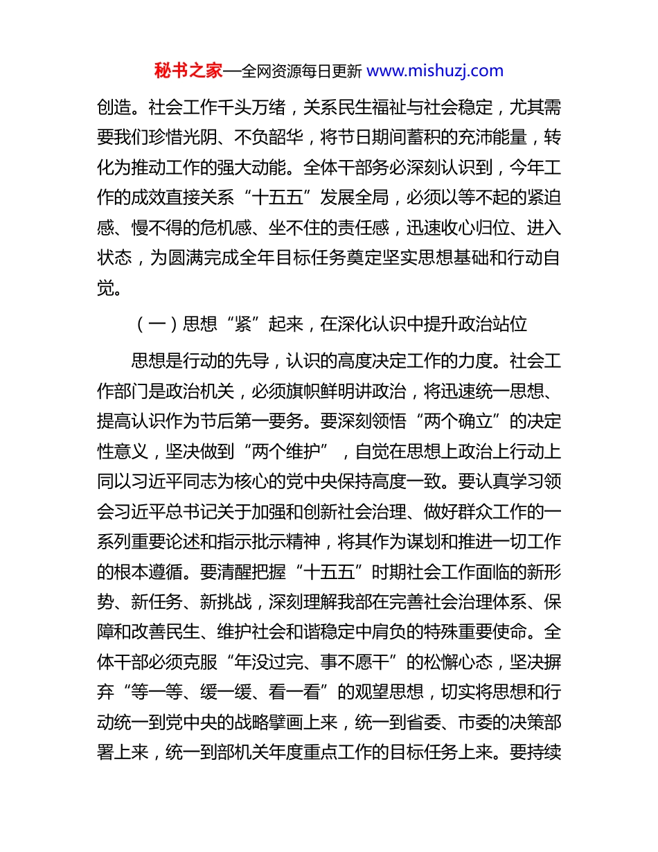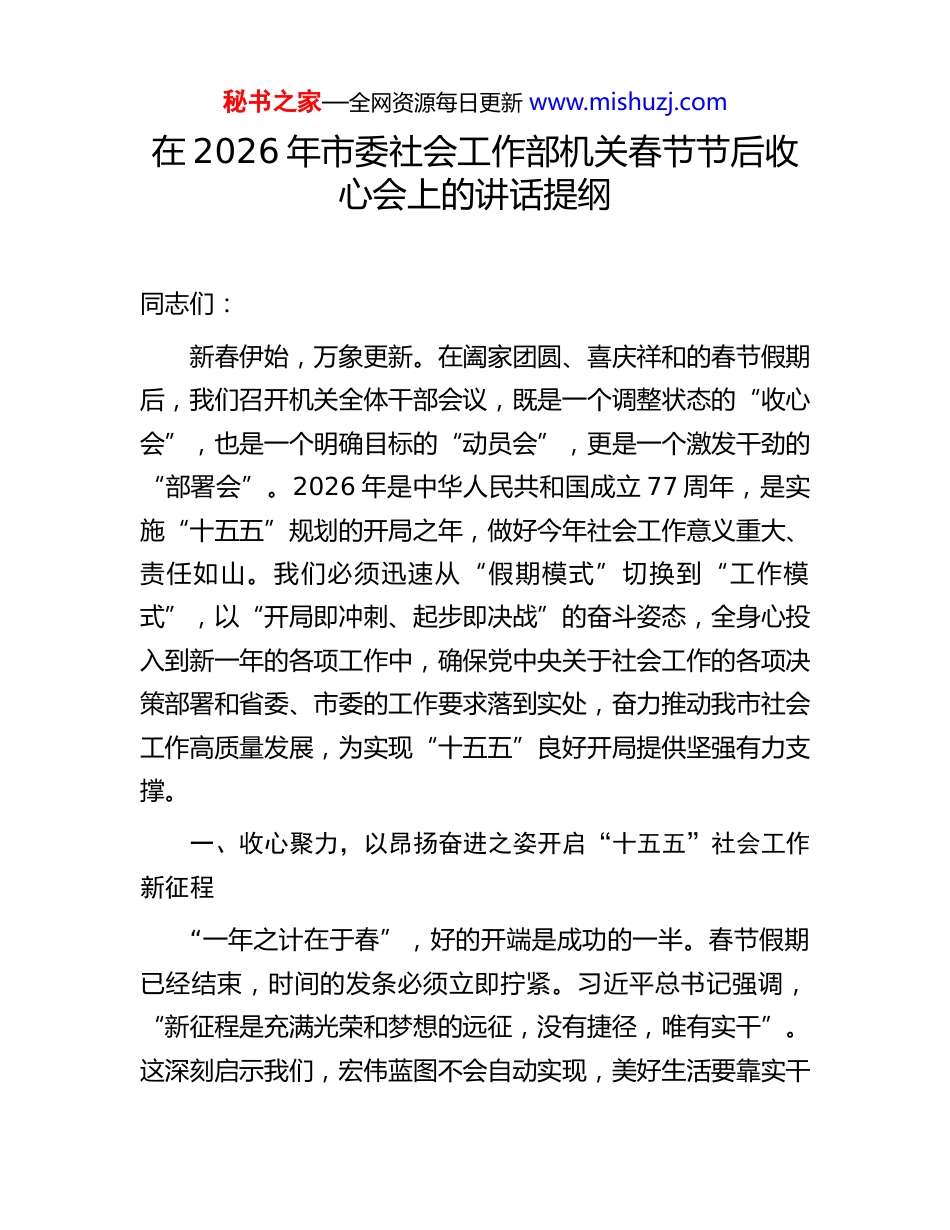 秘书之家—全网资源每日更新 www.mishuzj.com在 2026 年市委社会工作部机关春节节后收心会上的讲话提纲同志们:新春伊始,万象更新。在阖家团圆、喜庆祥和的春节假期后,我们召开机关全体干部会议,既是一个调整状态的“收心会”,也是一个明确目标的“动员会”,更是一个激发干劲的“部署会”。2026 年是中华人民共和国成立 77 周年,是实施“十五五”规划的开局之年,做好今年社会工作意义重大、责任如山。我们必须迅速从“假期模式”切换到“工作模式”,以“开局即冲刺、起步即决战”的奋斗姿态,全身心投入到新一年的各项工作中,确保党中央关于社会工作的各项决策部署和省委、市委的工作要求落到实处,奋力推动我市社会工作高质量发展,为实现“十五五”良好开局提供坚强有力支撑。一、收心聚力,以昂扬奋进之姿开启“十五五”社会工作新征程“一年之计在于春”,好的开端是成功的一半。春节假期已经结束,时间的发条必须立即拧紧。习近平总书记强调,“新征程是充满光荣和梦想的远征,没有捷径,唯有实干”。这深刻启示我们,宏伟蓝图不会自动实现,美好生活要靠实干秘书之家—全网资源每日更新 www.mishuzj.com创造。社会工作千头万绪,关系民生福祉与社会稳定,尤其需要我们珍惜光阴、不负韶华,将节日期间蓄积的充沛能量,转化为推动工作的强大动能。全体干部务必深刻认识到,今年工作的成效直接关系“十五五”发展全局,必须以等不起的紧迫感、慢不得的危机感、坐不住的责任感,迅速收心归位、进入状态,为圆满完成全年目标任务奠定坚实思想基础和行动自觉。(一)思想“紧”起来,在深化认识中提升政治站位思想是行动的先导,认识的高度决定工作的力度。社会工作部门是政治机关,必须旗帜鲜明讲政治,将迅速统一思想、提高认识作为节后第一要务。要深刻领悟“两个确立”的决定性意义,坚决做到“两个维护”,自觉在思想上政治上行动上同以习近平同志为核心的党中央保持高度一致。要认真学习领会习近平总书记关于加强和创新社会治理、做好群众工作的一系列重要论述和指示批示精神,将其作为谋划和推进一切工作的根本遵循。要清醒把握“十五五”时期社会工作面临的新形势、新任务、新挑战,深刻理解我部在完善社会治理体系、保障和改善民生、维护社会和谐稳定中肩负的特殊重要使命。全体干部必须克服“年没过完、事不愿干”的松懈心态,坚决摒弃“等一等、缓一缓、看一看”的观望思想,切实将思想和行动统一到党中央的战略擘画上来,统一到省委、市委的决策部署上来,统一到部机关年度重点工作的目标任务上来。要持续秘书之家—全网资源每日更新 www.mishuzj.com巩固拓展主题教育成果,不断增进对党的创新理论的政治认同、思想认同、理论认同、情感认同,切实提高政治判断力、政治领悟力、政治执行力,确保社会工作始终沿着正确政治方向前进。(二)行动“快”起来,在对标对表中抢占开局先机“道虽迩,不行不至;事虽小,不为不成”。再宏伟的蓝图,不落实就是空中楼阁;再周密的部署,不执行就是纸上谈兵。全国社会工作部长会议已对 2026 年重点工作作出全面部署,我市“十五五”社会工作专项规划的编制工作也已启动。当务之急,是要将上级的“规划图”迅速转化为我们的“施工图”和“时间表”。各科室、各单位要立即组织召开内部会议,对照年度工作要点和上级最新要求,对全年工作任务进行再梳理、再分解、再细化。要明确每项任务的责任人、完成时限和质量标准,建立起清晰明确、环环相扣的责任链条。对于“十五五”规划开局之年的重点任务,如新兴领域党建“两个覆盖”的深化拓展、党建引领基层治理的创新实践、信访工作法治化的深入推进、志愿服务事业的蓬勃发展等,要提前研究、及早谋划,制定出具有前瞻性和可操作性的实施方案。要大力弘扬“马上就办、真抓实干”的作风,对于定下的事情立说立行、紧抓快办,对于部署的工作一抓到底、务求实效,坚决杜绝拖沓敷衍、推诿扯皮,以高效率的“起步”赢得高质量的“开局”。秘书之家—全网资源每日更新 www.mishuzj.com(三)作风“实”起来,在深入一线中展现担当作为社会工作的根基在基层,活力在一线。习...