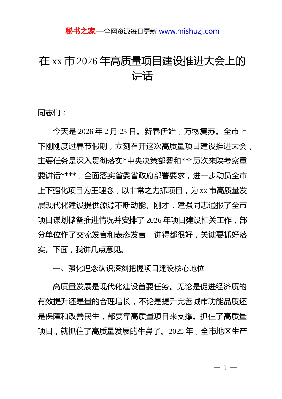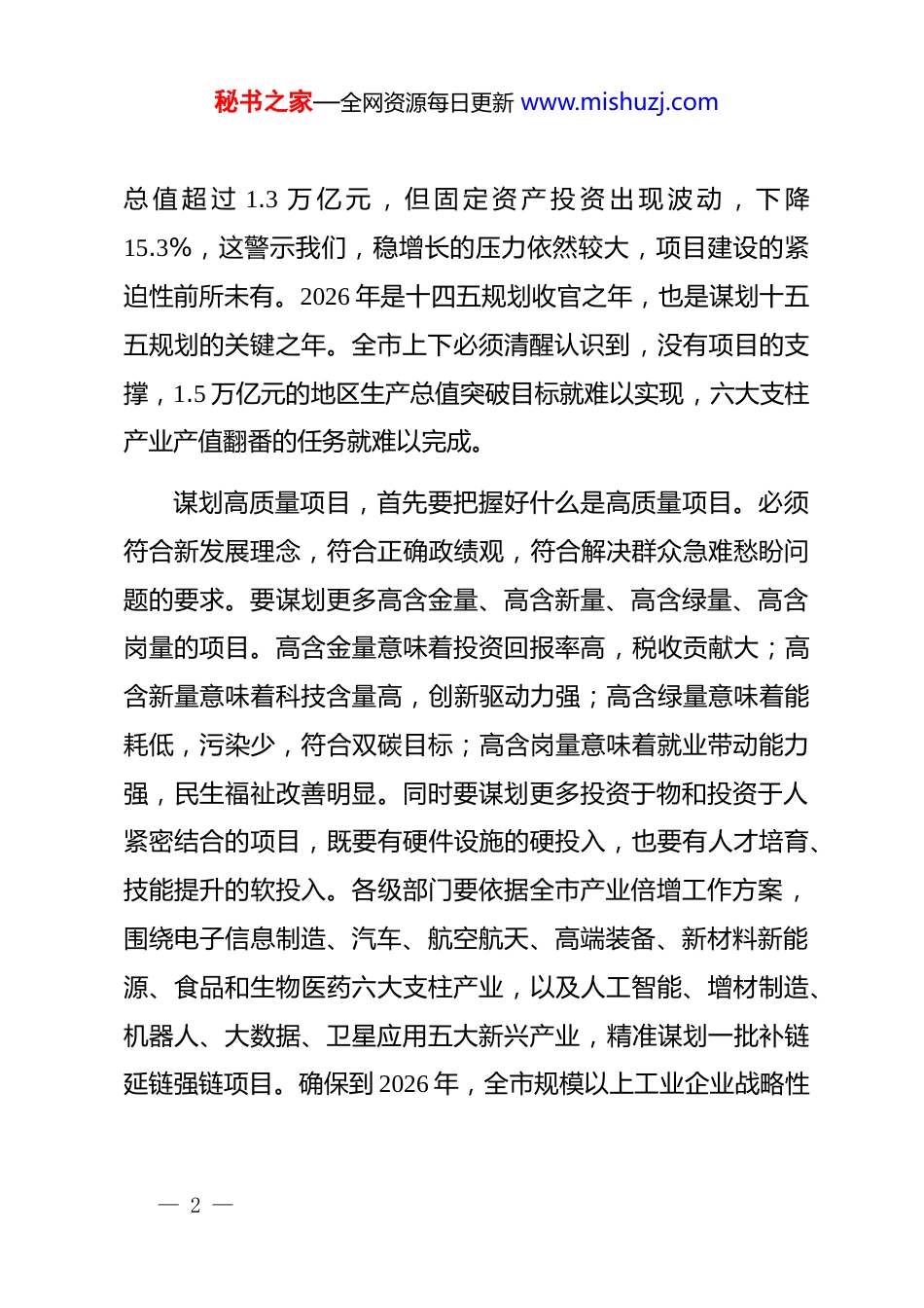 秘书之家—全网资源每日更新 www.mishuzj.com在 xx 市 2026 年高质量项目建设推进大会上的讲话同志们:今天是 2026 年 2 月 25 日。新春伊始,万物复苏。全市上下刚刚度过春节假期,立刻召开这次高质量项目建设推进大会,主要任务是深入贯彻落实*中央决策部署和***历次来陕考察重要讲话****,全面落实省委省政府部署要求,进一步动员全市上下强化项目为王理念,以非常之力抓项目,为 xx 市高质量发展现代化建设提供源源不断动能。刚才,建强同志通报了全市项目谋划储备推进情况并安排了 2026 年项目建设相关工作,部分单位作了交流发言和表态发言,讲得都很好,关键要抓好落实。下面,我讲几点意见。一、强化理念认识深刻把握项目建设核心地位高质量发展是现代化建设首要任务。无论是促进经济质的有效提升还是量的合理增长,不论是提升完善城市功能品质还是保障和改善民生,都要靠高质量项目来支撑。抓住了高质量项目,就抓住了高质量发展的牛鼻子。2025 年,全市地区生产— 1 —秘书之家—全网资源每日更新 www.mishuzj.com总 值 超 过 1.3 万 亿 元 , 但 固 定 资 产 投 资 出 现 波 动 , 下 降15.3%,这警示我们,稳增长的压力依然较大,项目建设的紧迫性前所未有。2026 年是十四五规划收官之年,也是谋划十五五规划的关键之年。全市上下必须清醒认识到,没有项目的支撑,1.5 万亿元的地区生产总值突破目标就难以实现,六大支柱产业产值翻番的任务就难以完成。谋划高质量项目,首先要把握好什么是高质量项目。必须符合新发展理念,符合正确政绩观,符合解决群众急难愁盼问题的要求。要谋划更多高含金量、高含新量、高含绿量、高含岗量的项目。高含金量意味着投资回报率高,税收贡献大;高含新量意味着科技含量高,创新驱动力强;高含绿量意味着能耗低,污染少,符合双碳目标;高含岗量意味着就业带动能力强,民生福祉改善明显。同时要谋划更多投资于物和投资于人紧密结合的项目,既要有硬件设施的硬投入,也要有人才培育、技能提升的软投入。各级部门要依据全市产业倍增工作方案,围绕电子信息制造、汽车、航空航天、高端装备、新材料新能源、食品和生物医药六大支柱产业,以及人工智能、增材制造、机器人、大数据、卫星应用五大新兴产业,精准谋划一批补链延链强链项目。确保到 2026 年,全市规模以上工业企业战略性— 2 —秘书之家—全网资源每日更新 www.mishuzj.com新兴产业总产值占工业总产值比重达到 54%,为经济结构优化升级奠定坚实基础。二、聚焦落地见效全力推动项目转化实施项目谋划是前提,落地见效才是关键。要围绕争取、招引、转化、技改、扩能五个途径,加速项目落地。要积极争取两重两新、中央预算内投资、新型政策性金融工具等资金支持2026 年,国家发改委已下达提前批两重建设项目清单和中央预算内投资计划,共计约 2950 亿元,其中两重建设安排约 2200亿元。全市各级部门要主动对接,精心包装项目,争取更多资金落户 xx 市。要加大招引力度。重点招引世界 500 强企业、行业领军企业、专精特新小巨人企业、制造业单项冠军企业和高水平创新团队。2026 年,全市力争招引产业链项目 110 个以上,签约项目 510 个以上。要畅通科技产业资本循环,强化科技创新和场景牵引无缝衔接,加快科技成果转化。依托秦创原创新驱动平台,推动更多科研成果在本地转化为现实生产力。要引导、鼓励企业加大技改投入,支持本地龙头企业增资扩产、带动链上企业投资。对于新开工民间投资项目,要落实好贷款贴息等优惠政策。根据省级政策,对新开工民间投资项目,最多连续两— 3 —秘书之家—全网资源每日更新 www.mishuzj.com年给予 2 个百分点贷款贴息,单个项目贴息额度不超过 200 万元。高技术产业、制造业等项目贴息比例更高,额度更大。各级部门要广泛宣传,简化流程,确保政策红利直达企业,撬动更多社会资本投入。要推动更多项目滚动落地。建立项目储备库,实行动态管理。对于前期储备项目,要加快前期工作进度,确保具备开工条件。对于在建项目,要加快施工进度,确保按期投产。对于投产项目,要做...