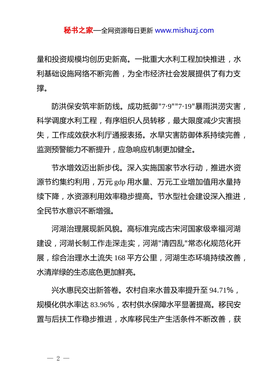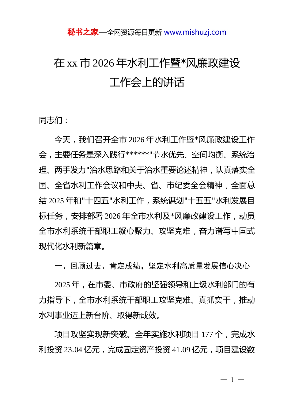 秘书之家—全网资源每日更新 www.mishuzj.com在 xx 市 2026 年水利工作暨*风廉政建设工作会上的讲话同志们:今天,我们召开全市 2026 年水利工作暨*风廉政建设工作会,主要任务是深入践行******"节水优先、空间均衡、系统治理、两手发力"治水思路和关于治水重要论述精神,认真落实全国、全省水利工作会议和中央、省、市纪委全会精神,全面总结 2025 年和"十四五"水利工作,系统谋划"十五五"水利发展目标任务,安排部署 2026 年全市水利及*风廉政建设工作,动员全市水利系统干部职工凝心聚力、攻坚克难,奋力谱写中国式现代化水利新篇章。一、回顾过去、肯定成绩,坚定水利高质量发展信心决心2025 年,在市委、市政府的坚强领导和上级水利部门的有力指导下,全市水利系统干部职工攻坚克难、真抓实干,推动水利事业迈上新台阶、取得新成效。项目攻坚实现新突破。全年实施水利项目 177 个,完成水利投资 23.04 亿元,完成固定资产投资 41.09 亿元,项目建设数— 1 —秘书之家—全网资源每日更新 www.mishuzj.com量和投资规模均创历史新高。一批重大水利工程加快推进,水利基础设施网络不断完善,为全市经济社会发展提供了有力支撑。防洪保安筑牢新防线。成功抵御"7·9""7·19"暴雨洪涝灾害,科学调度水利工程,有序组织人员转移,最大限度减少灾害损失,工作成效获水利厅通报表扬。水旱灾害防御体系持续完善,监测预警能力不断提升,应急响应机制更加健全。节水增效迈出新步伐。深入实施国家节水行动,推进水资源节约集约利用,万元 gdp 用水量、万元工业增加值用水量持续下降,水资源利用效率稳步提高。节水型社会建设深入推进,全民节水意识不断增强。河湖治理展现新风貌。高标准完成古宋河国家级幸福河湖建设,河湖长制工作走深走实,河湖"清四乱"常态化规范化开展,综合治理水土流失 168 平方公里,河湖生态环境持续改善,水清岸绿的生态底色更加鲜亮。兴水惠民交出新答卷。农村自来水普及率提升至 94.71%,规模化供水率达 83.96%,农村供水保障水平显著提高。移民安置与后扶工作稳步推进,水库移民生产生活条件不断改善,获— 2 —秘书之家—全网资源每日更新 www.mishuzj.com得感、幸福感持续增强。作风建设取得新成效。持之以恒正风肃纪,聚焦工程建设、物资采购等重点领域开展专项整治,强化监督执纪问责,推动作风建设走深走实,水利系统政治生态持续向好。回顾"十四五"时期,全市水利事业发展取得显著成就。五年来,水利发展动能持续增强,累计完成水利投资超过 100 亿元,实施水利项目 800 余个,现代水网格局初步形成。水利保障能力全面提升,城乡供水一体化进程加快,农田灌溉条件持续改善。水旱灾害防御更加坚实有力,成功应对多次洪涝干旱灾害,保障了人民群众生命财产安全。水资源利用效率稳步提高,节水型社会建设成效显著。河湖生态底色更加鲜亮,河湖长制全面落实,水土流失综合治理力度加大。水利系统*的建设全面加强,全面从严治*纵深推进,干部队伍作风明显改进。二、正视问题、认清形势,增强做好水利工作的责任感紧迫感在肯定成绩的同时,我们要清醒认识到当前水利工作存在的短板弱项。水资源保障方面,工程性缺水问题仍然突出,水资源配置能力有待提升,部分区域供水保障能力不强。农村供— 3 —秘书之家—全网资源每日更新 www.mishuzj.com水方面,部分供水工程标准不高、规模不大,运行管护机制不够健全,水质保障能力有待加强。防洪减灾方面,部分河流防洪标准偏低,山洪灾害防御能力不足,城市排涝设施建设滞后。幸福河湖建设方面,河湖管护长效机制不够完善,部分河段水环境问题依然存在。水利改革攻坚方面,水务一体化改革推进不够深入,投融资机制创新不足,水权水价改革亟待突破。作风建设方面,个别单位和干部担当精神不足、工作作风不实,形式主义、官僚主义问题仍有发生。这些问题必须引起高度重视,在"十五五"时期切实加以解决。2026 年是"十五五"规划开局之年,也是全面贯彻落实*的二十大精神的关键之年。全市水利系统要切实提高政治站位,强化大局意识、责任意识、攻坚意识,准确把握水利工作面临的形...