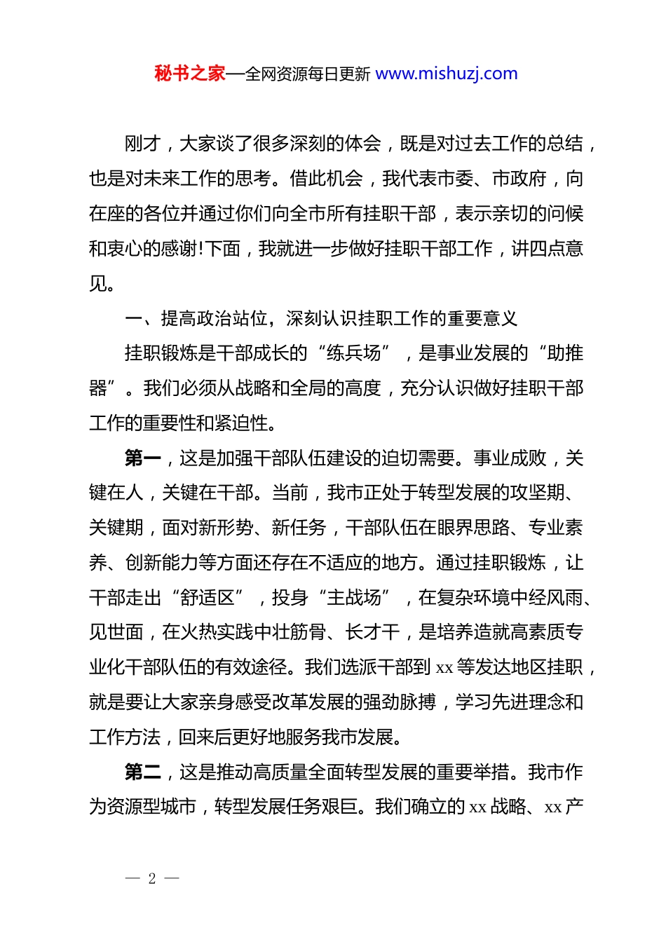 秘书之家—全网资源每日更新 www.mishuzj.com在 xx 市挂职干部座谈会上的讲话同志们:今天,我们在这里召开全市挂职干部座谈会,主要任务是深入学习贯彻******关于干部队伍建设的重要论述,全面总结近年来我市挂职干部工作情况,交流经验做法,听取意见建议,对进一步做好挂职干部工作进行安排部署。刚才,7 名挂职干部代表作了很好的发言,大家讲体会、谈收获、话发展,听了之后很受启发,也很感动。从大家的发言中,我深切感受到挂职干部在基层一线、在发展前沿的辛勤付出和丰硕成果,也看到了年轻干部茁壮成长、勇挑重担的良好风貌。近年来,我市坚持把选派干部挂职锻炼作为加强干部队伍建设的重要举措,作为深化干部作风能力提升年活动的重要载体,牢固树立“干部就是资源、人才就是优势”的理念,统筹推进干部双向挂职、上挂下派、横向交流等工作。我们先后选派了 xx 余名干部到上级对口部门、xx、xx 等发达地区以及对口帮扶地区进行挂职交流。这一大批优秀干部通过挂职锻炼,启迪了思维、开拓了视野、增强了本领,不仅为个人成长积累了宝贵财富,更为推动全市高质量全面转型发展贡献了智慧和力量。— 1 —秘书之家—全网资源每日更新 www.mishuzj.com刚才,大家谈了很多深刻的体会,既是对过去工作的总结,也是对未来工作的思考。借此机会,我代表市委、市政府,向在座的各位并通过你们向全市所有挂职干部,表示亲切的问候和衷心的感谢!下面,我就进一步做好挂职干部工作,讲四点意见。一、提高政治站位,深刻认识挂职工作的重要意义挂职锻炼是干部成长的“练兵场”,是事业发展的“助推器”。我们必须从战略和全局的高度,充分认识做好挂职干部工作的重要性和紧迫性。第一,这是加强干部队伍建设的迫切需要。事业成败,关键在人,关键在干部。当前,我市正处于转型发展的攻坚期、关键期,面对新形势、新任务,干部队伍在眼界思路、专业素养、创新能力等方面还存在不适应的地方。通过挂职锻炼,让干部走出“舒适区”,投身“主战场”,在复杂环境中经风雨、见世面,在火热实践中壮筋骨、长才干,是培养造就高素质专业化干部队伍的有效途径。我们选派干部到 xx 等发达地区挂职,就是要让大家亲身感受改革发展的强劲脉搏,学习先进理念和工作方法,回来后更好地服务我市发展。第二,这是推动高质量全面转型发展的重要举措。我市作为资源型城市,转型发展任务艰巨。我们确立的 xx 战略、xx 产— 2 —秘书之家—全网资源每日更新 www.mishuzj.com业集群建设,需要强有力的智力支持和人才保障。挂职干部不仅是学习取经的“留学生”,更是促进交流合作的“联络员”、推动产业升级的“战斗员”。实践证明,许多挂职干部在招商引资、项目建设、深化改革等方面发挥了独特作用。xx 银行的挂职干部就曾协调引入了 xx 乡村农产品上行和共配中心综合体项目,并入选国家典型案例,这就是挂职干部服务大局、贡献才智的生动写照。第三,这是深化区域交流合作的桥梁纽带。挂职工作不仅是干部的流动,更是信息、技术、项目、资源的流动。我们与xx 等地建立的挂职交流机制,已经超越了单纯的干部培养范畴,成为深化区域合作、实现优势互补的重要平台。特别是第八批赴 xx 挂职干部,精准对接我市产业转型需求,推动两地协作走深走实。大家要珍惜这一平台,在干好本职工作的同时,当好两地友谊的使者,促进更多领域的交流合作。二、珍惜平台机遇,在实践磨砺中锤炼过硬本领挂职时间宝贵,机会难得。大家要倍加珍惜组织提供的机遇,把挂职作为提升能力的“磨刀石”、检验作风的“试金石”,全身心投入工作,努力在挂职期间取得更大收获。一是要在解放思想中提升格局视野。发达地区之所以发展快,首先是思想观念新、体制机制活。大家到了挂职岗位,不— 3 —秘书之家—全网资源每日更新 www.mishuzj.com能只盯着具体的事务性工作,更要透过现象看本质,深入研究当地的发展理念、工作思路、推进机制。要学习他们敢为人先的创新精神、海纳百川的开放胸怀、高效便捷的服务环境。要通过挂职,真正把自己的思维从传统束缚中解放出来,树立与高质量发展相适应的市场意识、法治...