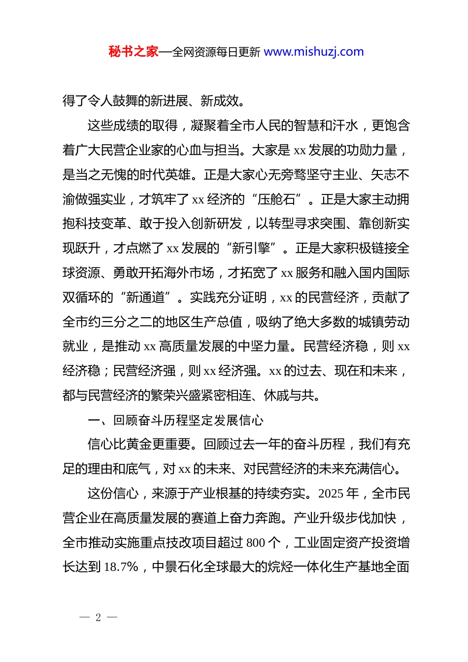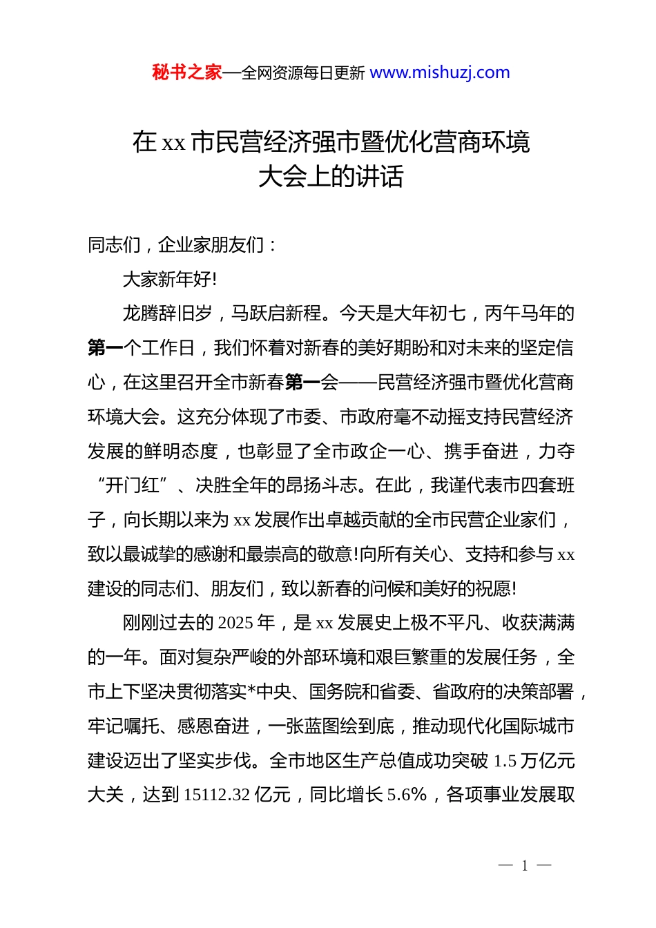 秘书之家—全网资源每日更新 www.mishuzj.com在 xx 市民营经济强市暨优化营商环境大会上的讲话同志们,企业家朋友们:大家新年好!龙腾辞旧岁,马跃启新程。今天是大年初七,丙午马年的第一个工作日,我们怀着对新春的美好期盼和对未来的坚定信心,在这里召开全市新春第一会——民营经济强市暨优化营商环境大会。这充分体现了市委、市政府毫不动摇支持民营经济发展的鲜明态度,也彰显了全市政企一心、携手奋进,力夺“开门红”、决胜全年的昂扬斗志。在此,我谨代表市四套班子,向长期以来为 xx 发展作出卓越贡献的全市民营企业家们,致以最诚挚的感谢和最崇高的敬意!向所有关心、支持和参与 xx建设的同志们、朋友们,致以新春的问候和美好的祝愿!刚刚过去的 2025 年,是 xx 发展史上极不平凡、收获满满的一年。面对复杂严峻的外部环境和艰巨繁重的发展任务,全市上下坚决贯彻落实*中央、国务院和省委、省政府的决策部署,牢记嘱托、感恩奋进,一张蓝图绘到底,推动现代化国际城市建设迈出了坚实步伐。全市地区生产总值成功突破 1.5 万亿元大关,达到 15112.32 亿元,同比增长 5.6%,各项事业发展取— 1 —秘书之家—全网资源每日更新 www.mishuzj.com得了令人鼓舞的新进展、新成效。这些成绩的取得,凝聚着全市人民的智慧和汗水,更饱含着广大民营企业家的心血与担当。大家是 xx 发展的功勋力量,是当之无愧的时代英雄。正是大家心无旁骛坚守主业、矢志不渝做强实业,才筑牢了 xx 经济的“压舱石”。正是大家主动拥抱科技变革、敢于投入创新研发,以转型寻求突围、靠创新实现跃升,才点燃了 xx 发展的“新引擎”。正是大家积极链接全球资源、勇敢开拓海外市场,才拓宽了 xx 服务和融入国内国际双循环的“新通道”。实践充分证明,xx 的民营经济,贡献了全市约三分之二的地区生产总值,吸纳了绝大多数的城镇劳动就业,是推动 xx 高质量发展的中坚力量。民营经济稳,则 xx经济稳;民营经济强,则 xx 经济强。xx 的过去、现在和未来,都与民营经济的繁荣兴盛紧密相连、休戚与共。一、回顾奋斗历程坚定发展信心信心比黄金更重要。回顾过去一年的奋斗历程,我们有充足的理由和底气,对 xx 的未来、对民营经济的未来充满信心。这份信心,来源于产业根基的持续夯实。2025 年,全市民营企业在高质量发展的赛道上奋力奔跑。产业升级步伐加快,全市推动实施重点技改项目超过 800 个,工业固定资产投资增长达到 18.7%,中景石化全球最大的烷烃一体化生产基地全面— 2 —秘书之家—全网资源每日更新 www.mishuzj.com建成投产,为我们的现代化工产业集群注入了强劲动力。创新动能加速集聚,全市民营国家高新技术企业数量达到 4287 家,占全市总量的 95.1%,稳居全省前列;民营企业牵头设立的省级以上重点实验室等高水平创新平台达到 242 家,占据了全市的半壁江山。企业方阵不断壮大,有 11 家民营企业光荣上榜“中国民营企业 500 强”,36 家企业入围“福建省民营企业100 强”,国家级单项冠军企业和专精特新“小巨人”企业数量持续增加。这些坚实的产业基础和强大的企业梯队,是我们应对一切风险挑战的最大底气。这份信心,来源于战略机遇的交汇叠加。当前,新一轮科技革命和产业变革深入发展,国家加快构建新发展格局,为我们带来了广阔的发展空间。xx 作为省会城市、国家中心城市,正处在多重国家战略的交汇点上,政策红利、改革红利正在加速释放。我们拥有独特的区位优势、坚实的产业基础、丰富的科教资源和宝贵的侨务资源,特别是我们深入挖掘和善用本地、海上、域外、海外“四个 xx”的独特优势,为企业链接全球市场、配置全球资源提供了得天独厚的条件。这为广大民营企业施展抱负、大显身手,提供了前所未有的历史机遇和无比广阔的时代舞台。这份信心,来源于营商环境的不断优化。环境是生产力,— 3 —秘书之家—全网资源每日更新 www.mishuzj.com也是竞争力。过去一年,我们坚持把优化营商环境作为“一号改革工程”,对标国际国内一流水平,从企业和群众的需求出发,推出了一系列创新举措。在法治保障上,我们深入推进“闽...