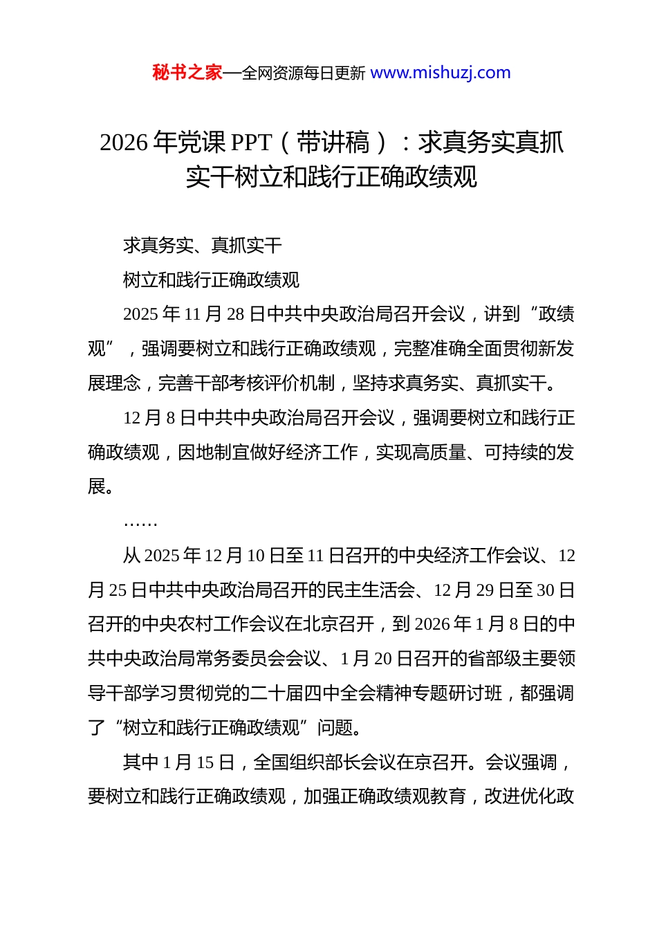 秘书之家—全网资源每日更新 www.mishuzj.com2026 年党课 PPT(带讲稿):求真务实真抓实干树立和践行正确政绩观 求真务实、真抓实干树立和践行正确政绩观2025 年 11 月 28 日中共中央政治局召开会议,讲到“政绩观”,强调要树立和践行正确政绩观,完整准确全面贯彻新发展理念,完善干部考核评价机制,坚持求真务实、真抓实干。12 月 8 日中共中央政治局召开会议,强调要树立和践行正确政绩观,因地制宜做好经济工作,实现高质量、可持续的发展。……从 2025 年 12 月 10 日至 11 日召开的中央经济工作会议、12月 25 日中共中央政治局召开的民主生活会、12 月 29 日至 30 日召开的中央农村工作会议在北京召开,到 2026 年 1 月 8 日的中共中央政治局常务委员会会议、1 月 20 日召开的省部级主要领导干部学习贯彻党的二十届四中全会精神专题研讨班,都强调了“树立和践行正确政绩观”问题。其中 1 月 15 日,全国组织部长会议在京召开。会议强调,要树立和践行正确政绩观,加强正确政绩观教育,改进优化政秘书之家—全网资源每日更新 www.mishuzj.com绩考核,健全有效防范和纠治政绩观偏差工作机制,真抓实干推动高质量发展。从 2025 年 11 月底到现在,至少有 8 次重要会议,每次都提到了“政绩观”表述都是“树立和践行正确政绩观”,在全国组织部长会议上,还提出要加强“正确政绩观教育”,可以说是逢会必提。“政绩观”,何以成为高频词?一一习近平总书记一直重视干部的政绩观问题。早在 20 多年前,时任浙江省委书记的习近平同志就曾指出:“能否坚持求真务实,为人民群众真心诚意办实事,坚持不懈做好事,尽心竭力解难事,与领导干部的政绩观、发展观是否正确、是否科学有密切关系。”在谈到政绩观时,总书记多次提到谷文昌和焦裕禄。比如2015 年 1 月 12 日,习近平总书记在北京主持召开座谈会,同中央党校第一期县委书记研修班学员进行座谈并发表重要讲话。这次座谈会上,总书记强调,干事创业一定要树立正确政绩观,做到“民之所好好之,民之所恶恶之”。他讲到,焦裕禄同志以自己的实际行动塑造了一个优秀共产党员和优秀县委书记的光辉形象。做县委书记,就要做焦裕禄式的县委书记。总书记说:“我经常提到五六十年代福建东山县县委书记谷文昌,他一心一意为老百姓办事,当地老百姓逢年过节是‘先祭秘书之家—全网资源每日更新 www.mishuzj.com谷公,后拜祖宗’。”2024 年 10 月 15 日至 16 日,习近平总书记在福建考察调研。在考察谷文昌纪念馆时指出,各级领导干部要向谷文昌同志学习,树牢正确政绩观,为官一任、造福一方,真抓实干、久久为功,把丰碑立在人民群众心中。学习谷文昌同志,不仅要高山仰止,还要见贤思齐,像他那样做人、为政。上世纪五六十年代,谷文昌目睹东山群众饱受风沙之苦,立下“不治服风沙,就让风沙把我埋掉”的誓言。他带领干部群众历时十余载,种下数万株木麻黄,硬生生把一座风沙肆虐的荒岛打造成生机盎然的绿洲。“不带私心搞革命,一心一意为人民”,谷文昌把这两句话写在自己笔记本上,也写在自己心里。他的政绩,没有立竿见影的光鲜数据,却惠及一代又一代东山百姓,成为真正的“潜绩丰碑”。身为县委书记,焦裕禄在兰考工作的 470 余个日夜里,靠着一辆自行车和一双胶鞋,踏遍了全县 149 个生产大队中的 120多个。无论瓢泼大雨还是风沙漫天,别人往屋里跑,焦裕禄却总是往外冲,即便在病重期间,他也拒绝只看材料听汇报,始终坚守“吃别人嚼过的馍没味道”的实干理念,用脚步丈量民情,用担当扛起使命。谷文昌、焦裕禄为什么屡屡被总书记记取、惦念?原因就秘书之家—全网资源每日更新 www.mishuzj.com在于他们是全心全意为人民服务,是为人民出政绩、以实干出政绩的好干部。政绩观是党员干部干事创业的“总开关”,只有“总开关”把住了,干事创业的方向才能把住。二然而,并不是所有的领导干部都能把住干事创业的“总开关”。比如,这两天,中央层面整治形式主义为基层减负专项工作机制办公室会同中央纪委办公厅通报的 3 起整治形式主义为基层减负典型问...