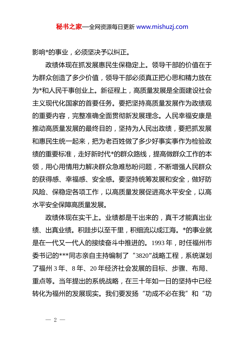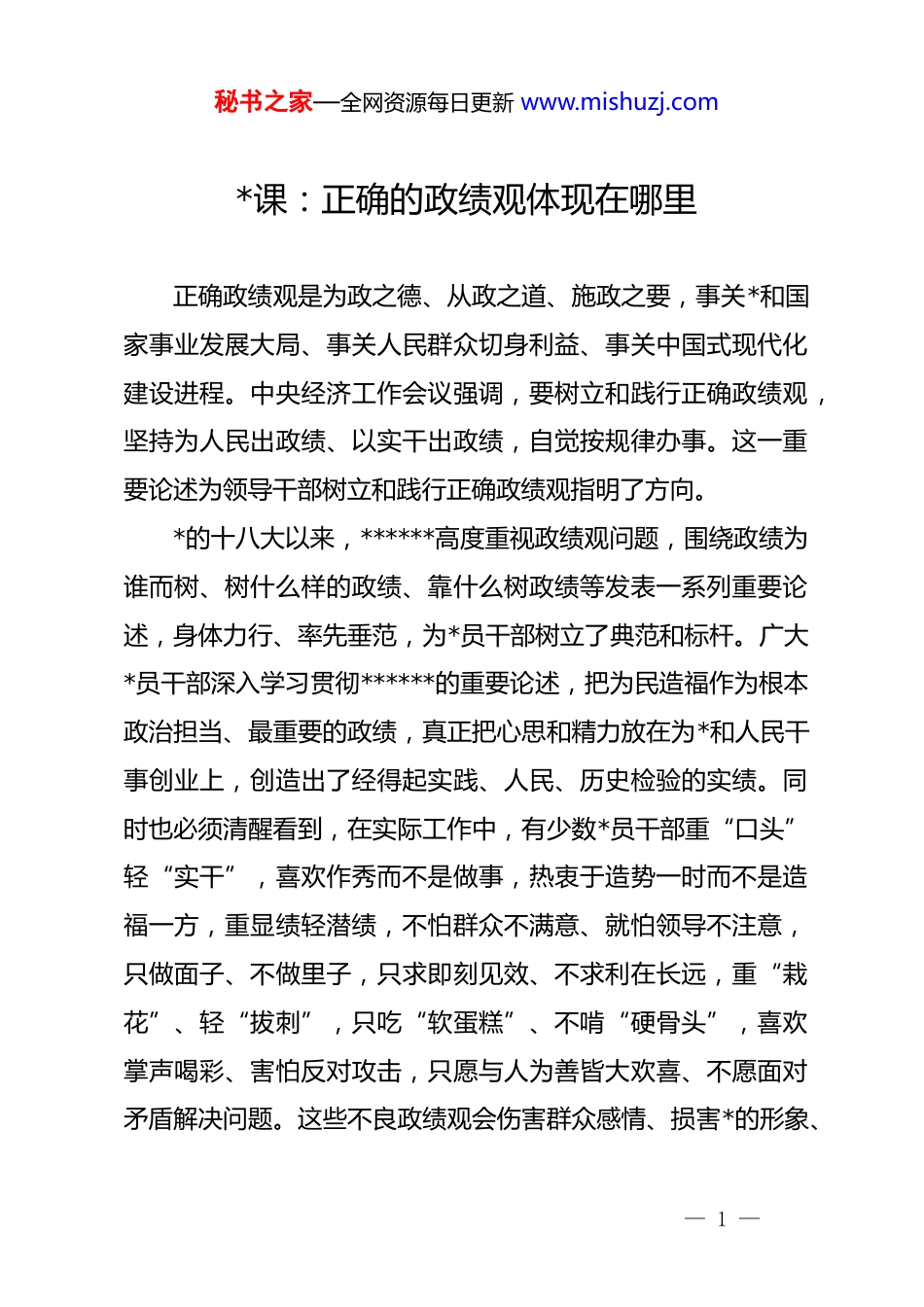 秘书之家—全网资源每日更新 www.mishuzj.com*课:正确的政绩观体现在哪里正确政绩观是为政之德、从政之道、施政之要,事关*和国家事业发展大局、事关人民群众切身利益、事关中国式现代化建设进程。中央经济工作会议强调,要树立和践行正确政绩观,坚持为人民出政绩、以实干出政绩,自觉按规律办事。这一重要论述为领导干部树立和践行正确政绩观指明了方向。*的十八大以来,******高度重视政绩观问题,围绕政绩为谁而树、树什么样的政绩、靠什么树政绩等发表一系列重要论述,身体力行、率先垂范,为*员干部树立了典范和标杆。广大*员干部深入学习贯彻******的重要论述,把为民造福作为根本政治担当、最重要的政绩,真正把心思和精力放在为*和人民干事创业上,创造出了经得起实践、人民、历史检验的实绩。同时也必须清醒看到,在实际工作中,有少数*员干部重“口头”轻“实干”,喜欢作秀而不是做事,热衷于造势一时而不是造福一方,重显绩轻潜绩,不怕群众不满意、就怕领导不注意,只做面子、不做里子,只求即刻见效、不求利在长远,重“栽花”、轻“拔刺”,只吃“软蛋糕”、不啃“硬骨头”,喜欢掌声喝彩、害怕反对攻击,只愿与人为善皆大欢喜、不愿面对矛盾解决问题。这些不良政绩观会伤害群众感情、损害*的形象、— 1 —秘书之家—全网资源每日更新 www.mishuzj.com影响*的事业,必须坚决予以纠正。政绩体现在抓发展惠民生保稳定上。领导干部的价值在于为群众创造了多少价值,领导干部必须真正把心思和精力放在为*和人民干事创业上。新征程上,高质量发展是全面建设社会主义现代化国家的首要任务。要把坚持高质量发展作为政绩观的重要内容,完整准确全面贯彻新发展理念。人民幸福安康是推动高质量发展的最终目的,坚持为人民出政绩,要把抓发展和惠民生统一起来,把为老百姓做了多少好事实事作为检验政绩的重要标准,走好新时代*的群众路线,提高做群众工作的本领,用心用情用力解决群众急难愁盼问题,不断增强人民群众的获得感、幸福感、安全感。要坚持统筹发展和安全,做好防风险、保稳定各项工作,以高质量发展促进高水平安全,以高水平安全保障高质量发展。政绩体现在实干上。业绩都是干出来的,真干才能真出业绩、出真业绩。积跬步以至千里,积细流以成江海。*的事业就是在一代又一代人的接续奋斗中推进的。1993 年,时任福州市委书记的***同志亲自主持编制了“3820”战略工程,系统谋划了福州 3 年、8 年、20 年经济社会发展的目标、步骤、布局、重点等。当年提出的系统战略,在三十年如一日的坚持中已经转化为福州的发展现实。我们要发扬“功成不必在我”和“功— 2 —秘书之家—全网资源每日更新 www.mishuzj.com成必定有我”的精神,既谋划长远,又干在当下,一方面,以只争朝夕的紧迫感、时不我待的责任心,积极作为、正确作为,做好当下能做的事情,坚决克服慢作为、不作为的现象;另一方面,对于长期战略任务,坚持一张蓝图绘到底、一茬接着一茬干,不贪一时之功、不图一己之私,坚决避免政绩冲动、盲目蛮干、大干快上以及“换赛道”“留痕迹”等现象。政绩体现在自觉按规律办事上。当前,我国改革进入攻坚期和深水区,触及的利益矛盾日益复杂,阻力与挑战显著增加,拈轻怕重、回避矛盾只会无所作为,急功近利、弄虚作假必须严肃问责。“为官避事平生耻”,要强化“当干部就要解决问题”的责任担当,以攻坚克难、迎难而上的政治勇气,直面矛盾问题不回避,铲除顽瘴痼疾不含糊,应对风险挑战不退缩,所有规划都要实事求是,追求实实在在、没有水分的增长,奋力打开改革发展新天地。同时,面对历史遗留问题,是承担责任、认真解决,还是置之不理、推拖躲绕,最能展现一名干部的政绩观。要树立“新官要理旧账、新官善理旧账”的正确理念,既接权力又接责任,既谋新事又理旧账,推动解决一批历史遗留问题,坚决防止“旧问题”拖成了“大问题”、“踢皮球”踢寒了“百姓心”。“十四五”即将圆满收官,第二个百年奋斗目标新征程实现— 3 —秘书之家—全网资源每日更新 www.mishuzj.com良好开局。领导干部只有树立和践行正确政绩观,心系百姓、真抓实干,...