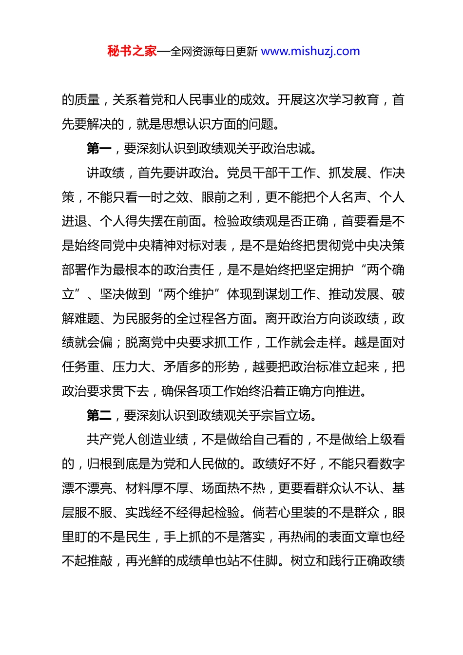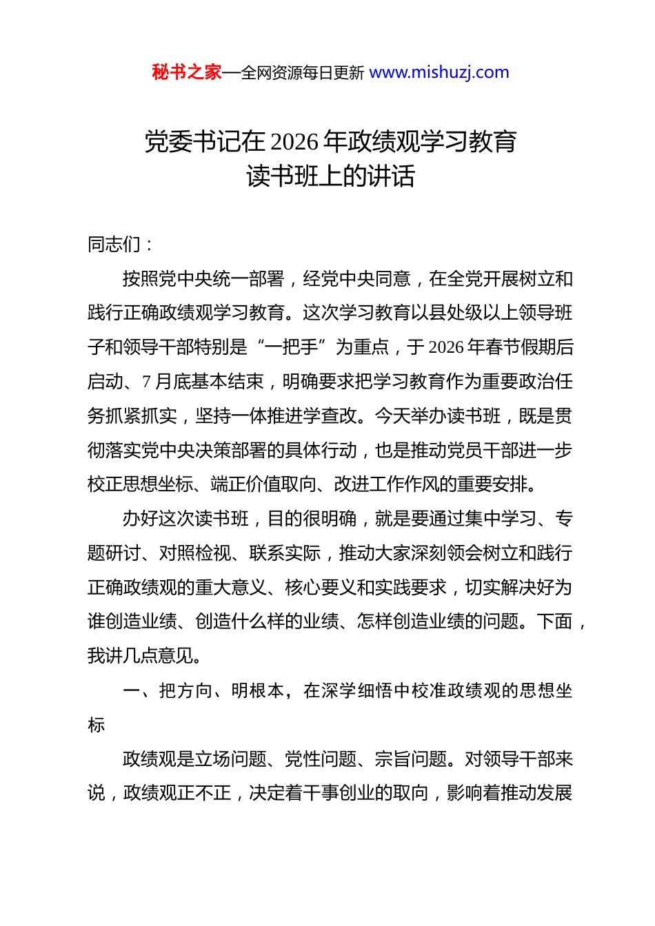 秘书之家—全网资源每日更新 www.mishuzj.com党委书记在 2026 年政绩观学习教育读书班上的讲话 同志们:按照党中央统一部署,经党中央同意,在全党开展树立和践行正确政绩观学习教育。这次学习教育以县处级以上领导班子和领导干部特别是“一把手”为重点,于 2026 年春节假期后启动、7 月底基本结束,明确要求把学习教育作为重要政治任务抓紧抓实,坚持一体推进学查改。今天举办读书班,既是贯彻落实党中央决策部署的具体行动,也是推动党员干部进一步校正思想坐标、端正价值取向、改进工作作风的重要安排。办好这次读书班,目的很明确,就是要通过集中学习、专题研讨、对照检视、联系实际,推动大家深刻领会树立和践行正确政绩观的重大意义、核心要义和实践要求,切实解决好为谁创造业绩、创造什么样的业绩、怎样创造业绩的问题。下面,我讲几点意见。一、把方向、明根本,在深学细悟中校准政绩观的思想坐标政绩观是立场问题、党性问题、宗旨问题。对领导干部来说,政绩观正不正,决定着干事创业的取向,影响着推动发展秘书之家—全网资源每日更新 www.mishuzj.com的质量,关系着党和人民事业的成效。开展这次学习教育,首先要解决的,就是思想认识方面的问题。第一,要深刻认识到政绩观关乎政治忠诚。讲政绩,首先要讲政治。党员干部干工作、抓发展、作决策,不能只看一时之效、眼前之利,更不能把个人名声、个人进退、个人得失摆在前面。检验政绩观是否正确,首要看是不是始终同党中央精神对标对表,是不是始终把贯彻党中央决策部署作为最根本的政治责任,是不是始终把坚定拥护“两个确立”、坚决做到“两个维护”体现到谋划工作、推动发展、破解难题、为民服务的全过程各方面。离开政治方向谈政绩,政绩就会偏;脱离党中央要求抓工作,工作就会走样。越是面对任务重、压力大、矛盾多的形势,越要把政治标准立起来,把政治要求贯下去,确保各项工作始终沿着正确方向推进。第二,要深刻认识到政绩观关乎宗旨立场。共产党人创造业绩,不是做给自己看的,不是做给上级看的,归根到底是为党和人民做的。政绩好不好,不能只看数字漂不漂亮、材料厚不厚、场面热不热,更要看群众认不认、基层服不服、实践经不经得起检验。倘若心里装的不是群众,眼里盯的不是民生,手上抓的不是落实,再热闹的表面文章也经不起推敲,再光鲜的成绩单也站不住脚。树立和践行正确政绩秘书之家—全网资源每日更新 www.mishuzj.com观,关键就是把人民立场立稳,把宗旨意识树牢,把群众满意作为衡量工作的重要标尺,把为民造福作为最重要的政绩。第三,要深刻认识到政绩观关乎事业发展。政绩观端正,发展就能行稳致远;政绩观偏了,工作就容易急功近利。实践反复证明,有的工作之所以反复折腾,有的项目之所以留下后遗症,有的决策之所以难以持续,根源在于政绩观出了偏差。只图眼前、不顾长远,只重显绩、不重潜绩,只重速度、不重质量,只看结果、不讲规律,看似是工作方法问题,实则是价值取向问题。抓发展不能违背规律,抓工作不能脱离实际,抓落实不能不计成本。只有把正确政绩观树牢,才能把握好当前和长远、局部和全局、发展和安全、显绩和潜绩的关系,推动事业走得更稳、更远。二、照镜子、找偏差,在对标对表中把问题根源挖深找准学习教育不能停留在一般表态上,不能满足于泛泛而谈,必须坚持把自己摆进去、把职责摆进去、把工作摆进去,真正做到见人见事见思想。查摆问题查得准不准、深不深,直接关系学习教育的质量,关系整改整治的成色。第一,要从思想深处查一查,看看宗旨意识牢不牢。有的同志谋划工作,习惯先想上级怎么看,再想群众怎么感受;推动任务,习惯先看有没有亮点、能不能出经验,而不秘书之家—全网资源每日更新 www.mishuzj.com是先看群众需要不需要、基层承受承受得住;研究事情,关注的是形式上是否“有动作”,而不是效果上是否“真落地”。这些现象看似是工作导向问题,实则反映的是宗旨意识不够牢、群众观点不够强。查摆问题,就要从这些思想症结查起,看看是不是还存在对群众感情不深、对基层情况掌握不透、对群众急难愁盼解决不力的问题,真正把“我是谁、为了...
