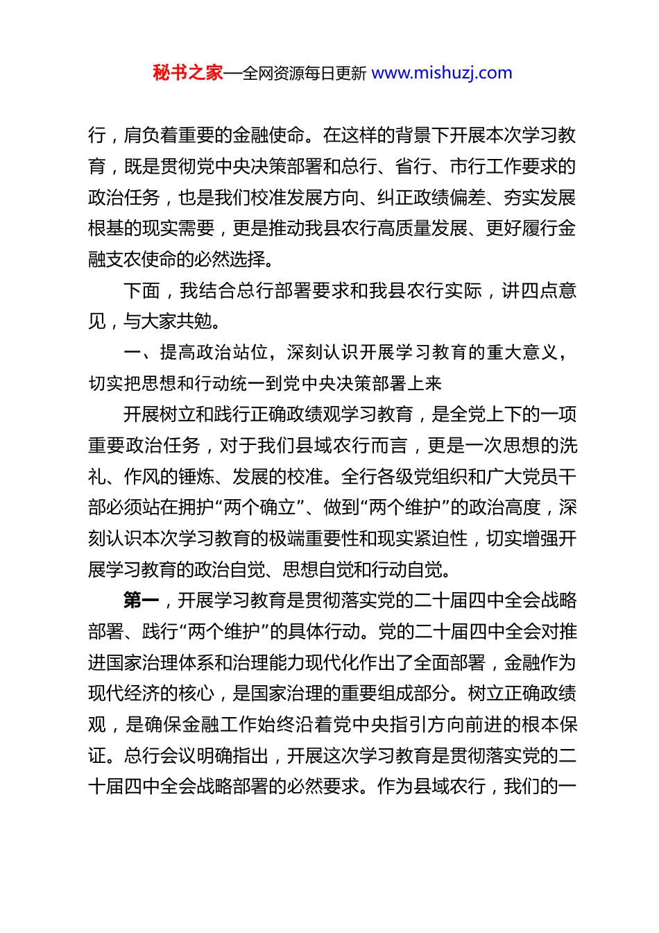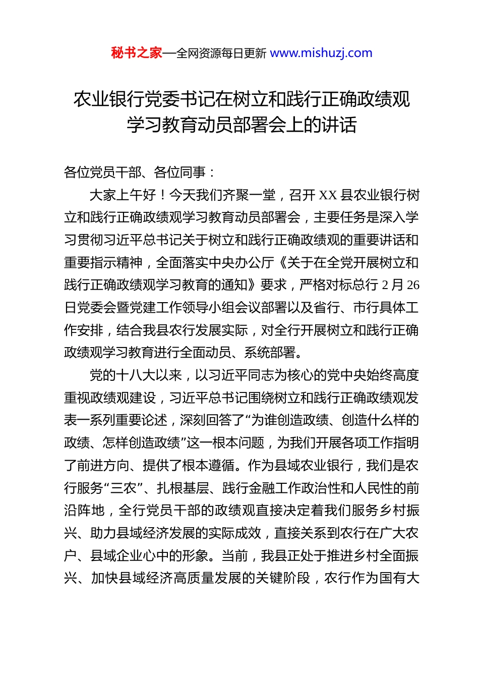 秘书之家—全网资源每日更新 www.mishuzj.com农业银行党委书记在树立和践行正确政绩观学习教育动员部署会上的讲话 各位党员干部、各位同事:大家上午好!今天我们齐聚一堂,召开 XX 县农业银行树立和践行正确政绩观学习教育动员部署会,主要任务是深入学习贯彻习近平总书记关于树立和践行正确政绩观的重要讲话和重要指示精神,全面落实中央办公厅《关于在全党开展树立和践行正确政绩观学习教育的通知》要求,严格对标总行 2 月 26日党委会暨党建工作领导小组会议部署以及省行、市行具体工作安排,结合我县农行发展实际,对全行开展树立和践行正确政绩观学习教育进行全面动员、系统部署。党的十八大以来,以习近平同志为核心的党中央始终高度重视政绩观建设,习近平总书记围绕树立和践行正确政绩观发“表一系列重要论述,深刻回答了 为谁创造政绩、创造什么样的”政绩、怎样创造政绩 这一根本问题,为我们开展各项工作指明了前进方向、提供了根本遵循。作为县域农业银行,我们是农“”行服务 三农 、扎根基层、践行金融工作政治性和人民性的前沿阵地,全行党员干部的政绩观直接决定着我们服务乡村振兴、助力县域经济发展的实际成效,直接关系到农行在广大农户、县域企业心中的形象。当前,我县正处于推进乡村全面振兴、加快县域经济高质量发展的关键阶段,农行作为国有大秘书之家—全网资源每日更新 www.mishuzj.com行,肩负着重要的金融使命。在这样的背景下开展本次学习教育,既是贯彻党中央决策部署和总行、省行、市行工作要求的政治任务,也是我们校准发展方向、纠正政绩偏差、夯实发展根基的现实需要,更是推动我县农行高质量发展、更好履行金融支农使命的必然选择。下面,我结合总行部署要求和我县农行实际,讲四点意见,与大家共勉。一、提高政治站位,深刻认识开展学习教育的重大意义,切实把思想和行动统一到党中央决策部署上来开展树立和践行正确政绩观学习教育,是全党上下的一项重要政治任务,对于我们县域农行而言,更是一次思想的洗礼、作风的锤炼、发展的校准。全行各级党组织和广大党员干“”“”部必须站在拥护 两个确立 、做到 两个维护 的政治高度,深刻认识本次学习教育的极端重要性和现实紧迫性,切实增强开展学习教育的政治自觉、思想自觉和行动自觉。第一,开展学习教育是贯彻落实党的二十届四中全会战略“”部署、践行 两个维护 的具体行动。党的二十届四中全会对推进国家治理体系和治理能力现代化作出了全面部署,金融作为现代经济的核心,是国家治理的重要组成部分。树立正确政绩观,是确保金融工作始终沿着党中央指引方向前进的根本保证。总行会议明确指出,开展这次学习教育是贯彻落实党的二十届四中全会战略部署的必然要求。作为县域农行,我们的一秘书之家—全网资源每日更新 www.mishuzj.com切工作都必须以党中央决策部署为根本遵循,通过开展学习教育,引导全行党员干部把讲政治贯穿工作全过程,始终在思想上政治上行动上同以习近平同志为核心的党中央保持高度一“”“”致,切实把 两个维护 体现在服务 三农 、支持县域经济发展的具体行动中,体现在推动我县农行高质量发展的实际成效上。第二,开展学习教育是践行金融工作政治性和人民性、履行县域农行支农使命的核心举措。农行因农而生、伴农成“”“”长, 三农 是我们的根与魂,服务 三农 、为民造福是我们的初心和使命,这也是金融工作政治性和人民性的最直接体现。截至 2025“年末,农行全行 惠农 e”贷 余额突破 1.8 万亿元,服务农户超 1800 万户,县域贷款余额突破 10 万亿元,这些数据“”背后,是农行践行 金融为民 的生动实践。XX 县是农业大县,粮食生产、特色农业、乡村产业是县域经济的核心,我们的工作直接面对广大农户、新型农业经营主体、县域小微企业,我们的政绩体现在农户的增收致富里,体现在乡村产业的发展壮大中,体现在县域经济的提质增效上。通过开展学习教“育,就是要引导全行党员干部牢固树立 立党为公、为民造”“福 的政绩理念,坚决摒弃 重指标轻服务、重短期轻长远、重”形式轻实效 的错误倾向,始终把群众满意作为...