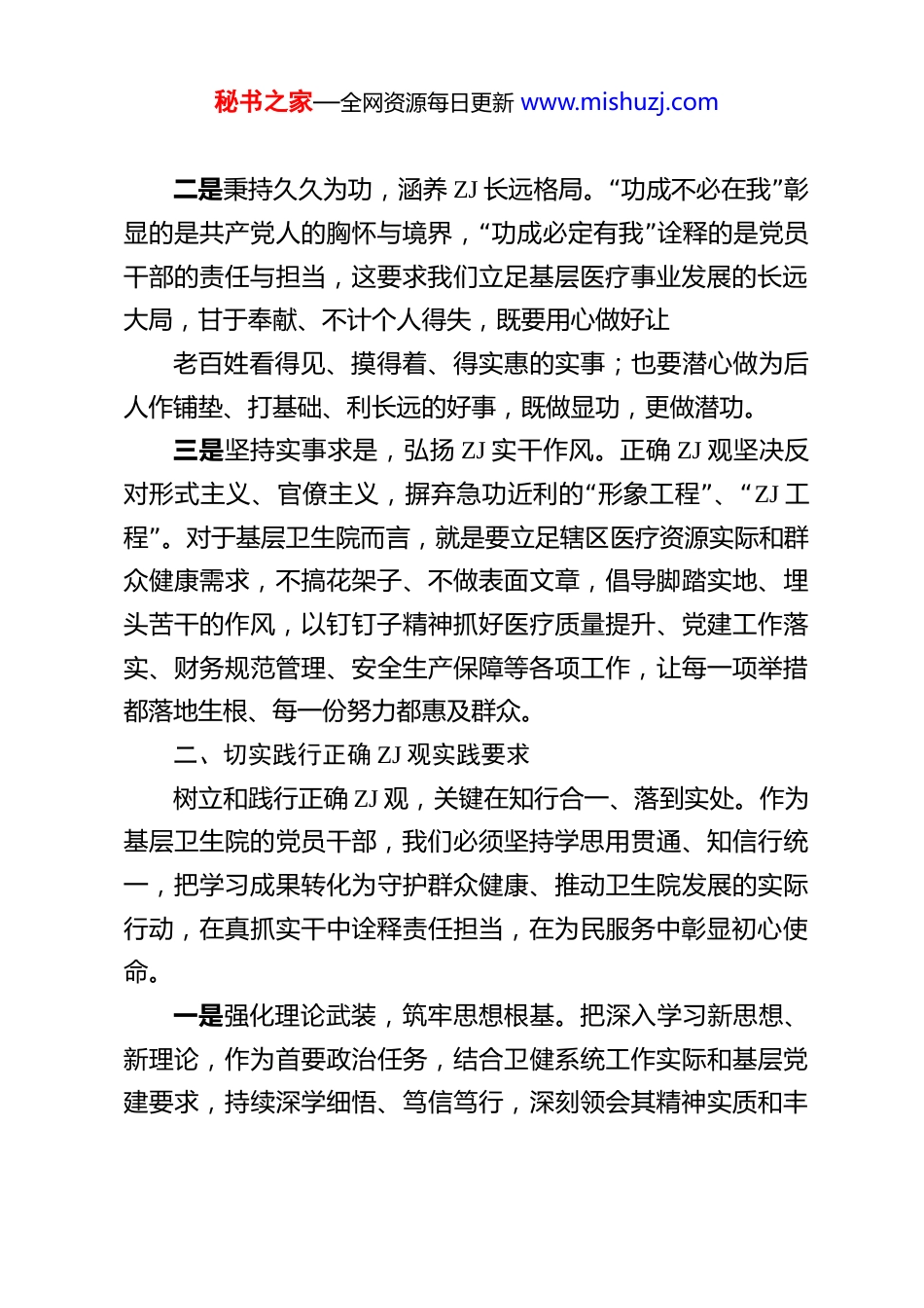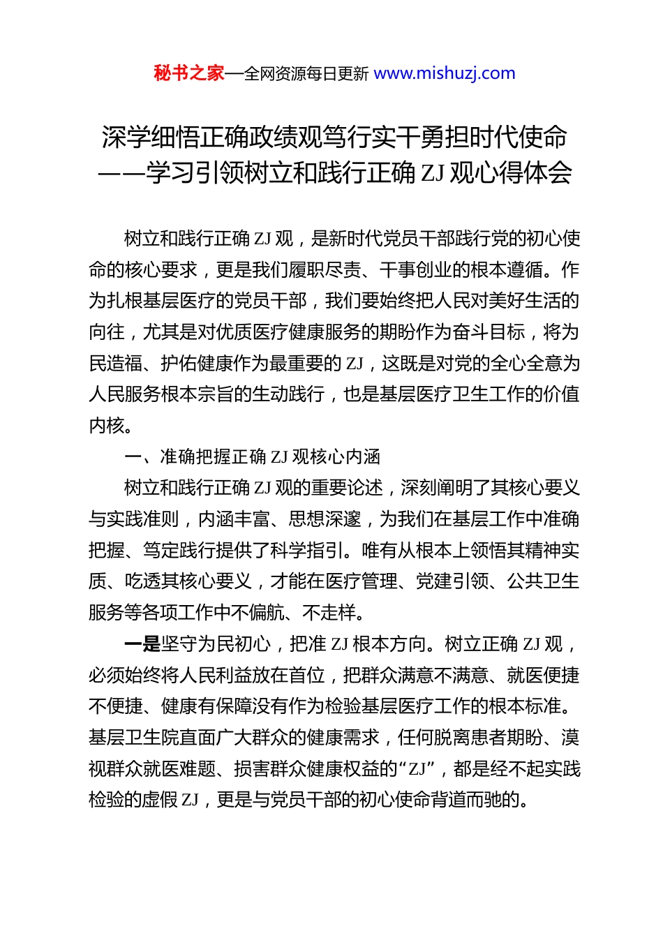 秘书之家—全网资源每日更新 www.mishuzj.com深学细悟正确政绩观笃行实干勇担时代使命——学习引领树立和践行正确 ZJ 观心得体会 树立和践行正确 ZJ 观,是新时代党员干部践行党的初心使命的核心要求,更是我们履职尽责、干事创业的根本遵循。作为扎根基层医疗的党员干部,我们要始终把人民对美好生活的向往,尤其是对优质医疗健康服务的期盼作为奋斗目标,将为民造福、护佑健康作为最重要的 ZJ,这既是对党的全心全意为人民服务根本宗旨的生动践行,也是基层医疗卫生工作的价值内核。一、准确把握正确 ZJ 观核心内涵树立和践行正确 ZJ 观的重要论述,深刻阐明了其核心要义与实践准则,内涵丰富、思想深邃,为我们在基层工作中准确把握、笃定践行提供了科学指引。唯有从根本上领悟其精神实质、吃透其核心要义,才能在医疗管理、党建引领、公共卫生服务等各项工作中不偏航、不走样。一是坚守为民初心,把准 ZJ 根本方向。树立正确 ZJ 观,必须始终将人民利益放在首位,把群众满意不满意、就医便捷不便捷、健康有保障没有作为检验基层医疗工作的根本标准。基层卫生院直面广大群众的健康需求,任何脱离患者期盼、漠“视群众就医难题、损害群众健康权益的 ZJ”,都是经不起实践检验的虚假 ZJ,更是与党员干部的初心使命背道而驰的。秘书之家—全网资源每日更新 www.mishuzj.com二是秉持久久为功,涵养 ZJ“”长远格局。 功成不必在我 彰“”显的是共产党人的胸怀与境界, 功成必定有我 诠释的是党员干部的责任与担当,这要求我们立足基层医疗事业发展的长远大局,甘于奉献、不计个人得失,既要用心做好让老百姓看得见、摸得着、得实惠的实事;也要潜心做为后人作铺垫、打基础、利长远的好事,既做显功,更做潜功。三是坚持实事求是,弘扬 ZJ 实干作风。正确 ZJ 观坚决反“”“对形式主义、官僚主义,摒弃急功近利的 形象工程 、 ZJ 工”程 。对于基层卫生院而言,就是要立足辖区医疗资源实际和群众健康需求,不搞花架子、不做表面文章,倡导脚踏实地、埋头苦干的作风,以钉钉子精神抓好医疗质量提升、党建工作落实、财务规范管理、安全生产保障等各项工作,让每一项举措都落地生根、每一份努力都惠及群众。二、切实践行正确 ZJ 观实践要求树立和践行正确 ZJ 观,关键在知行合一、落到实处。作为基层卫生院的党员干部,我们必须坚持学思用贯通、知信行统一,把学习成果转化为守护群众健康、推动卫生院发展的实际行动,在真抓实干中诠释责任担当,在为民服务中彰显初心使命。一是强化理论武装,筑牢思想根基。把深入学习新思想、新理论,作为首要政治任务,结合卫健系统工作实际和基层党建要求,持续深学细悟、笃信笃行,深刻领会其精神实质和丰秘书之家—全网资源每日更新 www.mishuzj.com富内涵。通过支部集中学习、个人自学、专题研讨等多种形式,不断增强政治判断力、政治领悟力、政治执行力,从思想“深处彻底解决好 ZJ 为谁而树、树什么样的 ZJ、怎样树好 ZJ”这一根本问题,确保基层医疗工作始终沿着正确政治方向前进。二是坚持问题导向,提升能力本领。始终聚焦人民群众在医疗健康领域的急难愁盼问题,带头深入村社、走进诊室、贴近患者,摸清辖区群众的健康需求底数,掌握卫生院工作的短板弱项,获取第一手资料。针对基层公卫服务覆盖不均、医疗服务能力不足、后勤保障精细化程度不高等问题,不断加强专业知识学习和履职能力训练,提升医疗管理、党建引领、应急处置、统筹协调等综合本领,以过硬能力创造经得起实践、人民、历史检验的实绩。三是发扬斗争精神,勇于担当作为。面对基层医疗改革发展、疫情防控常态化、安全生产风险防范、财务规范运行等工作中的困难和挑战,始终保持迎难而上、攻坚克难的奋斗姿“”态,不回避矛盾、不推卸责任,以 功成必定有我 的历史主动精神,在新时代基层医疗卫生事业发展的新征程上展现新担当、实现新作为。四是严守纪律规矩,保持清正廉洁。始终把纪律和规矩挺在前面,严格遵守党章党规党纪和医疗卫生行业各项规章制度,自觉接受组织、群众和患者的监督,做到慎独、慎微、慎始、慎终。树立正确...
