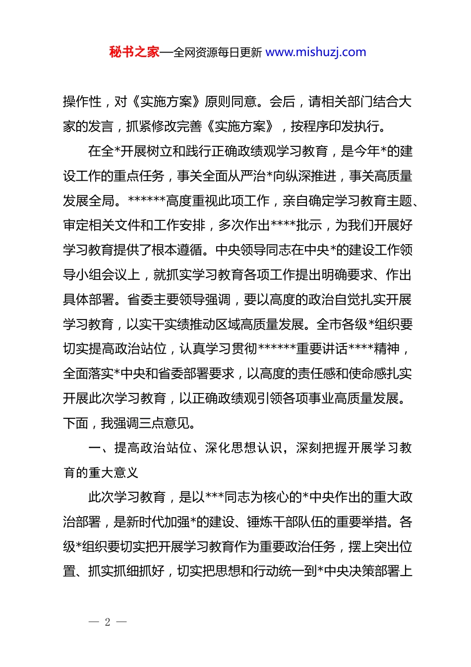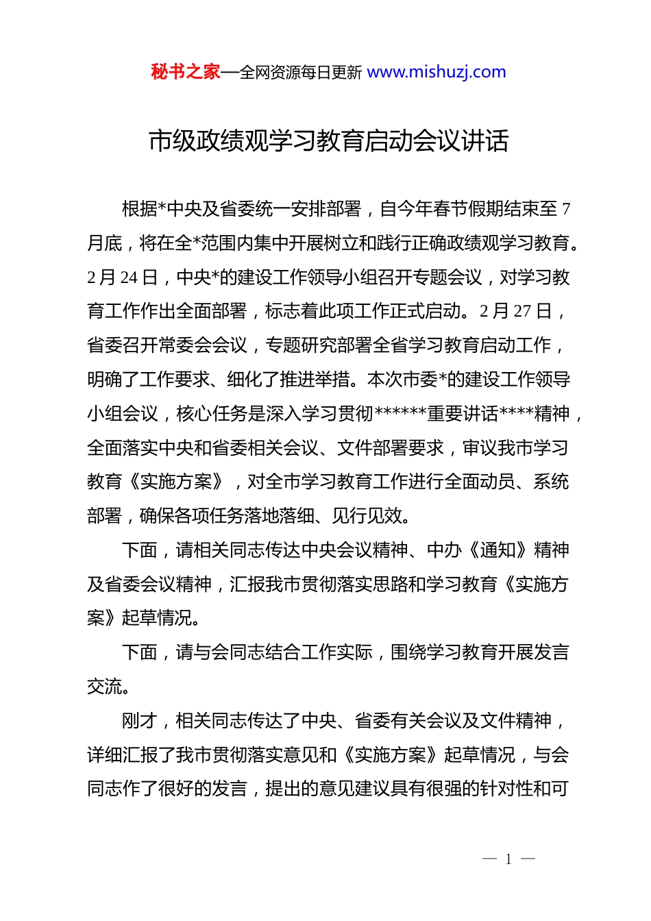 秘书之家—全网资源每日更新 www.mishuzj.com市级政绩观学习教育启动会议讲话根据*中央及省委统一安排部署,自今年春节假期结束至 7月底,将在全*范围内集中开展树立和践行正确政绩观学习教育。2 月 24 日,中央*的建设工作领导小组召开专题会议,对学习教育工作作出全面部署,标志着此项工作正式启动。2 月 27 日,省委召开常委会会议,专题研究部署全省学习教育启动工作,明确了工作要求、细化了推进举措。本次市委*的建设工作领导小组会议,核心任务是深入学习贯彻******重要讲话****精神,全面落实中央和省委相关会议、文件部署要求,审议我市学习教育《实施方案》,对全市学习教育工作进行全面动员、系统部署,确保各项任务落地落细、见行见效。下面,请相关同志传达中央会议精神、中办《通知》精神及省委会议精神,汇报我市贯彻落实思路和学习教育《实施方案》起草情况。下面,请与会同志结合工作实际,围绕学习教育开展发言交流。刚才,相关同志传达了中央、省委有关会议及文件精神,详细汇报了我市贯彻落实意见和《实施方案》起草情况,与会同志作了很好的发言,提出的意见建议具有很强的针对性和可— 1 —秘书之家—全网资源每日更新 www.mishuzj.com操作性,对《实施方案》原则同意。会后,请相关部门结合大家的发言,抓紧修改完善《实施方案》,按程序印发执行。在全*开展树立和践行正确政绩观学习教育,是今年*的建设工作的重点任务,事关全面从严治*向纵深推进,事关高质量发展全局。******高度重视此项工作,亲自确定学习教育主题、审定相关文件和工作安排,多次作出****批示,为我们开展好学习教育提供了根本遵循。中央领导同志在中央*的建设工作领导小组会议上,就抓实学习教育各项工作提出明确要求、作出具体部署。省委主要领导强调,要以高度的政治自觉扎实开展学习教育,以实干实绩推动区域高质量发展。全市各级*组织要切实提高政治站位,认真学习贯彻******重要讲话****精神,全面落实*中央和省委部署要求,以高度的责任感和使命感扎实开展此次学习教育,以正确政绩观引领各项事业高质量发展。下面,我强调三点意见。一、提高政治站位、深化思想认识,深刻把握开展学习教育的重大意义此次学习教育,是以***同志为核心的*中央作出的重大政治部署,是新时代加强*的建设、锤炼干部队伍的重要举措。各级*组织要切实把开展学习教育作为重要政治任务,摆上突出位置、抓实抓细抓好,切实把思想和行动统一到*中央决策部署上— 2 —秘书之家—全网资源每日更新 www.mishuzj.com来。第一,开展学习教育,是深入学习、精准领悟、坚决践行******关于树立和践行正确政绩观重要论述的具体实践。*的十八大以来,******围绕树立和践行正确政绩观,发表一系列重要讲话、作出一系列****,深刻回答了“政绩为谁而树、树什么样的政绩、靠什么树政绩”等根本性问题,为广大*员干部履职尽责、干事创业提供了行动指南。我们要站在坚定拥护“两个确立”、坚决做到“两个维护”的政治高度,深学细悟、笃行实干,切实把******重要论述融入工作全过程、体现到具体行动上。第二,开展学习教育,是*中央在关键节点、重要阶段作出的战略性部署。今年是中国共产*成立 105 周年,是“十五五”开局起步的关键之年,也是市县乡领导班子集中换届后的第一年。在这样一个重要时间节点开展学习教育,既是全面从严治*、锻造过硬干部队伍的内在要求,也是应对新形势新挑战、推动事业高质量发展的迫切需要,对凝聚奋进力量、推进*和国家事业发展具有重大而深远的意义。我们要深刻认识开展学习教育的重要性和紧迫性,切实增强思想自觉、政治自觉、行动自觉,坚决把*中央部署要求落到实处。第三,开展学习教育,是深化干部能力作风建设、推动区— 3 —秘书之家—全网资源每日更新 www.mishuzj.com域高质量发展的必然要求。此次学习教育明确提出“立*为公、为民造福、科学决策、真抓实干”的总要求,这既是深化干部能力作风建设的具体标准,也是衡量各级领导班子和领导干部履职成效的重要标尺。我们要深刻认识到,开展学习教育是锤炼过硬干部队伍、破解发展难题、增进民生福祉的重要途径...