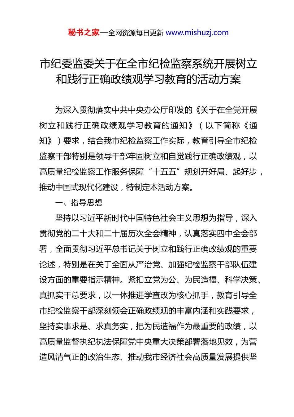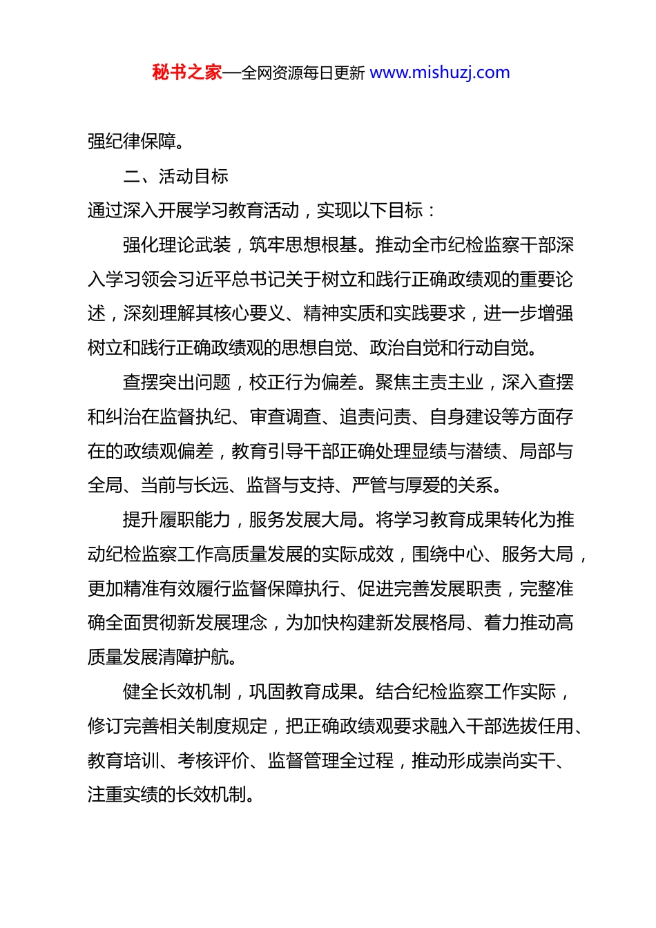 秘书之家—全网资源每日更新 www.mishuzj.com市纪委监委关于在全市纪检监察系统开展树立和践行正确政绩观学习教育的活动方案 为深入贯彻落实中共中央办公厅印发的《关于在全党开展树立和践行正确政绩观学习教育的通知》(以下简称《通知》)要求,结合我市纪检监察工作实际,教育引导全市纪检监察干部特别是领导干部牢固树立和自觉践行正确政绩观,以高质量纪检监察工作服务保障“十五五”规划开好局、起好步,推动中国式现代化建设,特制定本活动方案。一、指导思想坚持以习近平新时代中国特色社会主义思想为指导,深入贯彻党的二十大和二十届历次全会精神,认真落实四中全会部署,全面贯彻习近平总书记关于树立和践行正确政绩观的重要论述,特别是在关于全面从严治党、加强纪检监察干部队伍建设方面的重要指示精神。紧扣立党为公、为民造福、科学决策、真抓实干总要求,以一体推进学查改为核心抓手,教育引导全市纪检监察干部深刻领会正确政绩观的丰富内涵和实践要求,坚持实事求是、求真务实,把为民造福作为最重要的政绩,以高质量监督执纪执法保障党中央重大决策部署落地见效,为营造风清气正的政治生态、推动我市经济社会高质量发展提供坚秘书之家—全网资源每日更新 www.mishuzj.com强纪律保障。二、活动目标通过深入开展学习教育活动,实现以下目标:强化理论武装,筑牢思想根基。推动全市纪检监察干部深入学习领会习近平总书记关于树立和践行正确政绩观的重要论述,深刻理解其核心要义、精神实质和实践要求,进一步增强树立和践行正确政绩观的思想自觉、政治自觉和行动自觉。查摆突出问题,校正行为偏差。聚焦主责主业,深入查摆和纠治在监督执纪、审查调查、追责问责、自身建设等方面存在的政绩观偏差,教育引导干部正确处理显绩与潜绩、局部与全局、当前与长远、监督与支持、严管与厚爱的关系。提升履职能力,服务发展大局。将学习教育成果转化为推动纪检监察工作高质量发展的实际成效,围绕中心、服务大局,更加精准有效履行监督保障执行、促进完善发展职责,完整准确全面贯彻新发展理念,为加快构建新发展格局、着力推动高质量发展清障护航。健全长效机制,巩固教育成果。结合纪检监察工作实际,修订完善相关制度规定,把正确政绩观要求融入干部选拔任用、教育培训、考核评价、监督管理全过程,推动形成崇尚实干、注重实绩的长效机制。秘书之家—全网资源每日更新 www.mishuzj.com锻造过硬队伍,展现良好形象。以更高标准、更严要求加强纪检监察干部队伍建设,教育引导干部带头践行正确政绩观,做到忠诚干净担当、敢于善于斗争,以实实在在的工作成效取信于民。三、范围对象学习教育活动以市纪委监委领导班子成员、机关各部门及各派驻(出)机构负责人、市委巡察机构县处级以上领导干部为重点,覆盖全市纪检监察系统全体党员、干部。四、时间安排根据《通知》要求,学习教育活动于 2026 年春节假期后启动,2026 年 7 月底基本结束。五、主要任务与工作安排认真落实《通知》要求的学习研讨、查摆问题、整改整治建章立制、开门教育等工作安排,坚持聚焦主题、简约务实,不分批次、不划阶段,将各项任务有机融合、一体推进。(一)深入学习研讨,凝聚思想共识原原本本学。组织全体干部深入学习习近平总书记关于树立和践行正确政绩观的重要论述,特别是关于党风廉政建设和反腐败斗争的重要论述;深入学习《中共中央关于制定国民经济和社会发展第十五个五年规划的建议》;深入学习习近平总秘书之家—全网资源每日更新 www.mishuzj.com书记关于本地区以及关于全面从严治党、纪检监察工作的重要讲话和重要指示精神。通过纪委常委会(扩大)会议、理论学习中心组学习、党支部“三会一课”、青年理论学习小组等形式,确保学深悟透、入脑入心。联系实际悟。围绕“纪检监察工作为谁创造政绩、创造什么样的政绩、怎样创造政绩”等根本性问题,结合岗位职责和工作实际,组织开展专题研讨、座谈交流、撰写心得体会等,引导干部深入思考、交流互鉴,进一步强化立党为公、为民造福理念,明确努力方向。警示教育促。结合近年来查处的政绩观偏差典型案件,特别是纪检监察干部...