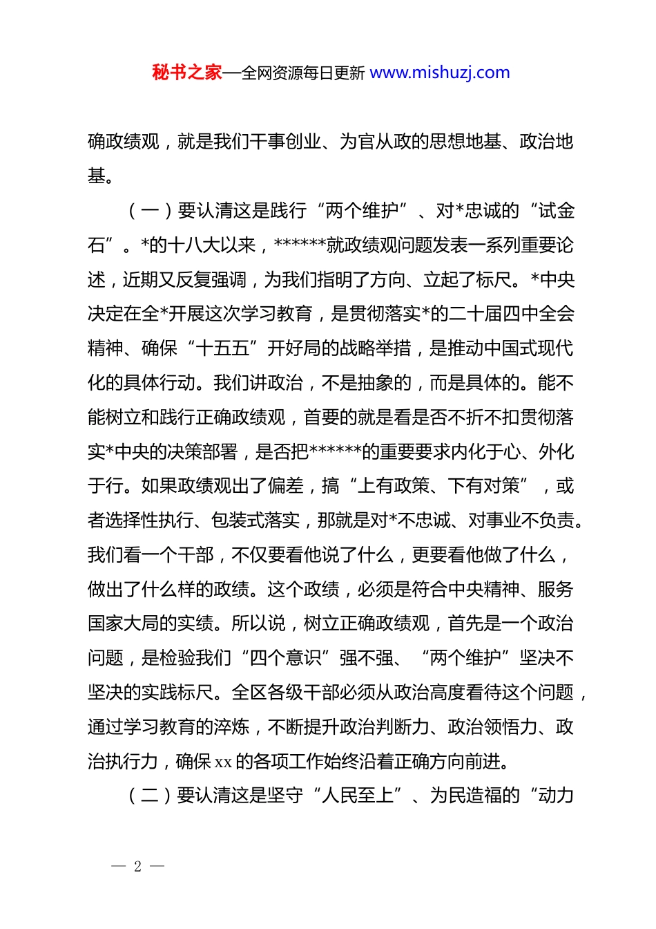 秘书之家—全网资源每日更新 www.mishuzj.com(6 篇)市县乡政绩观学习教育动员部署会讲话汇编在全区树立和践行正确政绩观学习教育动员会上的讲话同志们:今天,我们召开全区树立和践行正确政绩观学习教育动员会。主要目的是,深入学习贯彻******关于树立和践行正确政绩观的重要论述,认真贯彻落实*中央决策部署和中央办公厅印发的《通知》精神,落实中央*的建设工作领导小组会议安排,对我区开展学习教育进行动员部署,教育引导全区各级*组织和广大*员干部特别是领导干部,真正把正确的政绩观树牢固、践行好,为 x 区高质量发展凝聚强大力量、提供坚实保障。刚才,我们传达学习了中央有关文件和会议精神,宣读了区学习教育方案,大家要认真领会,抓好落实。下面,我讲四点意见。一、要深刻认识树立和践行正确政绩观的极端重要性思想是行动的先导,认识是落实的前提。对一项工作的重要性认识到什么程度,决心和行动就会跟进到什么程度。开展这次学习教育,首先要解决“为什么”的问题,要从政治、宗旨、发展三个维度,深刻把握其重大而深远的意义。这好比盖房子,地基夯得实,楼房才能盖得高、立得稳。树立和践行正— 1 —秘书之家—全网资源每日更新 www.mishuzj.com确政绩观,就是我们干事创业、为官从政的思想地基、政治地基。(一)要认清这是践行“两个维护”、对*忠诚的“试金石”。*的十八大以来,******就政绩观问题发表一系列重要论述,近期又反复强调,为我们指明了方向、立起了标尺。*中央决定在全*开展这次学习教育,是贯彻落实*的二十届四中全会精神、确保“十五五”开好局的战略举措,是推动中国式现代化的具体行动。我们讲政治,不是抽象的,而是具体的。能不能树立和践行正确政绩观,首要的就是看是否不折不扣贯彻落实*中央的决策部署,是否把******的重要要求内化于心、外化于行。如果政绩观出了偏差,搞“上有政策、下有对策”,或者选择性执行、包装式落实,那就是对*不忠诚、对事业不负责。我们看一个干部,不仅要看他说了什么,更要看他做了什么,做出了什么样的政绩。这个政绩,必须是符合中央精神、服务国家大局的实绩。所以说,树立正确政绩观,首先是一个政治问题,是检验我们“四个意识”强不强、“两个维护”坚决不坚决的实践标尺。全区各级干部必须从政治高度看待这个问题,通过学习教育的淬炼,不断提升政治判断力、政治领悟力、政治执行力,确保 xx 的各项工作始终沿着正确方向前进。(二)要认清这是坚守“人民至上”、为民造福的“动力— 2 —秘书之家—全网资源每日更新 www.mishuzj.com源”。我们*的根基在人民、血脉在人民、力量在人民。为官一任,造福一方。这个“福”,是人民群众的福祉,不是领导干部个人的“声誉”。政绩为谁而树、树什么样的政绩、靠什么树政绩,答案只有一个:为了人民,依靠人民,成果由人民共享。正确的政绩观,核心是“立*为公、为民造福”。现实中,有的地方热衷于搞“形象工程”、“面子工程”,马路修得宽,广场建得大,但背街小巷的路灯不亮、下水不通;有的项目听起来“高大上”,但离老百姓的实际生活很远,群众获得感不强。这就是政绩观跑偏了,把“对上负责”和“对下负责”割裂开来,甚至只“对上”不“对下”。我们开展学习教育,就是要引导大家经常想一想,我们手中的权力是谁给的?我们工作的出发点和落脚点应该在哪里?要把“人民满意”作为衡量一切工作的根本标准,把老百姓的“急难愁盼”时刻放在心上,抓在手上。为民造福,不一定都是轰轰烈烈的大项目,更多是雪中送炭的“微实事”。解决好一个老旧小区的供暖问题,疏通一段常年堵塞的管网,增加几个普惠性幼儿园的学位,这些都是实实在在的政绩。学习教育就是要强化这种“民生为大”的理念,让我们干工作、做决策的源头活水,始终来自于人民的需求。(三)要认清这是推动“高质量发展”、行稳致远的“导— 3 —秘书之家—全网资源每日更新 www.mishuzj.com航仪”。今年是“十五五”规划的开局之年,xx 区发展站在了新的起点上。实现什么样的发展、怎样实现发展,政绩观起着关键的导向作用。如果政绩观是急功近利的,发展就可能“脱...