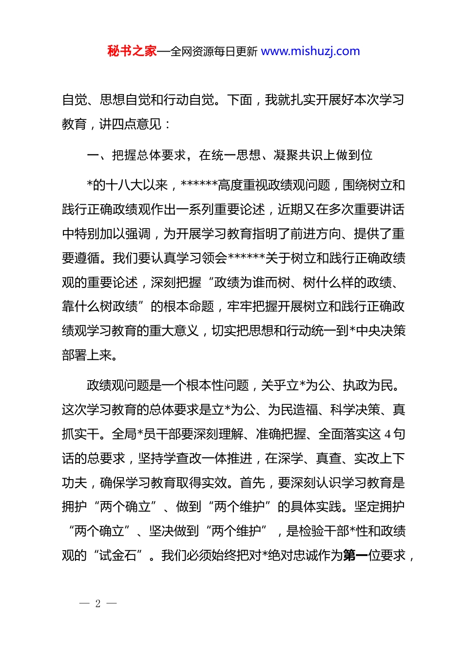 秘书之家—全网资源每日更新 www.mishuzj.com市直部门主要领导在树立和践行正确政绩观动员部署会上的讲话提纲同志们:在“十五五”开局之年,*中央部署开展树立和践行正确政绩观,再次宣示全面从严治*永远在路上、*的自我革命永远在路上的鲜明态度,充分彰显立*为公、执政为民的价值追求。政绩观是*员干部世界观、人生观、价值观的集中体现,是干事创业的“指南针”和“定盘星”。******反复强调,政绩观问题是一个根本性问题,关乎立*为公、执政为民。我们要切实把思想和行动统一到******重要讲话精神和*中央、省委、市委决策部署上来,以饱满的政治热情、务实的工作举措,确保学习教育抓紧抓实、抓出成效。今天,组织召开这次动员部署会,既是统一思想、凝聚共识的政治动员,更是明确任务、压实责任的行动号令。我们要提高政治站位,深刻认识开展学习教育是坚定拥护“两个确立”、坚决做到“两个维护”的政治要求,是深化自我革命、纵深推进从严管*的有力抓手,坚决把思想和行动统一到*中央决策部署上来,切实增强抓好学习教育的政治— 1 —秘书之家—全网资源每日更新 www.mishuzj.com自觉、思想自觉和行动自觉。下面,我就扎实开展好本次学习教育,讲四点意见:一、把握总体要求,在统一思想、凝聚共识上做到位*的十八大以来,******高度重视政绩观问题,围绕树立和践行正确政绩观作出一系列重要论述,近期又在多次重要讲话中特别加以强调,为开展学习教育指明了前进方向、提供了重要遵循。我们要认真学习领会******关于树立和践行正确政绩观的重要论述,深刻把握“政绩为谁而树、树什么样的政绩、靠什么树政绩”的根本命题,牢牢把握开展树立和践行正确政绩观学习教育的重大意义,切实把思想和行动统一到*中央决策部署上来。政绩观问题是一个根本性问题,关乎立*为公、执政为民。这次学习教育的总体要求是立*为公、为民造福、科学决策、真抓实干。全局*员干部要深刻理解、准确把握、全面落实这 4 句话的总要求,坚持学查改一体推进,在深学、真查、实改上下功夫,确保学习教育取得实效。首先,要深刻认识学习教育是拥护“两个确立”、做到“两个维护”的具体实践。坚定拥护“两个确立”、坚决做到“两个维护”,是检验干部*性和政绩观的“试金石”。我们必须始终把对*绝对忠诚作为第一位要求,— 2 —秘书之家—全网资源每日更新 www.mishuzj.com深刻领悟“两个确立”的决定性意义,增强“四个意识”、坚定“四个自信”、做到“两个维护”,时时处处向以***同志为核心的*中央看齐,做到*中央提倡的坚决响应、*中央决定的坚决执行、*中央禁止的坚决不做。深刻认识学习教育是巩固拓展*内集中学习教育成果、纵深推进全面从严治*的关键抓手。坚持*的领导、推进全面从严治*,对*员领导干部树立正确政绩观提出了明确要求。我们必须从巩固*的执政地位出发,牢记我们*是什么、要干什么,牢固树立和践行正确政绩观,充分发挥全面从严治*的引领保障作用,不断筑牢*长期执政的坚实根基。再次,深刻认识到学习教育是破解发展难题、推动高质量发展的现实需要。推动高质量发展,必须牢固树立正确政绩观,坚持知行合一、脚踏实地、真抓实干,严格按照制度规定履行职责、行使权力、开展工作,在尊重客观规律的基础上坚持一切从实际出发,把工作抓实抓好抓出实效。只有这样,才能把改革发展稳定各项工作做实做好,确保贯彻*中央的各项决策和工作部署在各地区、各部门不偏向、不变通、不走样,有效推动我国制度优势更好转化为国家治理效能。二、聚焦关键环节,在总体谋划、推动落实上做到位这次专题学习教育标准高、要求严、任务重,必须抓住关— 3 —秘书之家—全网资源每日更新 www.mishuzj.com键、精准发力,以重点突破带动整体提升,确保各项任务落地见效。要聚焦目标、把握重点,着力推进学习教育各项任务。加强政治引领、把握目标要求,突出学习重点、务求学深悟透,强化问题导向、深入查摆不足,推动整改整治、深化建章立制,坚持开门教育、提升惠民实效。紧密结合单位工作实际,坚持学查改一体推进,真正在深学、真查、实改上下功夫见成效。结合学习教育重点工作,要紧扣“...
