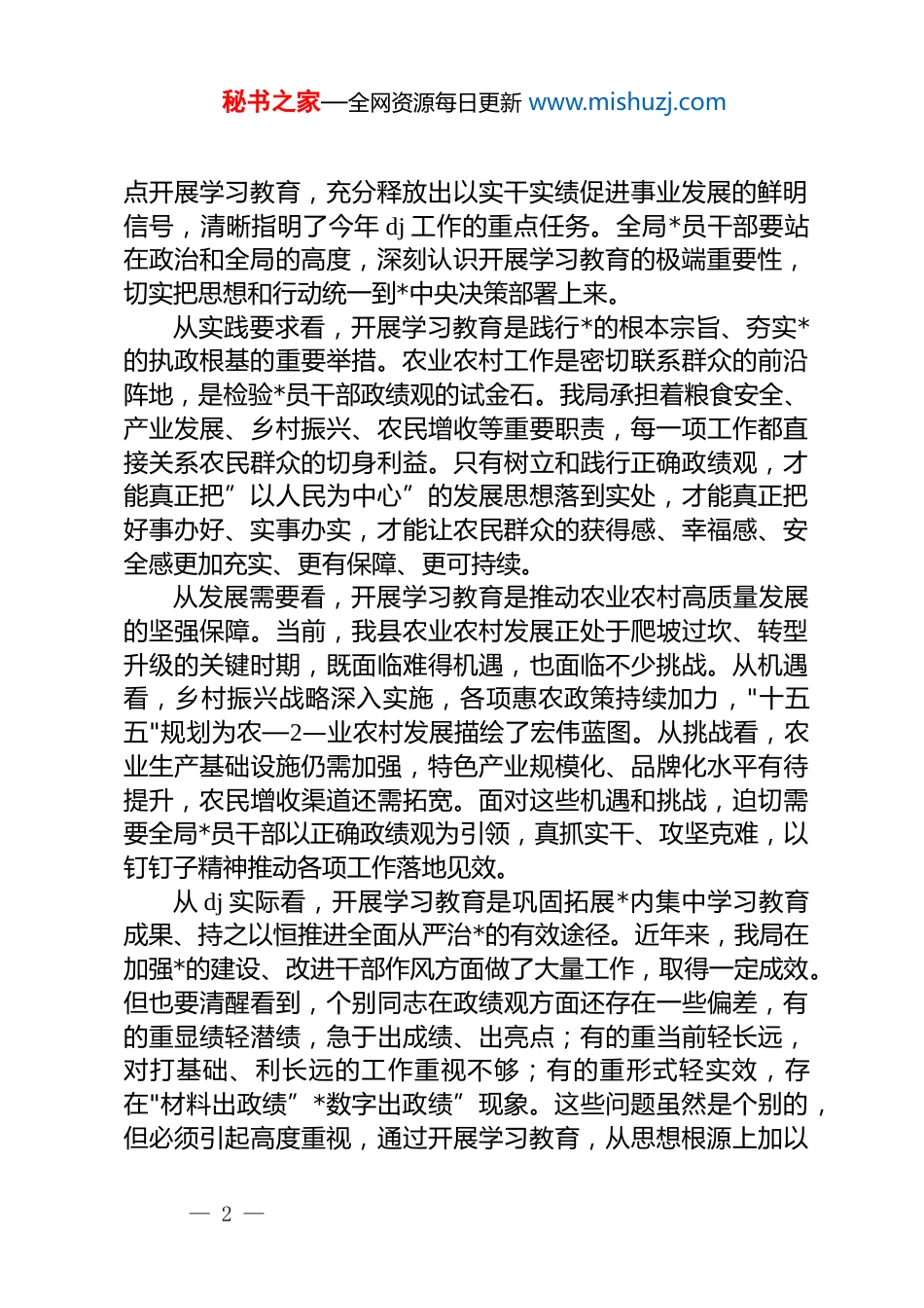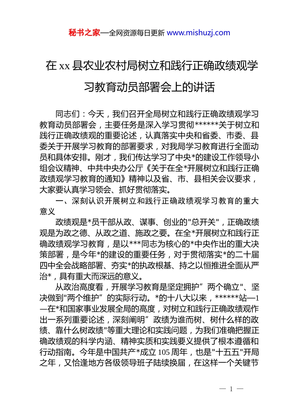 秘书之家—全网资源每日更新 www.mishuzj.com在 xx 县农业农村局树立和践行正确政绩观学习教育动员部署会上的讲话同志们:今天,我们召开全局树立和践行正确政绩观学习教育动员部署会,主要任务是深入学习贯彻******关于树立和践行正确政绩观的重要论述,认真落实中央和省委、市委、县委关于开展学习教育的部署要求,对我局学习教育进行全面动员和具体安排。刚才,我们传达学习了中央*的建设工作领导小组会议精神、中共中央办公厅《关于在全*开展树立和践行正确政绩观学习教育的通知》精神以及省、市、县相关会议要求,大家要认真学习领会、抓好贯彻落实。一、深刻认识开展树立和践行正确政绩观学习教育的重大意义政绩观是*员干部从政、谋事、创业的"总开关",正确政绩观是为政之德、从政之道、施政之要。在全*开展树立和践行正确政绩观学习教育,是以***同志为核心的*中央作出的重大决策部署,是今年*的建设的重要任务,对于贯彻落实*的二十届四中全会战略部署、夯实*的执政根基、持之以恒推进全面从严治*,具有重大而深远的意义。从政治高度看,开展学习教育是坚定拥护”两个确立"、坚决做到"两个维护”的实际行动。*的十八大以来,******站—1—在*和国家事业发展全局的高度,对树立和践行正确政绩观作出一系列重要论述,深刻阐明”政绩为谁而树、树什么样的政绩、靠什么树政绩"等重大理论和实践问题,为我们准确把握正确政绩观的科学内涵、精神实质和实践要义提供了根本遵循和行动指南。今年是中国共产*成立 105 周年,也是"十五五"开局之年,又恰逢地方各级领导班子陆续换届,在这样一个关键节— 1 —秘书之家—全网资源每日更新 www.mishuzj.com点开展学习教育,充分释放出以实干实绩促进事业发展的鲜明信号,清晰指明了今年 dj 工作的重点任务。全局*员干部要站在政治和全局的高度,深刻认识开展学习教育的极端重要性,切实把思想和行动统一到*中央决策部署上来。从实践要求看,开展学习教育是践行*的根本宗旨、夯实*的执政根基的重要举措。农业农村工作是密切联系群众的前沿阵地,是检验*员干部政绩观的试金石。我局承担着粮食安全、产业发展、乡村振兴、农民增收等重要职责,每一项工作都直接关系农民群众的切身利益。只有树立和践行正确政绩观,才能真正把”以人民为中心”的发展思想落到实处,才能真正把好事办好、实事办实,才能让农民群众的获得感、幸福感、安全感更加充实、更有保障、更可持续。从发展需要看,开展学习教育是推动农业农村高质量发展的坚强保障。当前,我县农业农村发展正处于爬坡过坎、转型升级的关键时期,既面临难得机遇,也面临不少挑战。从机遇看,乡村振兴战略深入实施,各项惠农政策持续加力,"十五五"规划为农—2—业农村发展描绘了宏伟蓝图。从挑战看,农业生产基础设施仍需加强,特色产业规模化、品牌化水平有待提升,农民增收渠道还需拓宽。面对这些机遇和挑战,迫切需要全局*员干部以正确政绩观为引领,真抓实干、攻坚克难,以钉钉子精神推动各项工作落地见效。从 dj 实际看,开展学习教育是巩固拓展*内集中学习教育成果、持之以恒推进全面从严治*的有效途径。近年来,我局在加强*的建设、改进干部作风方面做了大量工作,取得一定成效。但也要清醒看到,个别同志在政绩观方面还存在一些偏差,有的重显绩轻潜绩,急于出成绩、出亮点;有的重当前轻长远,对打基础、利长远的工作重视不够;有的重形式轻实效,存在"材料出政绩”*数字出政绩”现象。这些问题虽然是个别的,但必须引起高度重视,通过开展学习教育,从思想根源上加以— 2 —秘书之家—全网资源每日更新 www.mishuzj.com解决。二、准确把握树立和践行正确政绩观学习教育的目标要求开展学习教育,必须牢牢把握总要求,把”立*为公、为民造福、科学决策、真抓实干"贯穿学习教育全过程各方面,一体贯彻、全面落实。立*为公,就是要始终牢记*的性质宗旨,把*的事业放在第一位。农业农村工作是*的事业的重要组成部分,做好"三农"工作是关系国计民生的根本性问题。全局*员干部要时刻牢记”国之大者”,自觉把本职工作放到全县大局中去思考、去谋划、去推进,坚决贯彻落...