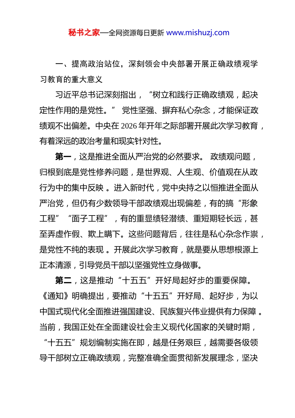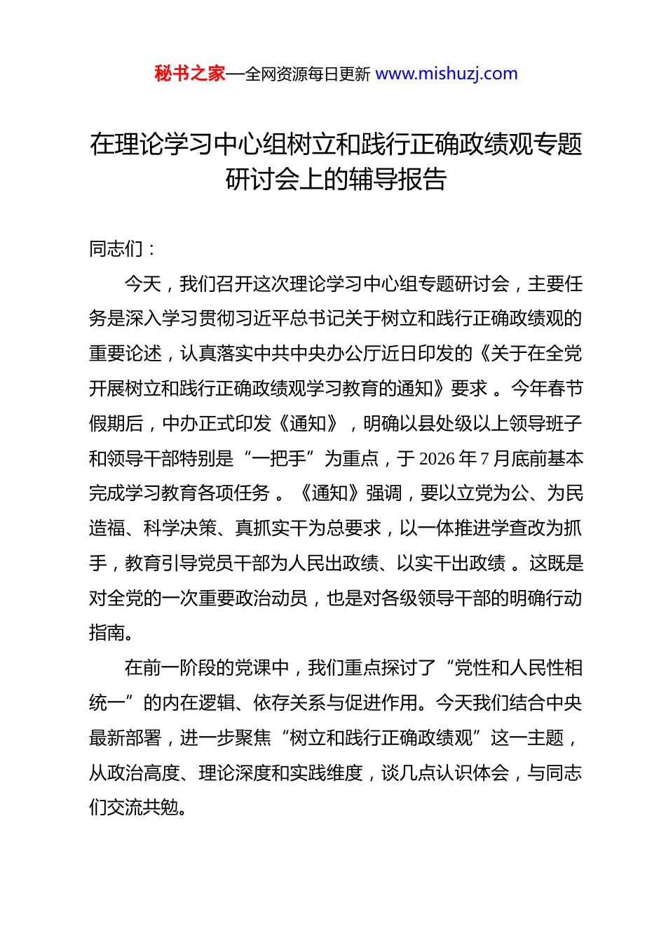 秘书之家—全网资源每日更新 www.mishuzj.com在理论学习中心组树立和践行正确政绩观专题研讨会上的辅导报告 同志们:今天,我们召开这次理论学习中心组专题研讨会,主要任务是深入学习贯彻习近平总书记关于树立和践行正确政绩观的重要论述,认真落实中共中央办公厅近日印发的《关于在全党开展树立和践行正确政绩观学习教育的通知》要求 。今年春节假期后,中办正式印发《通知》,明确以县处级以上领导班子和领导干部特别是“一把手”为重点,于 2026 年 7 月底前基本完成学习教育各项任务 。《通知》强调,要以立党为公、为民造福、科学决策、真抓实干为总要求,以一体推进学查改为抓手,教育引导党员干部为人民出政绩、以实干出政绩 。这既是对全党的一次重要政治动员,也是对各级领导干部的明确行动指南。在前一阶段的党课中,我们重点探讨了“党性和人民性相统一”的内在逻辑、依存关系与促进作用。今天我们结合中央最新部署,进一步聚焦“树立和践行正确政绩观”这一主题,从政治高度、理论深度和实践维度,谈几点认识体会,与同志们交流共勉。秘书之家—全网资源每日更新 www.mishuzj.com一、提高政治站位,深刻领会中央部署开展正确政绩观学习教育的重大意义习近平总书记深刻指出,“树立和践行正确政绩观,起决定性作用的是党性。” 党性坚强、摒弃私心杂念,才能保证政绩观不出偏差。中央在 2026 年开年之际部署开展此次学习教育,有着深远的政治考量和现实针对性。第一,这是推进全面从严治党的必然要求。 政绩观问题,归根到底是党性修养问题,是世界观、人生观、价值观在从政行为中的集中反映 。进入新时代,党中央持之以恒推进全面从严治党,但仍有少数领导干部政绩观出现偏差,有的搞“形象工程”“面子工程”,有的重显绩轻潜绩、重短期轻长远,甚至弄虚作假、欺上瞒下。这些问题背后,往往是私心杂念作祟,是党性不纯的表现 。开展此次学习教育,就是要从思想根源上正本清源,引导党员干部以坚强党性立身做事。第二,这是推动“十五五”开好局起好步的重要保障。 《通知》明确提出,要推动“十五五”开好局、起好步,为以中国式现代化全面推进强国建设、民族复兴伟业提供有力保障 。当前,我国正处在全面建设社会主义现代化国家的关键时期,“十五五”规划编制实施在即,越是任务艰巨,越需要各级领导干部树立正确政绩观,完整准确全面贯彻新发展理念,坚决秘书之家—全网资源每日更新 www.mishuzj.com防止简单以 GDP 增速论英雄的思维定势,追求高质量、可持续的发展实绩 。第三,这是践行以人民为中心发展思想的具体行动。 习近平总书记强调,“为民造福是最大政绩” 。《通知》明确要求,学习教育要坚持开门教育,查摆问题听取群众意见,整改整治接受群众监督,检验成效接受群众评判 。只有真正把人民放在心中最高位置,把好事实事做到群众心坎上,不断增强人民群众的获得感、幸福感、安全感,我们的政绩才能经得起人民检验 。二、把握核心要义,深刻理解“党性和人民性相统一”与正确政绩观的内在联系在前一阶段的党课中,我们系统梳理了党性和人民性相统一的理论根基、历史渊源和实践路径。今天要强调的是,正确政绩观正是党性和人民性相统一在实践层面的具体体现。(一)“政绩为谁而树”——党性决定政绩观的根本立场 党性原则是正确政绩观的根本原则。中国共产党始终代表最广大人民根本利益,与人民休戚与共、生死相依,没有任何自己特殊的利益 。这就决定了我们创造政绩的根本目的,不是为了个人升迁,不是为了局部利益,而是为了实现好、维护好、发展好最广大人民的根本利益。讲党性,首先就是要对党忠诚,秘书之家—全网资源每日更新 www.mishuzj.com站稳政治立场,始终同党中央保持高度一致 。只有党性坚强,才能在“为谁创造政绩”这一根本问题上不迷失方向。(二)“树什么样的政绩”——人民性决定正确政绩观的价值取向。 人民性是正确政绩观的根本特性。习近平总书记指出,要把实现好、维护好、发展好最广大人民根本利益作为出发点和落脚点,坚持以民为本、以人为本 。人民群众对美好生活的向往,就是我们的奋斗目...