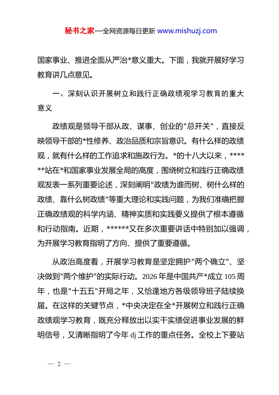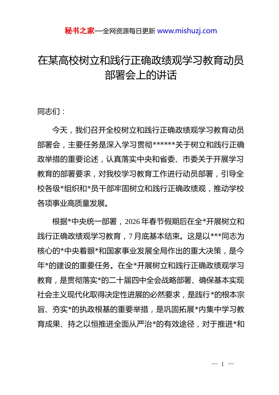 秘书之家—全网资源每日更新 www.mishuzj.com在某高校树立和践行正确政绩观学习教育动员部署会上的讲话同志们:今天,我们召开全校树立和践行正确政绩观学习教育动员部署会,主要任务是深入学习贯彻******关于树立和践行正确政举措的重要论述,认真落实中央和省委、市委关于开展学习教育的部署要求,对我校学习教育工作进行动员部署,引导全校各级*组织和*员干部牢固树立和践行正确政绩观,推动学校各项事业高质量发展。根据*中央统一部署,2026 年春节假期后在全*开展树立和践行正确政绩观学习教育,7 月底基本结束。这是以***同志为核心的*中央着眼*和国家事业发展全局作出的重大决策,是今年*的建设的重要任务。在全*开展树立和践行正确政绩观学习教育,是贯彻落实*的二十届四中全会战略部署、确保基本实现社会主义现代化取得决定性进展的必然要求,是践行*的根本宗旨、夯实*的执政根基的重要举措,是巩固拓展*内集中学习教育成果、持之以恒推进全面从严治*的有效途径,对于推进*和— 1 —秘书之家—全网资源每日更新 www.mishuzj.com国家事业、推进全面从严治*意义重大。下面,我就开展好学习教育讲几点意见。一、深刻认识开展树立和践行正确政绩观学习教育的重大意义政绩观是领导干部从政、谋事、创业的"总开关",直接反映领导干部的*性修养、政治品质和宗旨意识。有什么样的政绩观,就有什么样的工作追求和施政行为。*的十八大以来,******站在*和国家事业发展全局的高度,围绕树立和践行正确政绩观发表一系列重要论述,深刻阐明"政绩为谁而树、树什么样的政绩、靠什么树政绩"等重大理论和实践问题,为我们准确把握正确政绩观的科学内涵、精神实质和实践要义提供了根本遵循和行动指南。近期,******又在多次重要讲话中特别加以强调,为开展学习教育指明了方向、提供了重要遵循。从政治高度看,开展学习教育是坚定拥护"两个确立"、坚决做到"两个维护"的实际行动。2026 年是中国共产*成立 105 周年,也是"十五五"开局之年,又恰逢地方各级领导班子陆续换届。在这样的关键节点,*中央决定在全*开展树立和践行正确政绩观学习教育,既充分释放出以实干实绩促进事业发展的鲜明信号,又清晰指明了今年 dj 工作的重点任务。全校上下要站— 2 —秘书之家—全网资源每日更新 www.mishuzj.com在政治和全局的高度,深刻领悟"两个确立"的决定性意义,增强"四个意识"、坚定"四个自信"、做到"两个维护",以高度政治自觉把学习教育组织好、开展好、实施好。从办学治校看,开展学习教育是践行*的根本宗旨、夯实*的执政根基的重要举措。高等学校肩负着为*育人、为国育才的光荣使命,必须始终坚持社会主义办学方向,把立德树人成效作为检验一切工作的根本标准。只有树立正确政绩观,才能真正做到心系师生、服务师生,把关乎师生切身利益的事情办得更实、更好、更暖人心。近年来,学校在学科建设、人才培养、科学研究等方面取得了一定成绩,但也要清醒看到,个别单位和干部在工作中还存在急功近利、重"显绩"轻"潜绩"、重"硬件"轻"软件"等问题,有的甚至存在形式主义、官僚主义倾向。这些问题如果不及时纠正,就会影响学校事业发展的大局。从发展大局看,开展学习教育是激励实干担当、推动高质量发展的坚强保障。当前,学校正处于"申博升大"的关键时期,全日制在校学生近 12000 人,教职工 951 人,设有 17 个专业学院、55 个本科专业,拥有学术学位授权一级学科 3 个、专业学位授权类别 8 个。面对建设以数智科技为特色的高水平应用型大学的目标任务,更加需要正确的政绩观作引领,更加需要*员— 3 —秘书之家—全网资源每日更新 www.mishuzj.com干部以实事求是的态度、真抓实干的作风推动各项工作。开展学习教育,就是要教育引导全校*员干部坚持实事求是、求真务实,为人民出政绩、以实干出政绩,创造经得起实践、人民、历史检验的实绩,推动学校"十五五"开好局、起好步。二、准确把握树立和践行正确政绩观学习教育的总体要求这次学习教育,*中央明确提出了"立*为公、为民造福、科学决策、真抓实干"的总要求。这十六个字,深刻回答了政绩为谁而树、树什么样的政绩、...