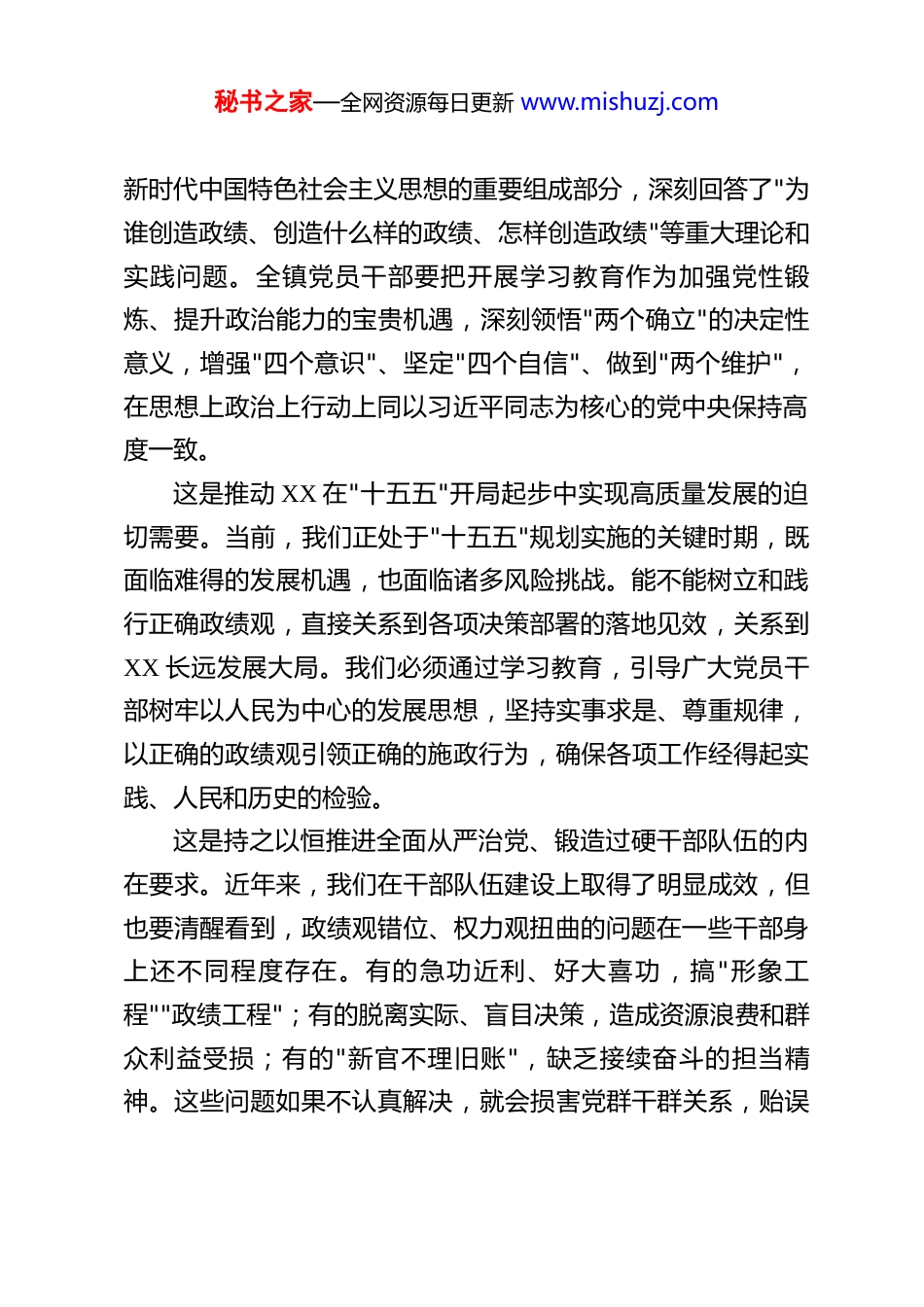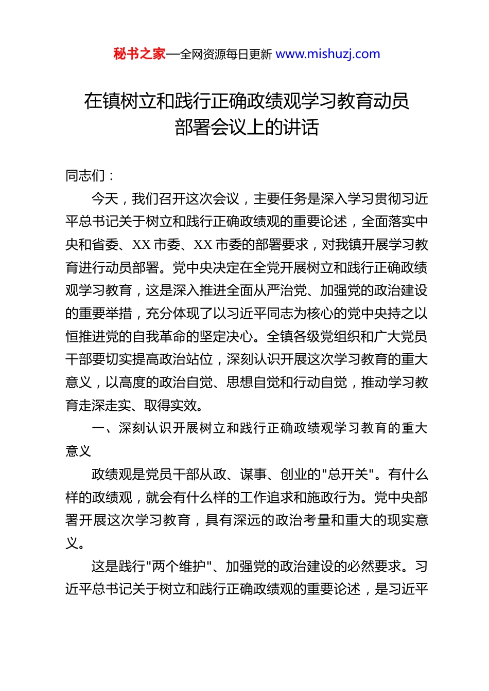 秘书之家—全网资源每日更新 www.mishuzj.com在镇树立和践行正确政绩观学习教育动员部署会议上的讲话 同志们:今天,我们召开这次会议,主要任务是深入学习贯彻习近平总书记关于树立和践行正确政绩观的重要论述,全面落实中央和省委、XX 市委、XX 市委的部署要求,对我镇开展学习教育进行动员部署。党中央决定在全党开展树立和践行正确政绩观学习教育,这是深入推进全面从严治党、加强党的政治建设的重要举措,充分体现了以习近平同志为核心的党中央持之以恒推进党的自我革命的坚定决心。全镇各级党组织和广大党员干部要切实提高政治站位,深刻认识开展这次学习教育的重大意义,以高度的政治自觉、思想自觉和行动自觉,推动学习教育走深走实、取得实效。一、深刻认识开展树立和践行正确政绩观学习教育的重大意义政绩观是党员干部从政、谋事、创业的"总开关"。有什么样的政绩观,就会有什么样的工作追求和施政行为。党中央部署开展这次学习教育,具有深远的政治考量和重大的现实意义。这是践行"两个维护"、加强党的政治建设的必然要求。习近平总书记关于树立和践行正确政绩观的重要论述,是习近平秘书之家—全网资源每日更新 www.mishuzj.com新时代中国特色社会主义思想的重要组成部分,深刻回答了"为谁创造政绩、创造什么样的政绩、怎样创造政绩"等重大理论和实践问题。全镇党员干部要把开展学习教育作为加强党性锻炼、提升政治能力的宝贵机遇,深刻领悟"两个确立"的决定性意义,增强"四个意识"、坚定"四个自信"、做到"两个维护",在思想上政治上行动上同以习近平同志为核心的党中央保持高度一致。这是推动 XX 在"十五五"开局起步中实现高质量发展的迫切需要。当前,我们正处于"十五五"规划实施的关键时期,既面临难得的发展机遇,也面临诸多风险挑战。能不能树立和践行正确政绩观,直接关系到各项决策部署的落地见效,关系到XX 长远发展大局。我们必须通过学习教育,引导广大党员干部树牢以人民为中心的发展思想,坚持实事求是、尊重规律,以正确的政绩观引领正确的施政行为,确保各项工作经得起实践、人民和历史的检验。这是持之以恒推进全面从严治党、锻造过硬干部队伍的内在要求。近年来,我们在干部队伍建设上取得了明显成效,但也要清醒看到,政绩观错位、权力观扭曲的问题在一些干部身上还不同程度存在。有的急功近利、好大喜功,搞"形象工程""政绩工程";有的脱离实际、盲目决策,造成资源浪费和群众利益受损;有的"新官不理旧账",缺乏接续奋斗的担当精神。这些问题如果不认真解决,就会损害党群干群关系,贻误秘书之家—全网资源每日更新 www.mishuzj.com事业发展。开展学习教育,就是要引导党员干部摒弃私心杂念,端正干事创业的出发点,涵养"功成不必在我、功成必定有我"的境界担当。二、准确把握学习教育的核心要义和目标任务这次学习教育,中央明确提出了"立党为公、为民造福、科学决策、真抓实干"的总要求。我们要深刻理解、准确把握、全面贯彻。要把"立党为公、为民造福"作为根本出发点。我们党来自人民、根植人民、服务人民,人民对美好生活的向往就是我们的奋斗目标。必须牢固树立为民造福是最大政绩的理念,把群众满意作为衡量政绩的根本标准。要深入践行新时代党的群众路线,想问题、作决策、办事情都要站在群众立场、考虑群众感受,用心用情用力解决好群众的急难愁盼问题。要把教育、医疗、养老、住房、出行等民生关切摆在更加突出的位置,让发展成果更多更公平惠及全镇人民,不断增强群众的获得感、幸福感、安全感。要把"科学决策、真抓实干"作为重要着力点。科学决策是创造正确政绩的前提,真抓实干是落实正确政绩的关键。要始终坚持实事求是,按客观规律办事,深入开展调查研究,使各项决策部署符合实际情况、符合客观规律、符合科学精神。要坚持"功成不必在我"的精神境界和"功成必定有我"的历史担当,既做显功也做潜功,既做让群众看得见、得实惠的实事,也做秘书之家—全网资源每日更新 www.mishuzj.com为后人作铺垫、打基础、利长远的好事。要发扬钉钉子精神,一锤接着一锤敲,一张蓝图绘到底,确保定一件干一件、干一件成一件。要把"一体推...