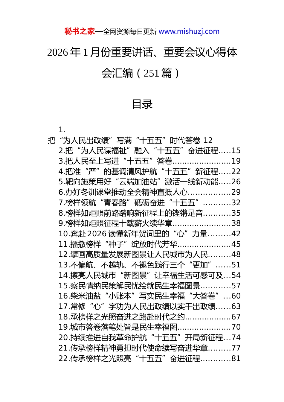 秘书之家—全网资源每日更新 www.mishuzj.com2026 年 1 月份重要讲话、重要会议心得体会汇编(251 篇)目录1.把“为人民出政绩”写满“十五五”时代答卷 122.把“为人民谋福祉”融入“十五五”奋进征程.....153.把人民至上写进“十五五”答卷........................194.把准“严”的基调清风护航“十五五”新征程.....225.靶向施策用好“云端加油站”激活一线新动能.....266.办好冬训课堂推动全会精神直抵人心.................297.榜样领航“青春路”砥砺奋进“十五五”...........328.榜样如炬照前路踏响新征程上的铿锵足音...........359.榜样如炬照征程十载薪火续华章........................3810.奔赴 2026 读懂新年贺词里的“心”力量.........4211.播撒榜样“种子”绽放时代芳华......................4512.擘画高质量发展新图景让人民城市为人民.........4813.不偏航、不越轨、不褪色践行三个“更加”......5114.擦亮人民城市“新图景”让幸福生活可感可及...5415.察民情纳民策解民忧绘就民生幸福图景............5716.柴米油盐“小账本”写实民生幸福“大答卷”...6017.常修“心”字功为人民出政绩以实干出政绩......6318.承榜样之光照奋进之路赴时代之约...................6719.城市答卷落笔处皆是民生幸福图......................7020.持续推进自我革命护航“十五五”开局新征程...7421.传承榜样精神勇担时代使命续写奋进华章.........7722.传承榜样之光照亮“十五五”奋进征程............81秘书之家—全网资源每日更新 www.mishuzj.com23.从“卷”中汲取真理写好为民服务“更”字篇...8424.从“开年第一课”中汲取奋进新征程的磅礴力量8725.从听讲到主讲:让党的创新理论“声”入人心...9026.从新年贺词中感悟向上的力量.........................9427.从周总理的风范看共产党人奋斗精神的传承......9728.从总书记的 12 次“开年第一课”中汲取力量..10129.搭建冬训课堂让全会精神入脑入心走深走实....10430.答好十年“长江大保护”生态、创新、幸福答卷...........................................................................10731.打造“三个课堂”让全会精神在基层落地生根.11032.砥砺新程勇破局青春逐梦“十五五”.............11333.砥砺新风护航“十五五”新征程....................11734.读懂“第五卷”答好民生卷..........................12035.读懂“卷”中义把群众事办细、办稳、办贴心.12336.读懂“新年贺词”奔赴基层新征程.................12637.读懂“至关重要”绘就“三农”新答卷..........12938.读懂大国“粮”策让中国人的饭碗端得更牢....13239.读懂贺词里的民生“暖实力”.......................13540.读懂十三载新年贺词里的“民重千钧”..........13841.读懂新年贺词背后的“为民”“爱民”“惠民”...........................................................................14142.读懂新年贺词里的“万家灯火暖”.................14443.读懂新年贺词里的民生牵挂书写为民幸福答卷.14744.读懂新年贺词里家国同心的“幸福密码”.......15045.读新年贺词悟奋进力量书时代答卷.................15346.奋力书写“十五五”开局新篇.......................15647.感悟“卷”中初心让实干担当温暖万家灯火....15948.感悟“卷”中初心让枝叶关情写满民生答卷....16249.感悟领悟体悟从“第五卷”中汲取奋进力量....16550.固根基、强动能、聚合力让大国粮仓家底更厚.16851.好办、快办、智办、暖办书写为民服务新篇章.171秘书之家—全网资源每日更新 www.mishuzj.com52.怀热望奔赴壮阔山海秉初心书写崭新答卷.......17453.惠民生、纾民困、暖民心让基层治理提质升温.17754.基层全会精神宣讲要讲准、讲活、讲透..........18055.基层全会精神宣讲要心贴心、面对面、实打实.18356.激活“两新”党建新引擎谱写融合发展新篇章.18657.汲取“榜样力量”让青春在实干中绽放..........19058.汲取“卷”中力量把初心写进群众的三餐四季.19359.汲取“卷”中治理智慧书写惠民利民答卷.......19660.汲取“卷”中智慧把初心写进群众的...