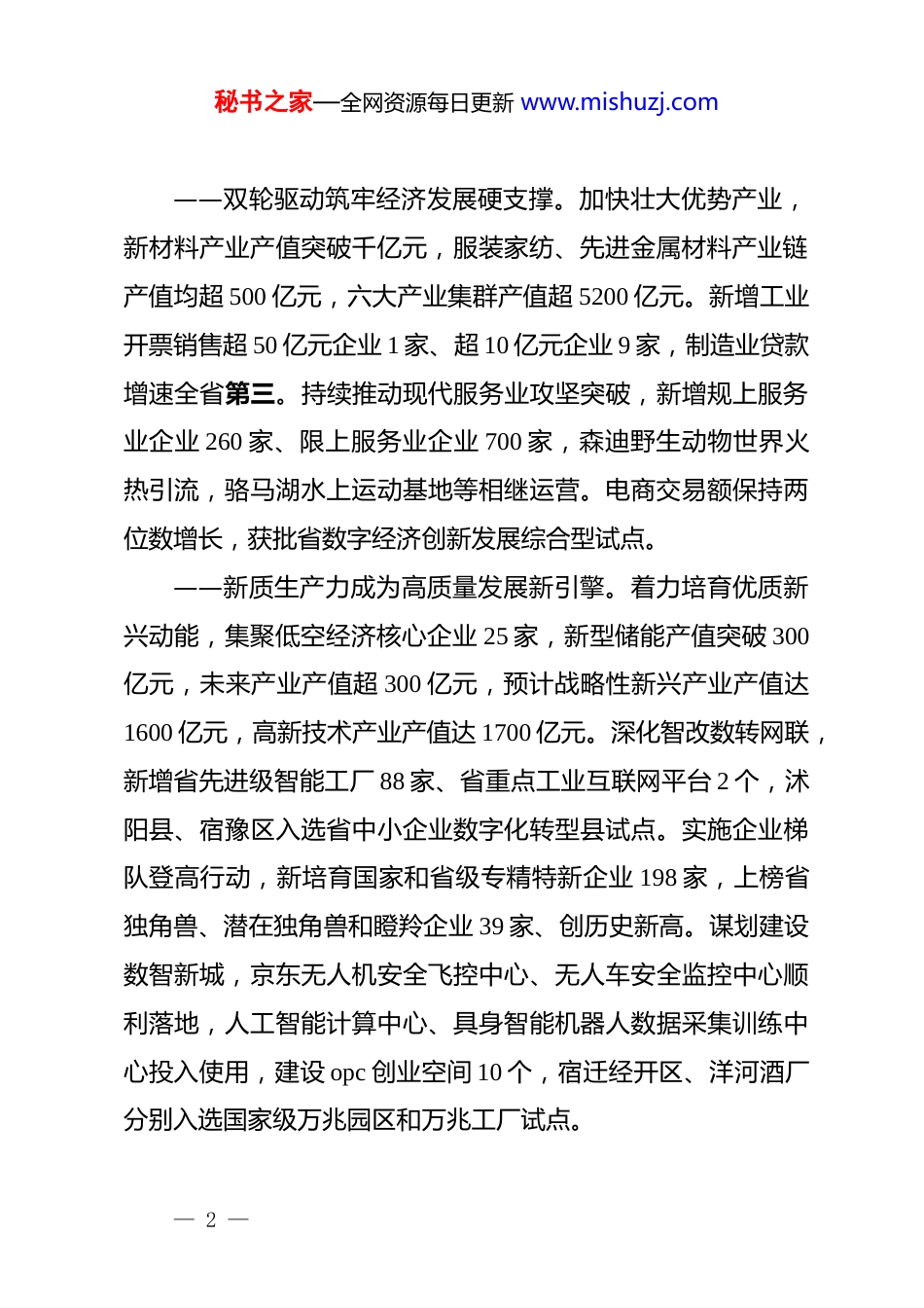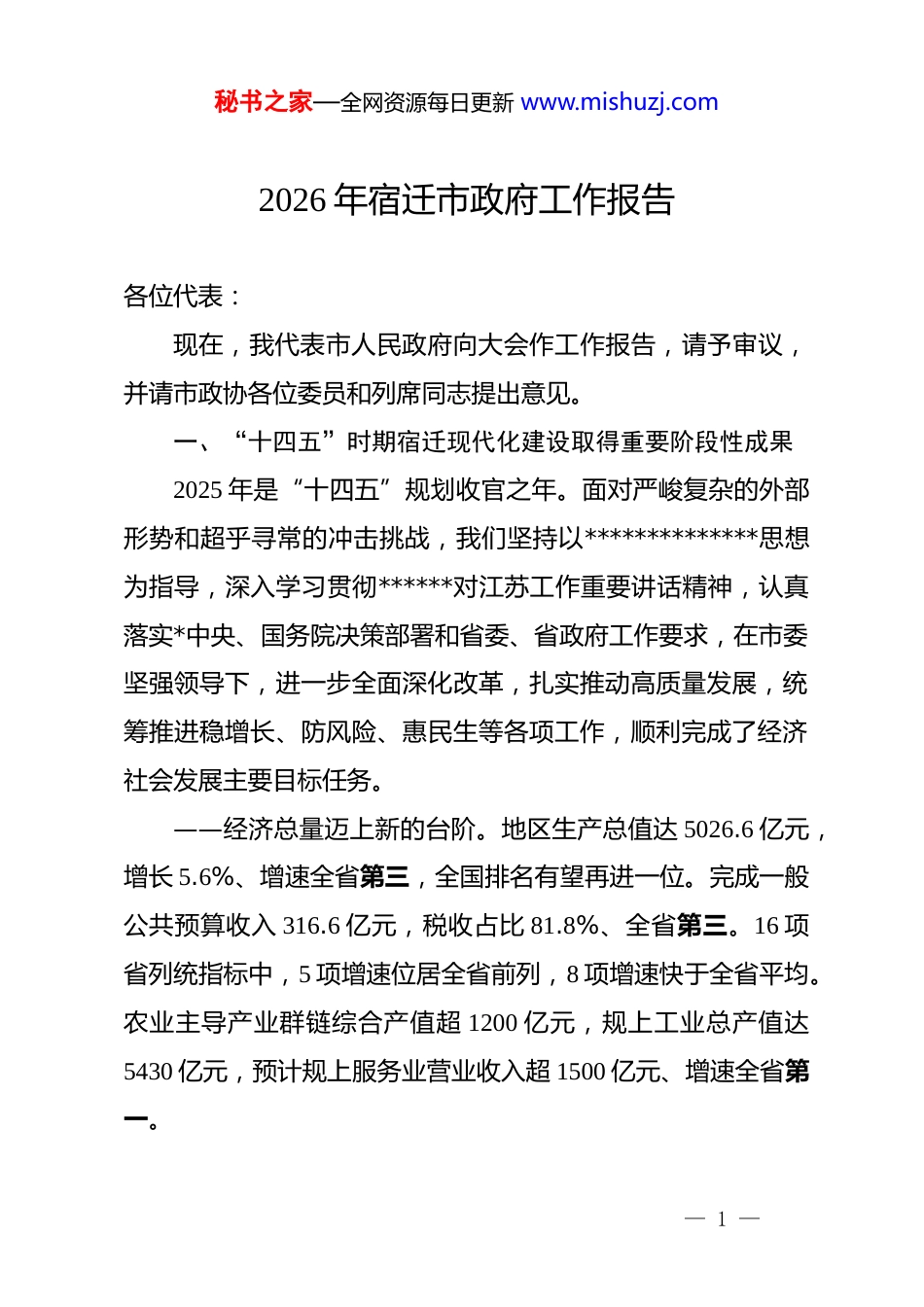 秘书之家—全网资源每日更新 www.mishuzj.com2026 年宿迁市政府工作报告各位代表:现在,我代表市人民政府向大会作工作报告,请予审议,并请市政协各位委员和列席同志提出意见。一、“十四五”时期宿迁现代化建设取得重要阶段性成果2025 年是“十四五”规划收官之年。面对严峻复杂的外部形势和超乎寻常的冲击挑战,我们坚持以**************思想为指导,深入学习贯彻******对江苏工作重要讲话精神,认真落实*中央、国务院决策部署和省委、省政府工作要求,在市委坚强领导下,进一步全面深化改革,扎实推动高质量发展,统筹推进稳增长、防风险、惠民生等各项工作,顺利完成了经济社会发展主要目标任务。——经济总量迈上新的台阶。地区生产总值达 5026.6 亿元,增长 5.6%、增速全省第三,全国排名有望再进一位。完成一般公共预算收入 316.6 亿元,税收占比 81.8%、全省第三。16 项省列统指标中,5 项增速位居全省前列,8 项增速快于全省平均。农业主导产业群链综合产值超 1200 亿元,规上工业总产值达5430 亿元,预计规上服务业营业收入超 1500 亿元、增速全省第一。— 1 —秘书之家—全网资源每日更新 www.mishuzj.com——双轮驱动筑牢经济发展硬支撑。加快壮大优势产业,新材料产业产值突破千亿元,服装家纺、先进金属材料产业链产值均超 500 亿元,六大产业集群产值超 5200 亿元。新增工业开票销售超 50 亿元企业 1 家、超 10 亿元企业 9 家,制造业贷款增速全省第三。持续推动现代服务业攻坚突破,新增规上服务业企业 260 家、限上服务业企业 700 家,森迪野生动物世界火热引流,骆马湖水上运动基地等相继运营。电商交易额保持两位数增长,获批省数字经济创新发展综合型试点。——新质生产力成为高质量发展新引擎。着力培育优质新兴动能,集聚低空经济核心企业 25 家,新型储能产值突破 300亿元,未来产业产值超 300 亿元,预计战略性新兴产业产值达1600 亿元,高新技术产业产值达 1700 亿元。深化智改数转网联,新增省先进级智能工厂 88 家、省重点工业互联网平台 2 个,沭阳县、宿豫区入选省中小企业数字化转型县试点。实施企业梯队登高行动,新培育国家和省级专精特新企业 198 家,上榜省独角兽、潜在独角兽和瞪羚企业 39 家、创历史新高。谋划建设数智新城,京东无人机安全飞控中心、无人车安全监控中心顺利落地,人工智能计算中心、具身智能机器人数据采集训练中心投入使用,建设 opc 创业空间 10 个,宿迁经开区、洋河酒厂分别入选国家级万兆园区和万兆工厂试点。— 2 —秘书之家—全网资源每日更新 www.mishuzj.com——扩大内需增强经济增长拉动力。实施提振消费专项行动,举办“嗨在宿迁”等活动 1000 余场,以旧换新撬动消费超150 亿元。培育潮购地标等新场景 25 个,京东折扣超市、盒马鲜生等首店相继落地,马拉松、音乐节、龙舟赛成功举办,“苏超”“宿超”火爆出圈,接待游客超 5000 万人次,实现旅游总收入超 500 亿元。持续推进招大引强,新开工亿元以上工业项目 500 个,新竣工 439 个,新达效 220 个。获批“两重”项目 6 个,列省重大项目完成投资超 300 亿元,三大类项目完成投资近 2600 亿元。——改革创新提升区域核心竞争力。推进“四化”同步集成改革,新增国省级试点 80 余项,入选农业用水权改革试点城市,成为生态产品价值实现机制国家试点、全省唯一。打造“六全六有”营商环境,知识产权保护等 17 个事项办结率全省第一。培育新型要素,全省首家增量配网虚拟电厂投入运营,位列全国数字百强市第 68 名。提升科技创新能力,有效发明专利拥有量、万人发明专利拥有量增速均居全省第一,转化高科技成果 319 项,获批省双高协同首批试点、省区域创新引擎计划项目试点。新引进大学生 3.42 万人、高层次人才及团队 133个,新竣工人才科技项目 531 个,“蚂蚁雄兵人才科技项目”获评全国创新案例。— 3 —秘书之家—全网资源每日更新 www.mishuzj.com——城市功能拓展内外开放新空间。深化与长三角城市群互联互通,潍宿高铁、连宿高速二期加快建设,新扬...