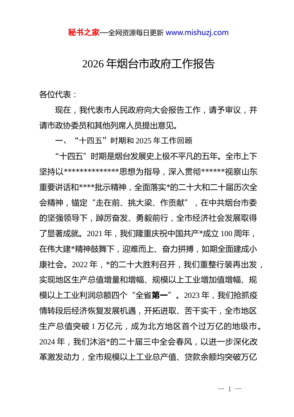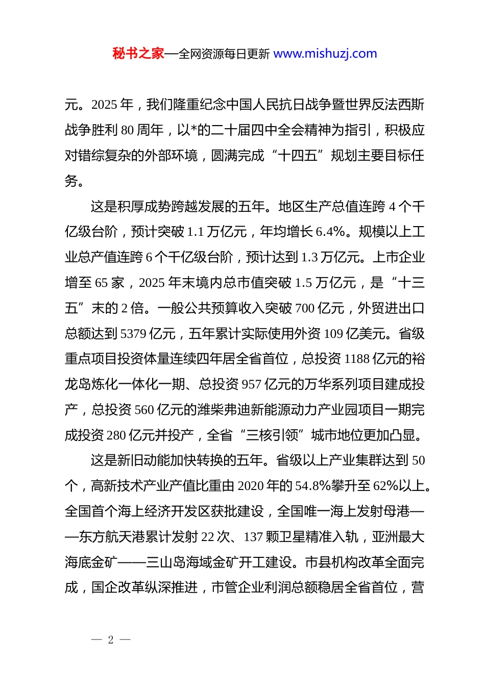 秘书之家—全网资源每日更新 www.mishuzj.com2026 年烟台市政府工作报告各位代表:现在,我代表市人民政府向大会报告工作,请予审议,并请市政协委员和其他列席人员提出意见。一、“十四五”时期和 2025 年工作回顾“十四五”时期是烟台发展史上极不平凡的五年。全市上下坚持以**************思想为指导,深入贯彻******视察山东重要讲话和****批示精神,全面落实*的二十大和二十届历次全会精神,锚定“走在前、挑大梁、作贡献”,在中共烟台市委的坚强领导下,踔厉奋发、勇毅前行,全市经济社会发展取得了显著成就。2021 年,我们隆重庆祝中国共产*成立 100 周年,在伟大建*精神鼓舞下,迎难而上、奋力拼搏,如期全面建成小康社会。2022 年,*的二十大胜利召开,我们重整行装再出发,实现地区生产总值增量和增幅、规模以上工业增加值增幅、规模以上工业利润总额四个“全省第一”。2023 年,我们抢抓疫情转段后经济恢复发展机遇,开拓进取、苦干实干,全市地区生产总值突破 1 万亿元,成为北方地区首个过万亿的地级市。2024 年,我们沐浴*的二十届三中全会春风,以进一步深化改革激发动力,全市规模以上工业总产值、贷款余额均突破万亿— 1 —秘书之家—全网资源每日更新 www.mishuzj.com元。2025 年,我们隆重纪念中国人民抗日战争暨世界反法西斯战争胜利 80 周年,以*的二十届四中全会精神为指引,积极应对错综复杂的外部环境,圆满完成“十四五”规划主要目标任务。这是积厚成势跨越发展的五年。地区生产总值连跨 4 个千亿级台阶,预计突破 1.1 万亿元,年均增长 6.4%。规模以上工业总产值连跨 6 个千亿级台阶,预计达到 1.3 万亿元。上市企业增至 65 家,2025 年末境内总市值突破 1.5 万亿元,是“十三五”末的 2 倍。一般公共预算收入突破 700 亿元,外贸进出口总额达到 5379 亿元,五年累计实际使用外资 109 亿美元。省级重点项目投资体量连续四年居全省首位,总投资 1188 亿元的裕龙岛炼化一体化一期、总投资 957 亿元的万华系列项目建成投产,总投资 560 亿元的潍柴弗迪新能源动力产业园项目一期完成投资 280 亿元并投产,全省“三核引领”城市地位更加凸显。这是新旧动能加快转换的五年。省级以上产业集群达到 50个,高新技术产业产值比重由 2020 年的 54.8%攀升至 62%以上。全国首个海上经济开发区获批建设,全国唯一海上发射母港——东方航天港累计发射 22 次、137 颗卫星精准入轨,亚洲最大海底金矿——三山岛海域金矿开工建设。市县机构改革全面完成,国企改革纵深推进,市管企业利润总额稳居全省首位,营— 2 —秘书之家—全网资源每日更新 www.mishuzj.com商环境连续四年居全省考核第一档次,4 项工作获得国务院督查激励和通报表扬。黄渤海新区获批设立,烟台经开区位居全国八强,自贸区推出省级以上制度创新成果 113 项,综保区连续六年获评全国 a 类,烟台高新区获批省级双创示范基地。中日韩创新合作中心、国家微纳制造创新中心、2 家全国重点实验室、2 家省实验室落地运营。高新技术企业达到 2403 家、总量翻番。163 项成果获国家、省科学技术奖。新引进各类人才31.5 万人。这是全面绿色低碳转型的五年。我市入选国家碳达峰试点城市,省人民政府出台支持烟台打造绿色低碳高质量发展示范城市政策,成功举办两届绿色低碳高质量发展大会,向全球发出国际零碳岛屿合作倡议。四大核电项目陆续推进,发出全省第一度海上风电,投运全国首个城市级虚拟电厂,清洁能源装机容量突破 2000 万千瓦、稳居全省首位。丁字湾新型能源创新区入选首批国家级零碳园区名单,培育省级以上绿色工业园区12 家,新增绿色建筑 5100 万平方米,海阳成为全国首个零碳供暖城市。常年保持空气质量国家二级标准,建成 7 个国家级美丽海湾、和美海岛,栖霞入选中国气候宜居城市,莱山跻身国家生态文明建设示范区,昆嵛山获评世界最佳自然保护地。这是城乡面貌持续改善的五年。市县国土空间总体规划获— 3 —秘书之家—全网资源每日更新 www.mishuzj.com批实施。大莱龙铁路全线电气化拉通,潍烟、莱荣高铁建成...
