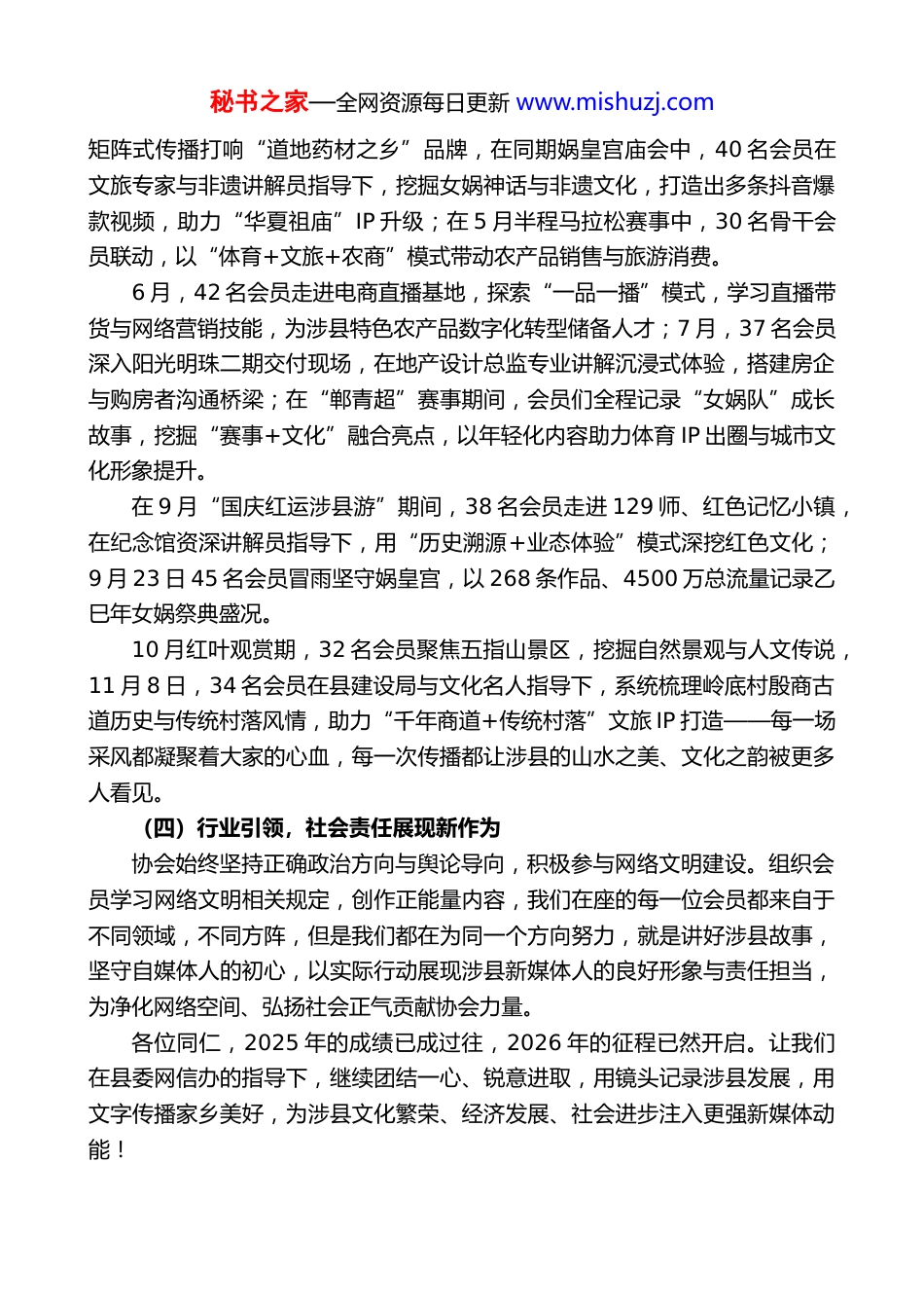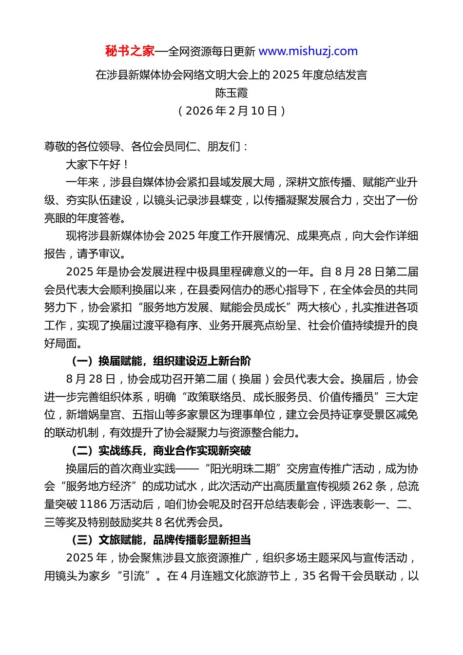 秘书之家—全网资源每日更新 www.mishuzj.com在涉县新媒体协会网络文明大会上的 2025 年度总结发言陈玉霞(2026 年 2 月 10 日)尊敬的各位领导、各位会员同仁、朋友们:大家下午好!一年来,涉县自媒体协会紧扣县域发展大局,深耕文旅传播、赋能产业升级、夯实队伍建设,以镜头记录涉县蝶变,以传播凝聚发展合力,交出了一份亮眼的年度答卷。现将涉县新媒体协会 2025 年度工作开展情况、成果亮点,向大会作详细报告,请予审议。2025 年是协会发展进程中极具里程碑意义的一年。自 8 月 28 日第二届会员代表大会顺利换届以来,在县委网信办的悉心指导下,在全体会员的共同努力下,协会紧扣“服务地方发展、赋能会员成长”两大核心,扎实推进各项工作,实现了换届过渡平稳有序、业务开展亮点纷呈、社会价值持续提升的良好局面。(一)换届赋能,组织建设迈上新台阶8 月 28 日,协会成功召开第二届(换届)会员代表大会。换届后,协会进一步完善组织体系,明确“政策联络员、成长服务员、价值传播员”三大定位,新增娲皇宫、五指山等多家景区为理事单位,建立会员持证享受景区减免的联动机制,有效提升了协会凝聚力与资源整合能力。(二)实战练兵,商业合作实现新突破换届后的首次商业实践——“阳光明珠二期”交房宣传推广活动,成为协会“服务地方经济”的成功试水,此次活动产出高质量宣传视频 262 条,总流量突破 1186 万活动后,咱们协会呢及时召开总结表彰会,评选表彰一、二、三等奖及特别鼓励奖共 8 名优秀会员。(三)文旅赋能,品牌传播彰显新担当2025 年,协会聚焦涉县文旅资源推广,组织多场主题采风与宣传活动,用镜头为家乡“引流”。在 4 月连翘文化旅游节上,35 名骨干会员联动,以秘书之家—全网资源每日更新 www.mishuzj.com矩阵式传播打响“道地药材之乡”品牌,在同期娲皇宫庙会中,40 名会员在文旅专家与非遗讲解员指导下,挖掘女娲神话与非遗文化,打造出多条抖音爆款视频,助力“华夏祖庙”IP 升级;在 5 月半程马拉松赛事中,30 名骨干会员联动,以“体育+文旅+农商”模式带动农产品销售与旅游消费。6 月,42 名会员走进电商直播基地,探索“一品一播”模式,学习直播带货与网络营销技能,为涉县特色农产品数字化转型储备人才;7 月,37 名会员深入阳光明珠二期交付现场,在地产设计总监专业讲解沉浸式体验,搭建房企与购房者沟通桥梁;在“郸青超”赛事期间,会员们全程记录“女娲队”成长故事,挖掘“赛事+文化”融合亮点,以年轻化内容助力体育 IP 出圈与城市文化形象提升。在 9 月“国庆红运涉县游”期间,38 名会员走进 129 师、红色记忆小镇,在纪念馆资深讲解员指导下,用“历史溯源+业态体验”模式深挖红色文化;9 月 23 日 45 名会员冒雨坚守娲皇宫,以 268 条作品、4500 万总流量记录乙巳年女娲祭典盛况。10 月红叶观赏期,32 名会员聚焦五指山景区,挖掘自然景观与人文传说,11 月 8 日,34 名会员在县建设局与文化名人指导下,系统梳理岭底村殷商古道历史与传统村落风情,助力“千年商道+传统村落”文旅 IP 打造——每一场采风都凝聚着大家的心血,每一次传播都让涉县的山水之美、文化之韵被更多人看见。(四)行业引领,社会责任展现新作为协会始终坚持正确政治方向与舆论导向,积极参与网络文明建设。组织会员学习网络文明相关规定,创作正能量内容,我们在座的每一位会员都来自于不同领域,不同方阵,但是我们都在为同一个方向努力,就是讲好涉县故事,坚守自媒体人的初心,以实际行动展现涉县新媒体人的良好形象与责任担当,为净化网络空间、弘扬社会正气贡献协会力量。各位同仁,2025 年的成绩已成过往,2026 年的征程已然开启。让我们在县委网信办的指导下,继续团结一心、锐意进取,用镜头记录涉县发展,用文字传播家乡美好,为涉县文化繁荣、经济发展、社会进步注入更强新媒体动能!秘书之家—全网资源每日更新 www.mishuzj.com以上报告,请各位审议。最后,值此新春佳节来临之际,提前给大家拜个早年,祝大家新年快乐、身体健康、工作顺利、万事如意!谢谢大家!