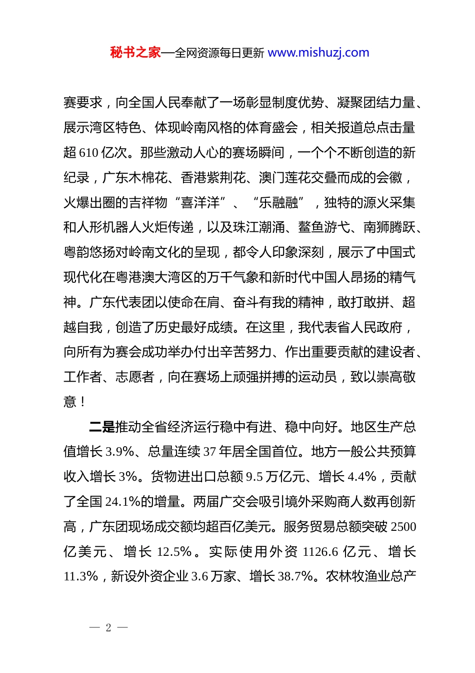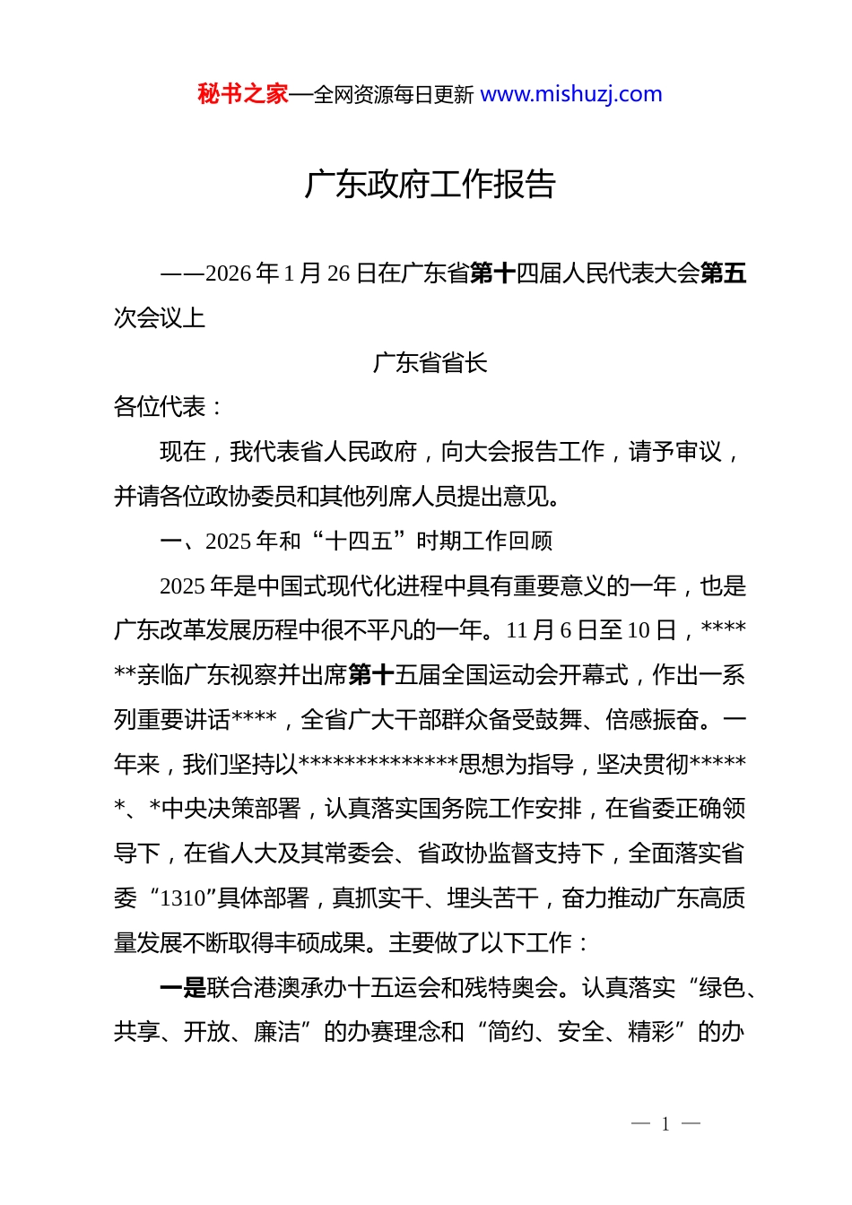 秘书之家—全网资源每日更新 www.mishuzj.com广东政府工作报告——2026 年 1 月 26 日在广东省第十四届人民代表大会第五次会议上广东省省长各位代表:现在,我代表省人民政府,向大会报告工作,请予审议,并请各位政协委员和其他列席人员提出意见。一、2025 年和“十四五”时期工作回顾2025 年是中国式现代化进程中具有重要意义的一年,也是广东改革发展历程中很不平凡的一年。11 月 6 日至 10 日,******亲临广东视察并出席第十五届全国运动会开幕式,作出一系列重要讲话****,全省广大干部群众备受鼓舞、倍感振奋。一年来,我们坚持以**************思想为指导,坚决贯彻******、*中央决策部署,认真落实国务院工作安排,在省委正确领导下,在省人大及其常委会、省政协监督支持下,全面落实省委“1310”具体部署,真抓实干、埋头苦干,奋力推动广东高质量发展不断取得丰硕成果。主要做了以下工作:一是联合港澳承办十五运会和残特奥会。认真落实“绿色、共享、开放、廉洁”的办赛理念和“简约、安全、精彩”的办— 1 —秘书之家—全网资源每日更新 www.mishuzj.com赛要求,向全国人民奉献了一场彰显制度优势、凝聚团结力量、展示湾区特色、体现岭南风格的体育盛会,相关报道总点击量超 610 亿次。那些激动人心的赛场瞬间,一个个不断创造的新纪录,广东木棉花、香港紫荆花、澳门莲花交叠而成的会徽,火爆出圈的吉祥物“喜洋洋”、“乐融融”,独特的源火采集和人形机器人火炬传递,以及珠江潮涌、鳌鱼游弋、南狮腾跃、粤韵悠扬对岭南文化的呈现,都令人印象深刻,展示了中国式现代化在粤港澳大湾区的万千气象和新时代中国人昂扬的精气神。广东代表团以使命在肩、奋斗有我的精神,敢打敢拼、超越自我,创造了历史最好成绩。在这里,我代表省人民政府,向所有为赛会成功举办付出辛苦努力、作出重要贡献的建设者、工作者、志愿者,向在赛场上顽强拼搏的运动员,致以崇高敬意!二是推动全省经济运行稳中有进、稳中向好。地区生产总值增长 3.9%、总量连续 37 年居全国首位。地方一般公共预算收入增长 3%。货物进出口总额 9.5 万亿元、增长 4.4%,贡献了全国 24.1%的增量。两届广交会吸引境外采购商人数再创新高,广东团现场成交额均超百亿美元。服务贸易总额突破 2500亿 美 元 、 增 长 12.5% 。 实 际 使 用 外 资 1126.6 亿 元 、 增 长11.3%,新设外资企业 3.6 万家、增长 38.7%。农林牧渔业总产— 2 —秘书之家—全网资源每日更新 www.mishuzj.com值增长 4.9%。规模以上工业企业达 7.6 万家、增加值增长3%,巴斯夫核心装置、埃克森美孚一期、华润微电子 12 英寸产线、深汕比亚迪二期等一批重大项目建成投产,无人机产量增长 39%、占全国 9 成,工业机器人产量增长 31.2%、占全国4 成,服务机器人产量增长 11.2%、占全国 8 成,新能源汽车产量增长 27.7%。银行机构本外币存贷款余额分别达 38.7 万亿元、29.9 万亿元,招银金投、信银金投开业运营,组建总规模 1000亿元的省战略性新兴产业投资引导基金,国家创业投资引导基金在大湾区设立超 500 亿元区域基金。开展“以旧换新”等促消费活动,社会消费品零售总额实现 4.6 万亿元、增长 2.8%。办好“跟着全运游广东”系列活动,推出广东文旅地图、购物地图、美食地图、健身地图,预计全年接待游客 9.6 亿人次、增长 10.3%,旅游总收入 1.24 万亿元、增长 12.5%,口岸出入境 人 员 达 5.2 亿 人 次 、 增 长 13.2% , 其 中 外 国 游 客 增 长34.9%,抵离口岸的交通工具达 2813.8 万辆(艘、架、列)次。努力扩大有效投资,新增专项债券和新型政策性金融工具规模居全国首位,获批超长期特别国债、中央预算内投资规模创历年之最。广湛高铁建成通车,广汕汕高铁全线贯通,高铁运营总里程 3411 公里、跃居全国第一。新增地铁运营里程 171.7 公里,广州、深圳地铁线网单日最高客运量分别达 1409 万、1305— 3 —秘书之家—全网资源每日更新 www.mishuzj.com万人次,均创历史新高。建成阳信高速、增天高速等,高速公路通...