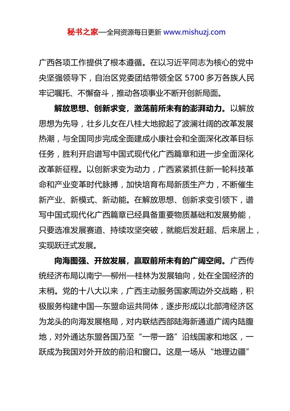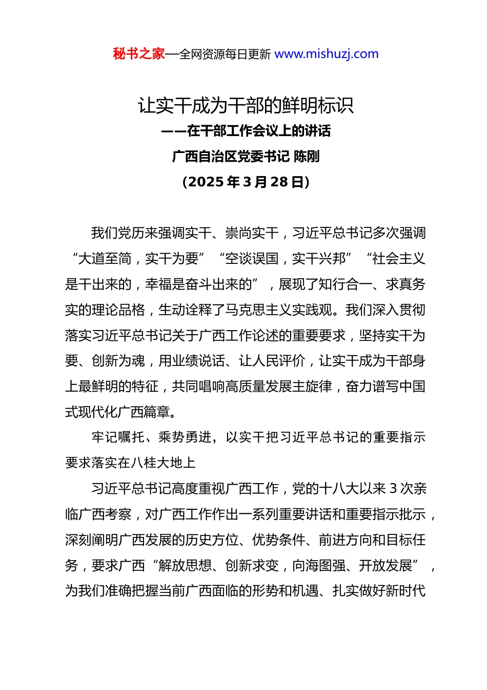 秘书之家—全网资源每日更新 www.mishuzj.com让实干成为干部的鲜明标识——在干部工作会议上的讲话广西自治区党委书记 陈刚(2025 年 3 月 28 日)我们党历来强调实干、崇尚实干,习近平总书记多次强调“大道至简,实干为要”“空谈误国,实干兴邦”“社会主义是干出来的,幸福是奋斗出来的”,展现了知行合一、求真务实的理论品格,生动诠释了马克思主义实践观。我们深入贯彻落实习近平总书记关于广西工作论述的重要要求,坚持实干为要、创新为魂,用业绩说话、让人民评价,让实干成为干部身上最鲜明的特征,共同唱响高质量发展主旋律,奋力谱写中国式现代化广西篇章。牢记嘱托、乘势勇进,以实干把习近平总书记的重要指示要求落实在八桂大地上习近平总书记高度重视广西工作,党的十八大以来 3 次亲临广西考察,对广西工作作出一系列重要讲话和重要指示批示,深刻阐明广西发展的历史方位、优势条件、前进方向和目标任务,要求广西“解放思想、创新求变,向海图强、开放发展”,为我们准确把握当前广西面临的形势和机遇、扎实做好新时代秘书之家—全网资源每日更新 www.mishuzj.com广西各项工作提供了根本遵循。在以习近平同志为核心的党中央坚强领导下,自治区党委团结带领全区 5700 多万各族人民牢记嘱托、不懈奋斗,推动各项事业不断开创新局面。解放思想、创新求变,激荡前所未有的澎湃动力。以解放思想为先导,壮乡儿女在八桂大地掀起了波澜壮阔的改革发展热潮,与全国同步完成全面建成小康社会和全面深化改革目标任务,胜利开启谱写中国式现代化广西篇章和进一步全面深化改革新征程。以创新求变为动力,广西紧紧抓住新一轮科技革命和产业变革时代脉搏,加快培育布局新质生产力,不断催生新产业、新模式、新动能。在解放思想、创新求变引领下,谱写中国式现代化广西篇章已经具备重要物质基础和发展势能,只要选准发展赛道、持续攻坚突破,就能后发赶超、后来居上,实现跃迁式发展。向海图强、开放发展,赢取前所未有的广阔空间。广西传统经济布局以南宁—柳州—桂林为发展轴向,处在全国经济的末梢。党的十八大以来,广西主动服务国家周边外交战略,积极服务构建中国—东盟命运共同体,逐步形成以北部湾经济区为龙头的向海发展格局,对内联结西部陆海新通道广阔内陆腹地,对外通达东盟各国乃至“一带一路”沿线国家和地区,一跃成为我国对外开放的前沿和窗口。这是一场从“地理边疆”秘书之家—全网资源每日更新 www.mishuzj.com到“战略枢纽”的深刻变革,是经济发展格局的根本性重构。向海方可图强,开放才有发展。壮乡人民已被大山围困上千年,一旦打开海陆门户,便再也不会停下向海奔腾的步伐。今日之广西,习近平总书记和党中央亲切关怀,国家层面给予鼎力支持,广大干部群众团结一心、精神振奋,天时地利人和,迎来了历史最好发展时期。必须抢抓机遇、乘势而上,千方百计把比较优势转化为发展优势,把历史机遇变成现实生产力,大踏步赶上时代,一步一个脚印把习近平总书记为广西擘画的宏伟蓝图变为美好现实。廓清思想认识,增强实干的自觉性坚定性事业都是干出来的。加快推进广西高质量发展,“干是不二选择”。必须脚踏实地干起来,以干事创业的艰辛努力赢得各项事业的长足发展。增进想干事的动力。只要真想干,就没有克服不了的困难。实践证明,哪里想干事的人多、想干事的风气浓厚,哪里发展就快、事业就红火,反之发展就会停滞甚至倒退,过多少年都还是“涛声依旧”。干部想干事,一靠内生动力,二靠外部压力。没有内生动力,干的激情容易消退或走偏;没有外部压力,人容易松弛懈怠拉胯,两者缺一不可。必须把“干”字刻进骨子里、融入血脉中,知责于心、担责于身、履责于行,自觉把秘书之家—全网资源每日更新 www.mishuzj.com本职岗位作为干事创业的广阔舞台,把组织的信任、群众的期待转化成履职尽责的具体行动,义不容辞扛起事业发展的千斤重担。着力营造良好条件和氛围,让真想干的人有机会有舞台、有成就感和荣誉感,让躺平混日子的人没市场、靠边站。理清干的思路,提高干的本领。干工作不能拍脑袋、凭感觉,必须深入思考、精准研判、科学决策...