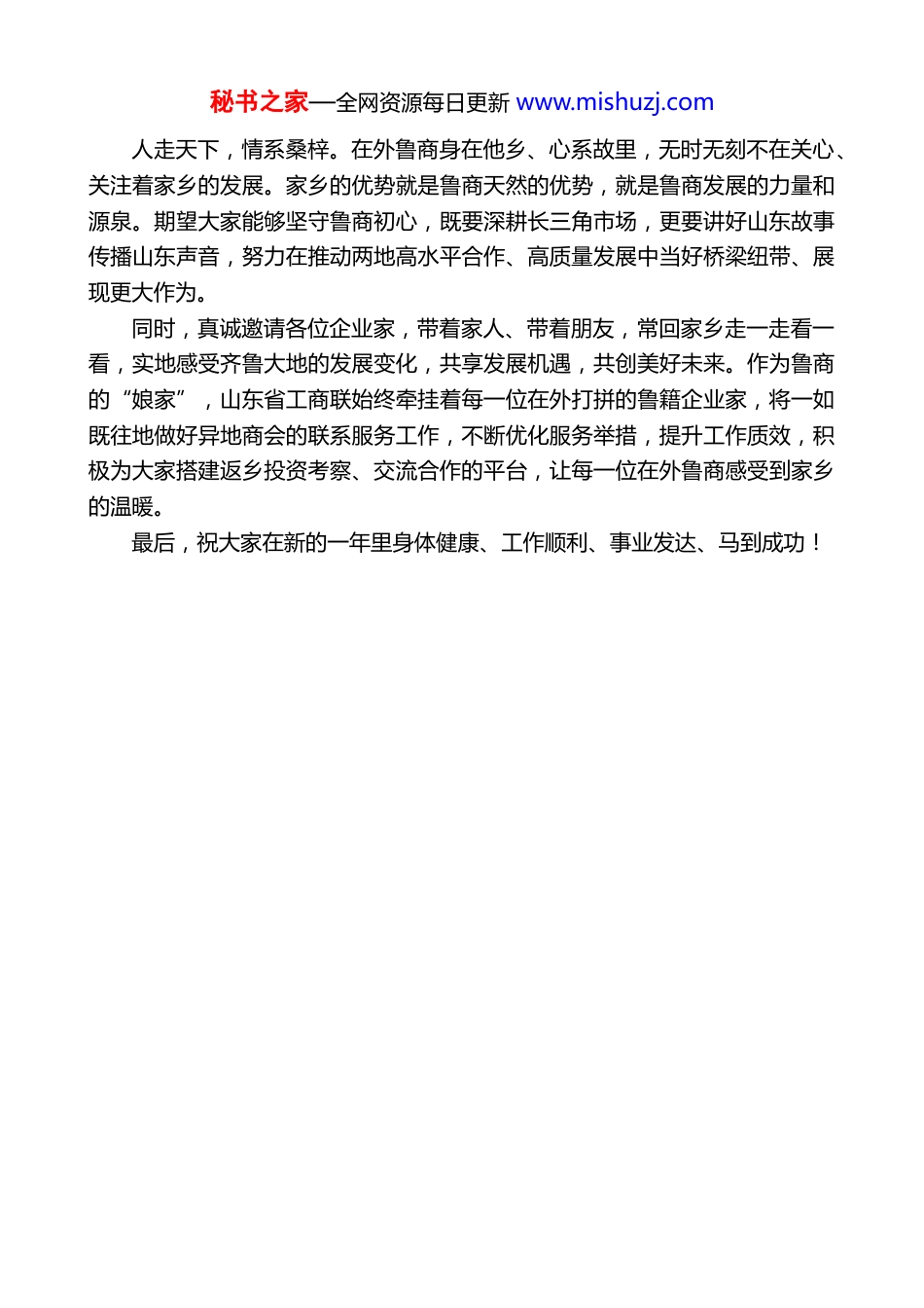 秘书之家—全网资源每日更新 www.mishuzj.com在第四届长三角鲁商高质量发展大会暨 2026 年山东驻长三角各界人士新春团拜会上的致辞山东省工商联副主席郭建礼(2026 年 2 月 1 日)尊敬的各位领导,各位嘉宾朋友,各位企业家们:大家下午好!年关将至,春序启新。很高兴在这辞旧迎新的时节与大家相聚在上海,共同参加 2026 第四届长三角鲁商高质量发展大会暨上海市山东商会会员代表大会。首先,请允许我代表山东省工商联、山东省总商会,对大会的成功召开表示热烈的祝贺!向长期以来关心支持鲁商发展和商会建设的社会各界朋友表示衷心的感谢!向各位山东老乡表示诚挚的问候!长三角地区是我国经济最具活力、开放程度最高、创新能力最强的区域之一,上海作为长三角城市群的龙头和中心城市,在带动、促进区域率先发展、一体化发展方面起着举足轻重的作用。多年来,上海市山东商会始终坚守鲁商初心,持续发挥桥梁纽带作用,立足长三角地区的资源、区位、人才等优势,致力于促进两地的经济交流合作,多次策划组织商会会员和企业家回乡投资考察,举办了一系列卓有成效的活动,扩大了商会的影响力,展示了山东人的良好形象,为推动山东和长三角地区合作发展汇聚了强大力量。习近平总书记对山东发展关怀备至、寄予厚望,赋予山东“走在前、挑大梁”的重大使命。山东省委、省政府锚定高质量发展主题,深入落实黄河重大国家战略,加快建设绿色低碳高质量发展先行区,着力打造高水平对外开放新高地,持续激活齐鲁大地发展动能,全省地区生产总值连续跨过 3 个万亿级台阶,成为全国第三个、北方第一个过 10 万亿元省份,新征程上现代化强省建设实现良好开局。山东省委、省政府一直高度重视民营经济发展,建立并落实党政领导干部联系服务民营企业和商会制度,发布实施《山东省民营经济促进条例》,深入开展服务民营企业专项行动,召开民营企业座谈会,着力解决民营企业发展中遇到的实际困难。今天的山东,民营经济发展正面临着难得的发展机遇和广阔舞台。秘书之家—全网资源每日更新 www.mishuzj.com人走天下,情系桑梓。在外鲁商身在他乡、心系故里,无时无刻不在关心、关注着家乡的发展。家乡的优势就是鲁商天然的优势,就是鲁商发展的力量和源泉。期望大家能够坚守鲁商初心,既要深耕长三角市场,更要讲好山东故事传播山东声音,努力在推动两地高水平合作、高质量发展中当好桥梁纽带、展现更大作为。同时,真诚邀请各位企业家,带着家人、带着朋友,常回家乡走一走看一看,实地感受齐鲁大地的发展变化,共享发展机遇,共创美好未来。作为鲁商的“娘家”,山东省工商联始终牵挂着每一位在外打拼的鲁籍企业家,将一如既往地做好异地商会的联系服务工作,不断优化服务举措,提升工作质效,积极为大家搭建返乡投资考察、交流合作的平台,让每一位在外鲁商感受到家乡的温暖。最后,祝大家在新的一年里身体健康、工作顺利、事业发达、马到成功!