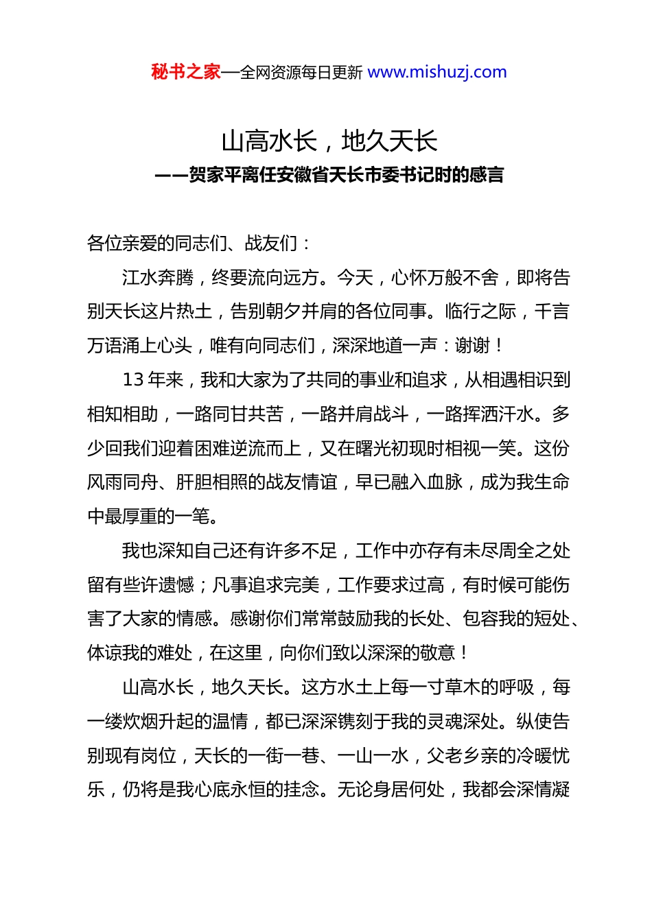 秘书之家—全网资源每日更新 www.mishuzj.com山高水长,地久天长——贺家平离任安徽省天长市委书记时的感言各位亲爱的同志们、战友们:江水奔腾,终要流向远方。今天,心怀万般不舍,即将告别天长这片热土,告别朝夕并肩的各位同事。临行之际,千言万语涌上心头,唯有向同志们,深深地道一声:谢谢!13 年来,我和大家为了共同的事业和追求,从相遇相识到相知相助,一路同甘共苦,一路并肩战斗,一路挥洒汗水。多少回我们迎着困难逆流而上,又在曙光初现时相视一笑。这份风雨同舟、肝胆相照的战友情谊,早已融入血脉,成为我生命中最厚重的一笔。我也深知自己还有许多不足,工作中亦存有未尽周全之处留有些许遗憾;凡事追求完美,工作要求过高,有时候可能伤害了大家的情感。感谢你们常常鼓励我的长处、包容我的短处、体谅我的难处,在这里,向你们致以深深的敬意!山高水长,地久天长。这方水土上每一寸草木的呼吸,每一缕炊烟升起的温情,都已深深镌刻于我的灵魂深处。纵使告别现有岗位,天长的一街一巷、一山一水,父老乡亲的冷暖忧乐,仍将是我心底永恒的挂念。无论身居何处,我都会深情凝秘书之家—全网资源每日更新 www.mishuzj.com望这片土地,默默为天长的每一次进步而欢欣,为天长的每一份荣光而祝福。遥远不远,未来已来,再道一声珍重!祝愿天长,祈福千秋,地久相随,我心永在!