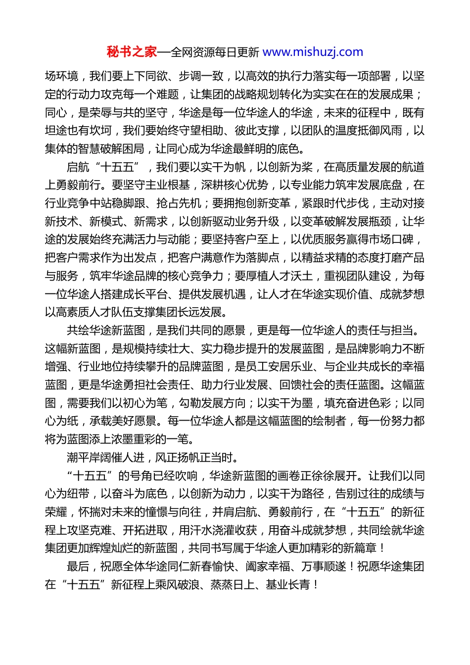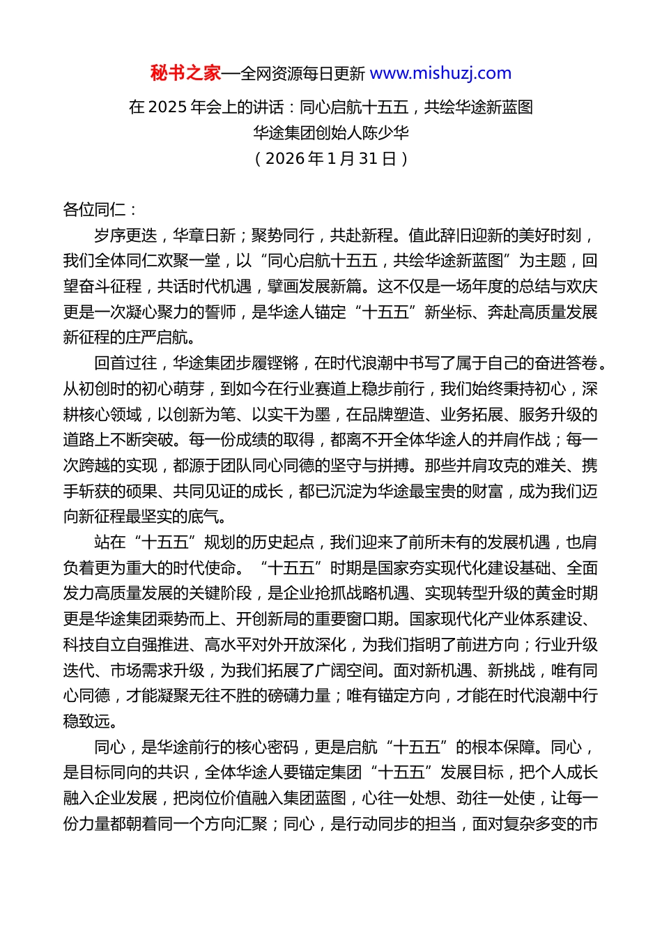 秘书之家—全网资源每日更新 www.mishuzj.com在 2025 年会上的讲话:同心启航十五五,共绘华途新蓝图华途集团创始人陈少华(2026 年 1 月 31 日)各位同仁:岁序更迭,华章日新;聚势同行,共赴新程。值此辞旧迎新的美好时刻,我们全体同仁欢聚一堂,以“同心启航十五五,共绘华途新蓝图”为主题,回望奋斗征程,共话时代机遇,擘画发展新篇。这不仅是一场年度的总结与欢庆更是一次凝心聚力的誓师,是华途人锚定“十五五”新坐标、奔赴高质量发展新征程的庄严启航。回首过往,华途集团步履铿锵,在时代浪潮中书写了属于自己的奋进答卷。从初创时的初心萌芽,到如今在行业赛道上稳步前行,我们始终秉持初心,深耕核心领域,以创新为笔、以实干为墨,在品牌塑造、业务拓展、服务升级的道路上不断突破。每一份成绩的取得,都离不开全体华途人的并肩作战;每一次跨越的实现,都源于团队同心同德的坚守与拼搏。那些并肩攻克的难关、携手斩获的硕果、共同见证的成长,都已沉淀为华途最宝贵的财富,成为我们迈向新征程最坚实的底气。站在“十五五”规划的历史起点,我们迎来了前所未有的发展机遇,也肩负着更为重大的时代使命。“十五五”时期是国家夯实现代化建设基础、全面发力高质量发展的关键阶段,是企业抢抓战略机遇、实现转型升级的黄金时期更是华途集团乘势而上、开创新局的重要窗口期。国家现代化产业体系建设、科技自立自强推进、高水平对外开放深化,为我们指明了前进方向;行业升级迭代、市场需求升级,为我们拓展了广阔空间。面对新机遇、新挑战,唯有同心同德,才能凝聚无往不胜的磅礴力量;唯有锚定方向,才能在时代浪潮中行稳致远。同心,是华途前行的核心密码,更是启航“十五五”的根本保障。同心,是目标同向的共识,全体华途人要锚定集团“十五五”发展目标,把个人成长融入企业发展,把岗位价值融入集团蓝图,心往一处想、劲往一处使,让每一份力量都朝着同一个方向汇聚;同心,是行动同步的担当,面对复杂多变的市秘书之家—全网资源每日更新 www.mishuzj.com场环境,我们要上下同欲、步调一致,以高效的执行力落实每一项部署,以坚定的行动力攻克每一个难题,让集团的战略规划转化为实实在在的发展成果;同心,是荣辱与共的坚守,华途是每一位华途人的华途,未来的征程中,既有坦途也有坎坷,我们要始终守望相助、彼此支撑,以团队的温度抵御风雨,以集体的智慧破解困局,让同心成为华途最鲜明的底色。启航“十五五”,我们要以实干为帆,以创新为桨,在高质量发展的航道上勇毅前行。要坚守主业根基,深耕核心优势,以专业能力筑牢发展底盘,在行业竞争中站稳脚跟、抢占先机;要拥抱创新变革,紧跟时代步伐,主动对接新技术、新模式、新需求,以创新驱动业务升级,以变革破解发展瓶颈,让华途的发展始终充满活力与动能;要坚持客户至上,以优质服务赢得市场口碑,把客户需求作为出发点,把客户满意作为落脚点,以精益求精的态度打磨产品与服务,筑牢华途品牌的核心竞争力;要厚植人才沃土,重视团队建设,为每一位华途人搭建成长平台、提供发展机遇,让人才在华途实现价值、成就梦想以高素质人才队伍支撑集团长远发展。共绘华途新蓝图,是我们共同的愿景,更是每一位华途人的责任与担当。这幅新蓝图,是规模持续壮大、实力稳步提升的发展蓝图,是品牌影响力不断增强、行业地位持续攀升的品牌蓝图,是员工安居乐业、与企业共成长的幸福蓝图,更是华途勇担社会责任、助力行业发展、回馈社会的责任蓝图。这幅蓝图,需要我们以初心为笔,勾勒发展方向;以实干为墨,填充奋进色彩;以同心为纸,承载美好愿景。每一位华途人都是这幅蓝图的绘制者,每一份努力都将为蓝图添上浓墨重彩的一笔。潮平岸阔催人进,风正扬帆正当时。“十五五”的号角已经吹响,华途新蓝图的画卷正徐徐展开。让我们以同心为纽带,以奋斗为底色,以创新为动力,以实干为路径,告别过往的成绩与荣耀,怀揣对未来的憧憬与向往,并肩启航、勇毅前行,在“十五五”的新征程上攻坚克难、开拓进取,用汗水浇灌收获,用奋斗成就梦想,共同绘就华途集团更加辉煌灿烂的新蓝图,共同书写属于华途人...