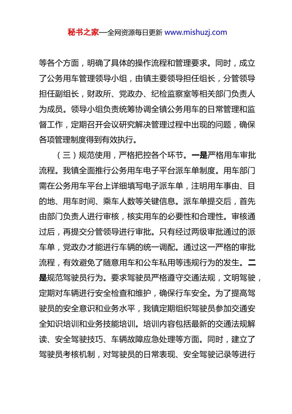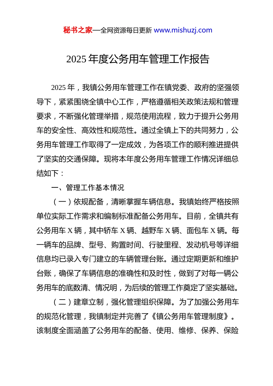 秘书之家—全网资源每日更新 www.mishuzj.com2025 年度公务用车管理工作报告 2025 年,我镇公务用车管理工作在镇党委、政府的坚强领导下,紧紧围绕全镇中心工作,严格遵循相关政策法规和管理要求,不断强化管理举措,规范使用流程,致力于提升公务用车的安全性、高效性和规范性。通过全镇上下的共同努力,公务用车管理工作取得了一定成效,为各项工作的顺利推进提供了坚实的交通保障。现将本年度公务用车管理工作情况详细总结如下:一、管理工作基本情况(一)依规配备,清晰掌握车辆信息。我镇始终严格按照单位实际工作需求和编制标准配备公务用车。目前,全镇共有公务用车 X 辆,其中轿车 X 辆、越野车 X 辆、面包车 X 辆。每一辆车的品牌、型号、购置时间、行驶里程、发动机号等详细信息均已录入专门建立的车辆管理台账。通过定期更新和维护台账,确保了车辆信息的准确性和及时性,做到了对每一辆公务用车的底数清、情况明,为后续的管理工作奠定了坚实基础。(二)建章立制,强化管理组织保障。为了加强公务用车的规范化管理,我镇制定并完善了《镇公务用车管理制度》。该制度全面涵盖了公务用车的配备、使用、维修、保养、保险秘书之家—全网资源每日更新 www.mishuzj.com等各个方面,明确了具体的操作流程和管理要求。同时,成立了公务用车管理领导小组,由镇主要领导担任组长,分管领导担任副组长,财政所、党政办、纪检监察室等相关部门负责人为成员。领导小组负责统筹协调全镇公务用车的日常管理和监督工作,定期召开会议研究解决管理过程中出现的问题,确保各项管理制度得到有效执行。(三)规范使用,严格把控各个环节。一是严格用车审批流程。我镇全面推行公务用车电子平台派车单制度。用车部门需在公务用车平台上详细填写电子派车单,注明用车事由、目的地、用车时间、乘车人数等关键信息。派车单提交后,首先由部门负责人进行审核,核实用车的必要性和合理性。审核通过后,再提交分管领导进行审批。只有经过两级审批通过的派车单,党政办才能进行车辆的统一调配。通过这一严格的审批流程,有效避免了随意用车和公车私用等违规行为的发生。二是规范驾驶员行为。要求驾驶员严格遵守交通法规,文明驾驶,定期对车辆进行安全检查和维护,确保行车安全。为了提高驾驶员的安全意识和业务水平,我镇定期组织驾驶员参加交通安全知识培训和业务技能培训。培训内容包括最新的交通法规解读、安全驾驶技巧、车辆故障应急处理等方面。同时,建立了驾驶员考核机制,对驾驶员的日常表现、安全驾驶记录等进行秘书之家—全网资源每日更新 www.mishuzj.com综合考核,考核结果与驾驶员的绩效挂钩,激励驾驶员不断提高自身素质和服务水平。三是做好车辆使用登记。对每一次公务用车的使用情况进行详细登记,建立了完善的车辆使用台账。登记内容包括出车时间、返回时间、行驶里程、油耗、用车人员等信息。通过对车辆使用台账的分析和统计,可以及时了解车辆的使用频率、行驶路线、油耗情况等,为合理安排车辆调度、降低运行成本提供了有力依据。同时,车辆使用登记也便于对车辆使用情况进行监督和管理,确保每一次用车都符合规定。(四)精细维保,确保车辆性能良好。一是建立定点维修制度。我镇公务用车维修实行定点维修制度。经过严格的筛选和评估,选择了具有资质、信誉良好的 X 家维修企业作为年度定点维修单位,并与这些维修单位签订了详细的维修服务合同。车辆维修前,驾驶员需填写维修申请单,注明维修项目、预计费用等信息。维修申请单经党政办审核、分管领导审批后,方可将车辆送至定点维修单位进行维修。维修过程中,维修单位需及时向我镇反馈维修进展情况和费用明细,确保维修工作的透明度和合理性。二是定期保养与清洗。为了确保车辆性能良好,延长车辆使用寿命,我镇为公务车设定了定点包月清洗制度和定期保养计划。每月定期安排车辆到指定的洗车点进行清秘书之家—全网资源每日更新 www.mishuzj.com洗,保持车辆外观整洁。同时,根据车辆的使用年限、行驶里程和厂家建议,制定了详细的保养计划,定期将车辆送至定点维修单位进行保养。保养内容包括更换机油...