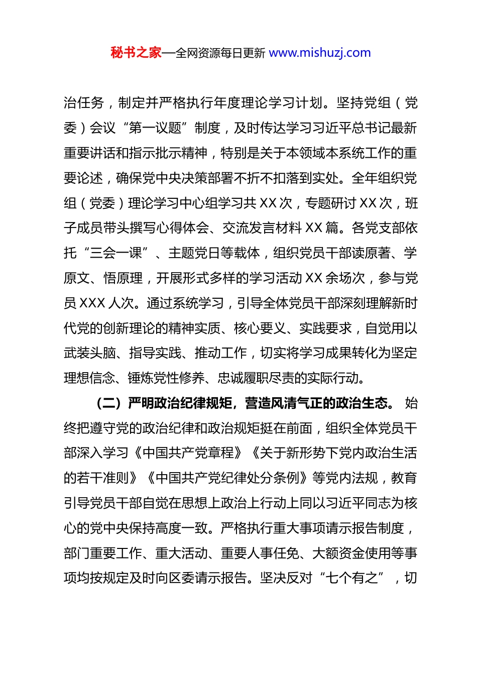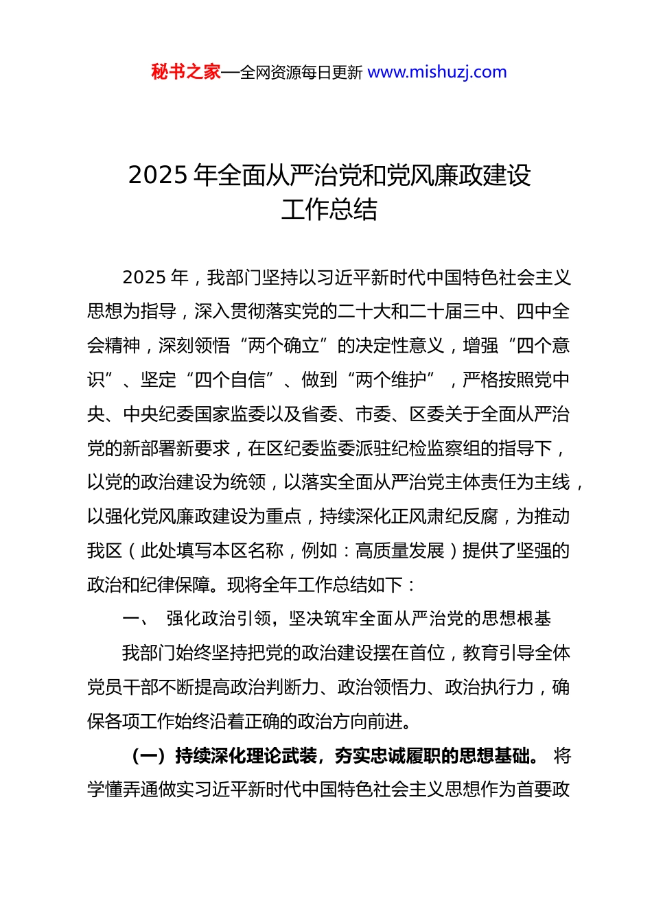 秘书之家—全网资源每日更新 www.mishuzj.com2025 年全面从严治党和党风廉政建设工作总结2025 年,我部门坚持以习近平新时代中国特色社会主义思想为指导,深入贯彻落实党的二十大和二十届三中、四中全会精神,深刻领悟“两个确立”的决定性意义,增强“四个意识”、坚定“四个自信”、做到“两个维护”,严格按照党中央、中央纪委国家监委以及省委、市委、区委关于全面从严治党的新部署新要求,在区纪委监委派驻纪检监察组的指导下,以党的政治建设为统领,以落实全面从严治党主体责任为主线,以强化党风廉政建设为重点,持续深化正风肃纪反腐,为推动我区(此处填写本区名称,例如:高质量发展)提供了坚强的政治和纪律保障。现将全年工作总结如下:一、 强化政治引领,坚决筑牢全面从严治党的思想根基我部门始终坚持把党的政治建设摆在首位,教育引导全体党员干部不断提高政治判断力、政治领悟力、政治执行力,确保各项工作始终沿着正确的政治方向前进。(一)持续深化理论武装,夯实忠诚履职的思想基础。 将学懂弄通做实习近平新时代中国特色社会主义思想作为首要政秘书之家—全网资源每日更新 www.mishuzj.com治任务,制定并严格执行年度理论学习计划。坚持党组(党委)会议“第一议题”制度,及时传达学习习近平总书记最新重要讲话和指示批示精神,特别是关于本领域本系统工作的重要论述,确保党中央决策部署不折不扣落到实处。全年组织党组(党委)理论学习中心组学习共 XX 次,专题研讨 XX 次,班子成员带头撰写心得体会、交流发言材料 XX 篇。各党支部依托“三会一课”、主题党日等载体,组织党员干部读原著、学原文、悟原理,开展形式多样的学习活动 XX 余场次,参与党员 XXX 人次。通过系统学习,引导全体党员干部深刻理解新时代党的创新理论的精神实质、核心要义、实践要求,自觉用以武装头脑、指导实践、推动工作,切实将学习成果转化为坚定理想信念、锤炼党性修养、忠诚履职尽责的实际行动。(二)严明政治纪律规矩,营造风清气正的政治生态。 始终把遵守党的政治纪律和政治规矩挺在前面,组织全体党员干部深入学习《中国共产党章程》《关于新形势下党内政治生活的若干准则》《中国共产党纪律处分条例》等党内法规,教育引导党员干部自觉在思想上政治上行动上同以习近平同志为核心的党中央保持高度一致。严格执行重大事项请示报告制度,部门重要工作、重大活动、重要人事任免、大额资金使用等事项均按规定及时向区委请示报告。坚决反对“七个有之”,切秘书之家—全网资源每日更新 www.mishuzj.com实做到“五个必须”,教育党员干部不得散布传播政治谣言,不得参与非法组织和活动,坚决同一切违背党的路线方针政策的言行作斗争。严肃党内政治生活,高质量召开年度民主生活会和组织生活会,认真开展批评与自我批评,达到了“团结—批评—团结”的目的,增强了党内政治生活的政治性、时代性、原则性、战斗性。(三)聚焦“国之大者”,强化政治监督保障执行。 紧紧围绕党中央重大决策部署和省委、市委、区委重点工作安排,特别是围绕(此处结合部门实际填写,例如:促进区域经济高质量发展、优化营商环境、保障和改善民生、防范化解重大风险等)重点任务,将政治监督融入日常、抓在经常。制定年度政治监督清单,明确监督重点、责任单位和完成时限。由部门机关纪委牵头,定期对各项重点任务推进情况开展专项督查,及时发现并纠正落实中的偏差、温差、落差问题。例如,在推进(具体项目或工作名称)过程中,我们紧盯责任落实、政策执行、工作作风等关键环节,开展嵌入式监督 XX 次,发现并督促整改问题 XX 个,确保政令畅通、令行禁止,以强有力的政治监督保障党中央及上级决策部署在我部门落地生根、开花结果。二、压紧压实责任,着力构建齐抓共管的工作格局秘书之家—全网资源每日更新 www.mishuzj.com我部门牢固树立“抓好党建是最大政绩”的理念,坚持把全面从严治党主体责任牢牢扛在肩上、抓在手上,层层传导压力,确保责任落实到位。(一)健全责任体系,明确职责任务分工。年初,部门党组(党委)专题研究制定《2025 年度全面从严治党和...