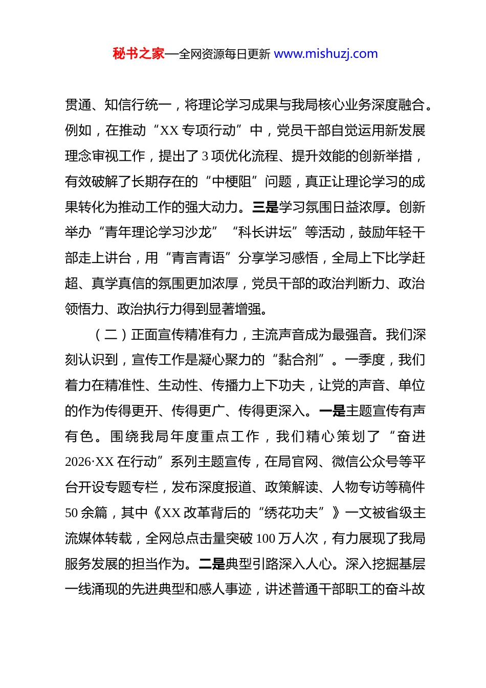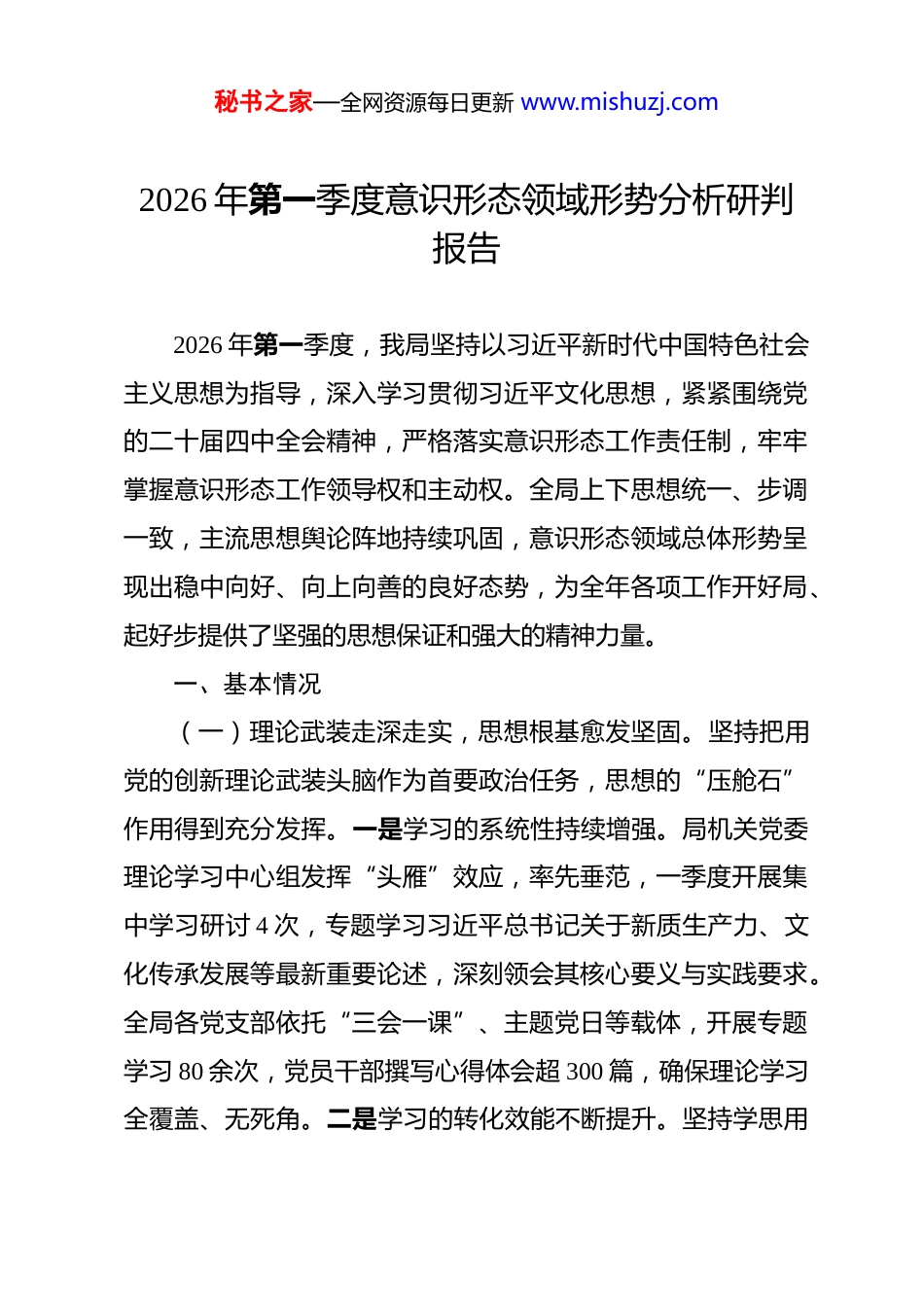 秘书之家—全网资源每日更新 www.mishuzj.com2026 年第一季度意识形态领域形势分析研判报告 2026 年第一季度,我局坚持以习近平新时代中国特色社会主义思想为指导,深入学习贯彻习近平文化思想,紧紧围绕党的二十届四中全会精神,严格落实意识形态工作责任制,牢牢掌握意识形态工作领导权和主动权。全局上下思想统一、步调一致,主流思想舆论阵地持续巩固,意识形态领域总体形势呈现出稳中向好、向上向善的良好态势,为全年各项工作开好局、起好步提供了坚强的思想保证和强大的精神力量。一、基本情况(一)理论武装走深走实,思想根基愈发坚固。坚持把用党的创新理论武装头脑作为首要政治任务,思想的“压舱石”作用得到充分发挥。一是学习的系统性持续增强。局机关党委理论学习中心组发挥“头雁”效应,率先垂范,一季度开展集中学习研讨 4 次,专题学习习近平总书记关于新质生产力、文化传承发展等最新重要论述,深刻领会其核心要义与实践要求。全局各党支部依托“三会一课”、主题党日等载体,开展专题学习 80 余次,党员干部撰写心得体会超 300 篇,确保理论学习全覆盖、无死角。二是学习的转化效能不断提升。坚持学思用秘书之家—全网资源每日更新 www.mishuzj.com贯通、知信行统一,将理论学习成果与我局核心业务深度融合。例如,在推动“XX 专项行动”中,党员干部自觉运用新发展理念审视工作,提出了 3 项优化流程、提升效能的创新举措,有效破解了长期存在的“中梗阻”问题,真正让理论学习的成果转化为推动工作的强大动力。三是学习氛围日益浓厚。创新举办“青年理论学习沙龙”“科长讲坛”等活动,鼓励年轻干部走上讲台,用“青言青语”分享学习感悟,全局上下比学赶超、真学真信的氛围更加浓厚,党员干部的政治判断力、政治领悟力、政治执行力得到显著增强。(二)正面宣传精准有力,主流声音成为最强音。我们深刻认识到,宣传工作是凝心聚力的“黏合剂”。一季度,我们着力在精准性、生动性、传播力上下功夫,让党的声音、单位的作为传得更开、传得更广、传得更深入。一是主题宣传有声有 色 。 围 绕 我 局 年 度 重 点 工 作 , 我 们 精 心 策 划 了 “ 奋 进2026·XX 在行动”系列主题宣传,在局官网、微信公众号等平台开设专题专栏,发布深度报道、政策解读、人物专访等稿件50 余篇,其中《XX 改革背后的“绣花功夫”》一文被省级主流媒体转载,全网总点击量突破 100 万人次,有力展现了我局服务发展的担当作为。二是典型引路深入人心。深入挖掘基层一线涌现的先进典型和感人事迹,讲述普通干部职工的奋斗故秘书之家—全网资源每日更新 www.mishuzj.com事。通过拍摄《初心·坚守》系列短视频,展现了“岗位标兵”**同志十年如一日扎根基层、服务群众的朴实形象。视频在内外部平台发布后,引发强烈共鸣,累计收到点赞评论超 5 万条,干部职工纷纷表示要向榜样看齐,在平凡岗位上创造不凡业绩。三是舆论引导及时有效。建立健全信息发布和舆情应对机制,针对社会关注的 XX 热点问题,第一时间通过官方渠道发布权威信息,组织专家进行通俗化解读,有效澄清了误解、回应了关切,牢牢把握了舆论引导的主动权。(三)阵地管理严密有效,安全防线不断筑牢。始终绷紧意识形态安全这根弦,坚持守土有责、守土负责、守土尽责,确保各类意识形态阵地可管可控。一是网络阵地管控到位。严格落实网络意识形态工作责任制,对局官方网站、新媒体账号实行“三审三校”制度,一季度共发布信息 200 余条,未发生任何内容安全问题。同时,加强对干部职工网络行为的教育引导,定期开展网络安全和保密知识培训,确保网络空间清朗有序。二是内部阵地把关严格。加强对局内部报告会、研讨会、讲座、论坛等活动的审批和管理,明确要求凡是涉及意识形态议题的活动,必须事先向局党委报备审批。一季度共审批各类内部活动 15 场,均做到主题鲜明、导向正确。三是责任体系压紧压实。年初,局主要领导与各处室、各单位负责人签订了秘书之家—全网资源每日更新 www.mishuzj.com《2026 年度意识形态工作责任书》,将意识形态工作纳入年度绩效...