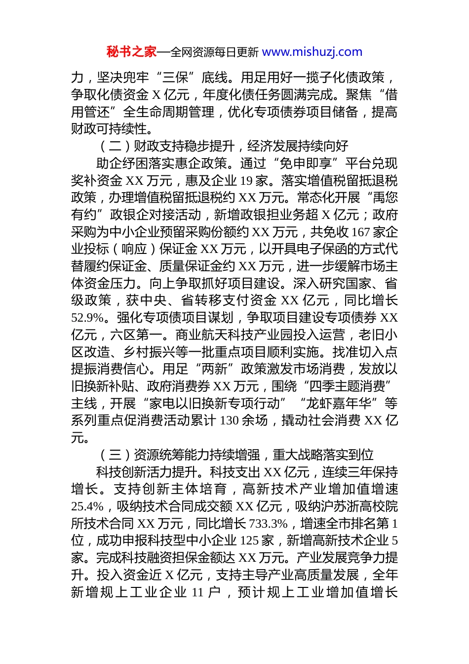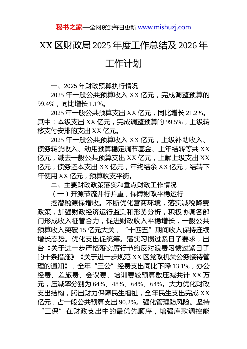 秘书之家—全网资源每日更新 www.mishuzj.comXX 区财政局 2025 年度工作总结及 2026 年工作计划一、2025 年财政预算执行情况2025 年一般公共预算收入 XX 亿元,完成调整预算的99.4%,同比增长 1.1%。2025 年一般公共预算支出 XX 亿元,同比增长 21.2%。其中:本级支出 XX 亿元,完成调整预算的 99.5%,上级转移支付安排的支出 XX 亿元。2025 年一般公共预算收入 XX 亿元,上级补助收入、债务转贷收入、动用预算稳定调节基金、上年结转等共 XX亿元,减去一般公共预算支出 XX 亿元,上解上级支出 XX亿元,债务还本支出 XX 亿元,年终结余 XX 亿元,结转下年使用 XX 亿元,预算收支平衡。二、主要财政政策落实和重点财政工作情况(一)开源节流并行并重,保障财政平稳运行挖潜税源保增收。不断优化营商环境,落实减税降费政策,加强财政经济运行监测和形势分析,积极协调各部门形成收入征管合力,促进财政收入平稳增长,一般公共预算收入突破 15 亿元大关,“十四五”期间收入保持连续增长态势。优化支出促统筹。落实习惯过紧日子要求,出台《关于进一步严格落实厉行节约反对浪费习惯过紧日子的十条措施》《关于进一步规范 XX 区党政机关公务接待管理的通知》,全年“三公”经费支出同比下降 13.1%,办公经费、差旅费、会议费、培训费较预算数压减共计 XX 万元,压减率分别为 64%、48%、64%、64%。大力优化财政支出结构,腾出财力保障民生福祉,全年民生支出完成 XX亿元,占一般公共预算支出 90.2%。强化管理防风险。坚持“三保”在财政支出中的最优先顺序,增强库款调控能秘书之家—全网资源每日更新 www.mishuzj.com力,坚决兜牢“三保”底线。用足用好一揽子化债政策,争取化债资金 X 亿元,年度化债任务圆满完成。聚焦“借用管还”全生命周期管理,优化专项债券项目储备,提高财政可持续性。(二)财政支持稳步提升,经济发展持续向好助企纾困落实惠企政策。通过“免申即享”平台兑现奖补资金 XX 万元,惠及企业 19 家。落实增值税留抵退税政策,办理增值税留抵退税约 XX 万元。常态化开展“禹您有约”政银企对接活动,新增政银担业务超 X 亿元;政府采购为中小企业预留采购份额约 XX 万元,共免收 167 家企业投标(响应)保证金 XX 万元,以开具电子保函的方式代替履约保证金、质量保证金约 XX 万元,进一步缓解市场主体资金压力。向上争取抓好项目建设。深入研究国家、省级政策,获中央、省转移支付资金 XX 亿元,同比增长52.9%。强化专项债项目谋划,争取项目建设专项债券 XX亿元,六区第一。商业航天科技产业园投入运营,老旧小区改造、乡村振兴等一批重点项目顺利实施。找准切入点提振消费信心。用足“两新”政策激发市场消费,发放以旧换新补贴、政府消费券 XX 万元,围绕“四季主题消费”主线,开展“家电以旧换新专项行动”“龙虾嘉年华”等系列重点促消费活动累计 130 余场,撬动社会消费 XX 亿元。(三)资源统筹能力持续增强,重大战略落实到位科技创新活力提升。科技支出 XX 亿元,连续三年保持增长。支持创新主体培育,高新技术产业增加值增速25.4%,吸纳技术合同成交额 XX 亿元,吸纳沪苏浙高校院所技术合同 XX 万元,同比增长 733.3%,增速全市排名第 1位,成功申报科技型中小企业 125 家,新增高新技术企业 5家。完成科技融资担保金额达 XX 万元。产业发展竞争力提升。投入资金近 X 亿元,支持主导产业高质量发展,全年新 增 规 上 工 业 企 业 11 户 , 预 计 规 上 工 业 增 加 值 增 长秘书之家—全网资源每日更新 www.mishuzj.com12.2%。累计组建基金 23 支,总规模约 XX 亿元,通过基金甄选优质项目,已落户九州云箭、凌空天行、深蓝航天、星河动力等 18 家企业,投资金额 XX 亿元,撬动资金 XX亿元。乡村振兴驱动力提升。农林水支出 XX 亿元,同比增长 17.3%。支持推进乡村发展和建设,落地广德等 8 个省级中心村项目,沿淮糯稻产业集群二期项目进展顺利,石榴老旧果园提升改造项目获省级批复,接续实施 1 万亩高标准农田建...